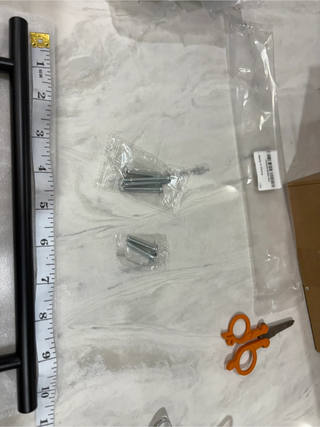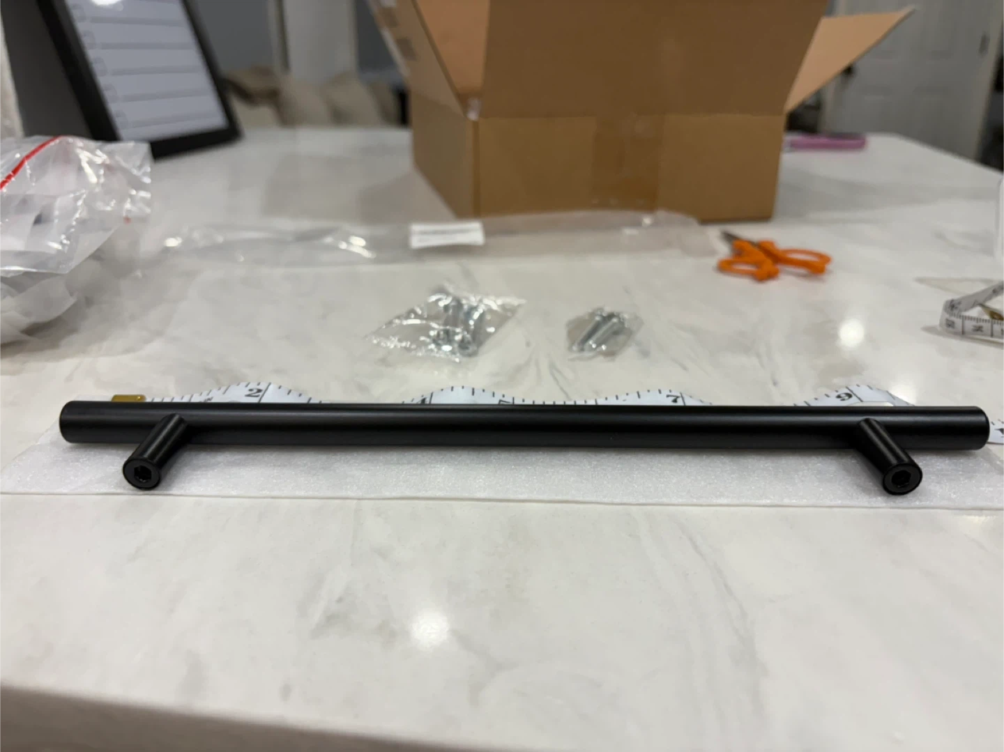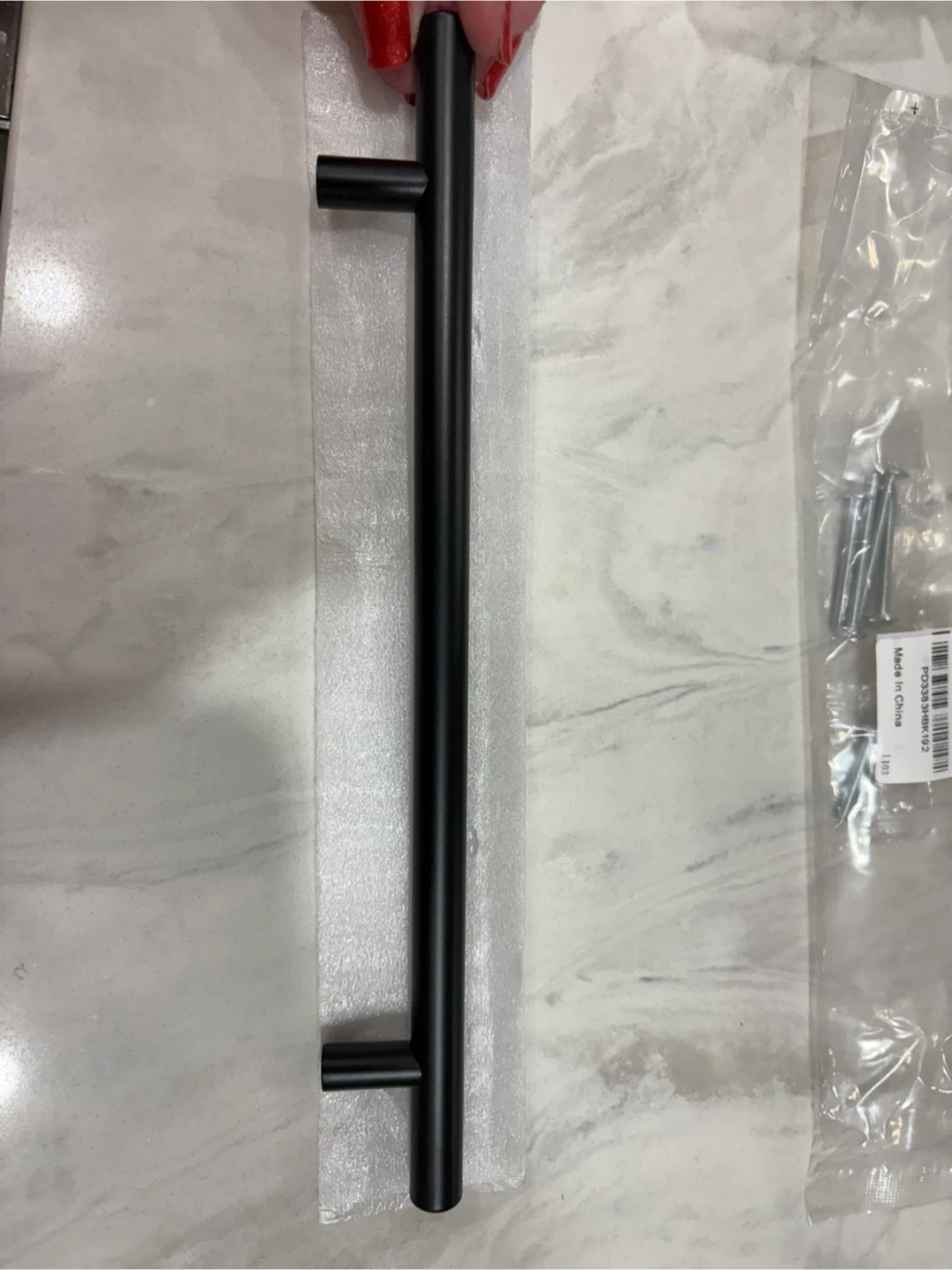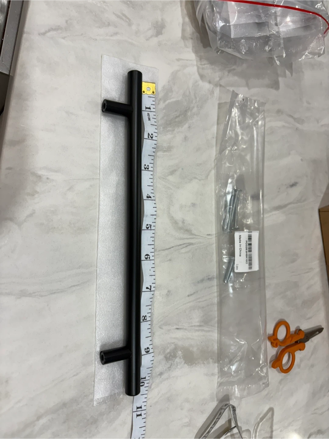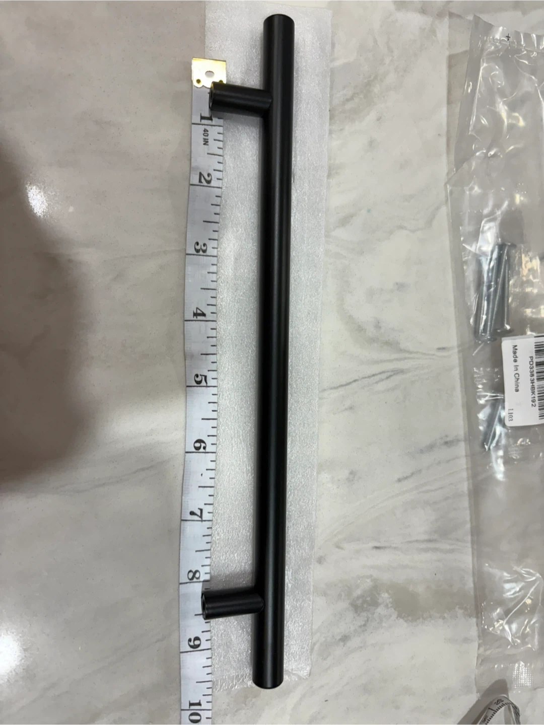 Selling a matte black cabinet pull handle. It measures 10 inches in length and comes with the necessary screws for installation. Perfect for upgrading your cabinets or drawers!