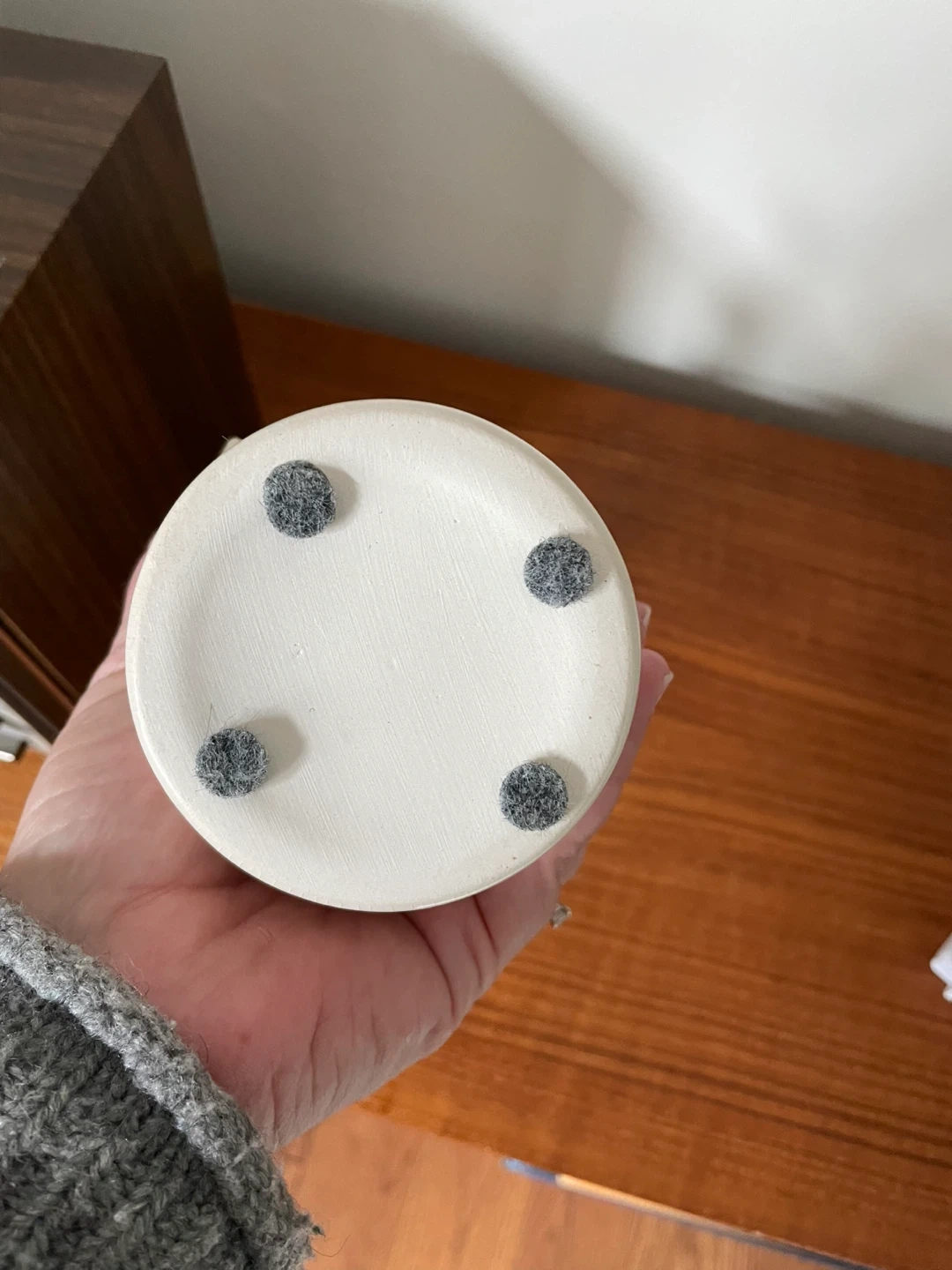 A cream ceramic vase with a crackle glaze finish and a decorative rim. It has four felt pads on the bottom to protect surfaces. This vase is suitable for holding fresh or dried flowers.