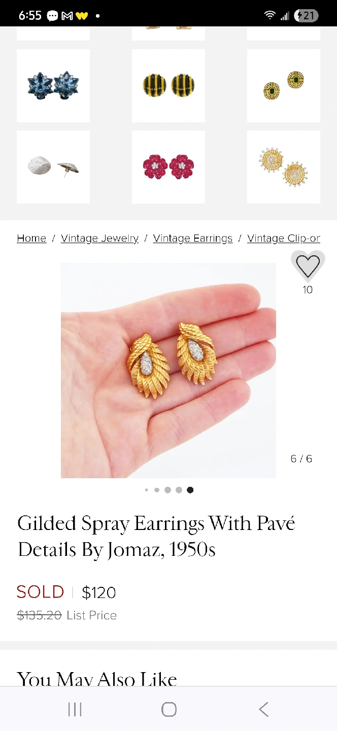 Selling a pair of vintage Jomaz gilded spray earrings with pavé details from the 1950s. They are clip-on style and have a beautiful, classic design. Originally listed for $135.20!