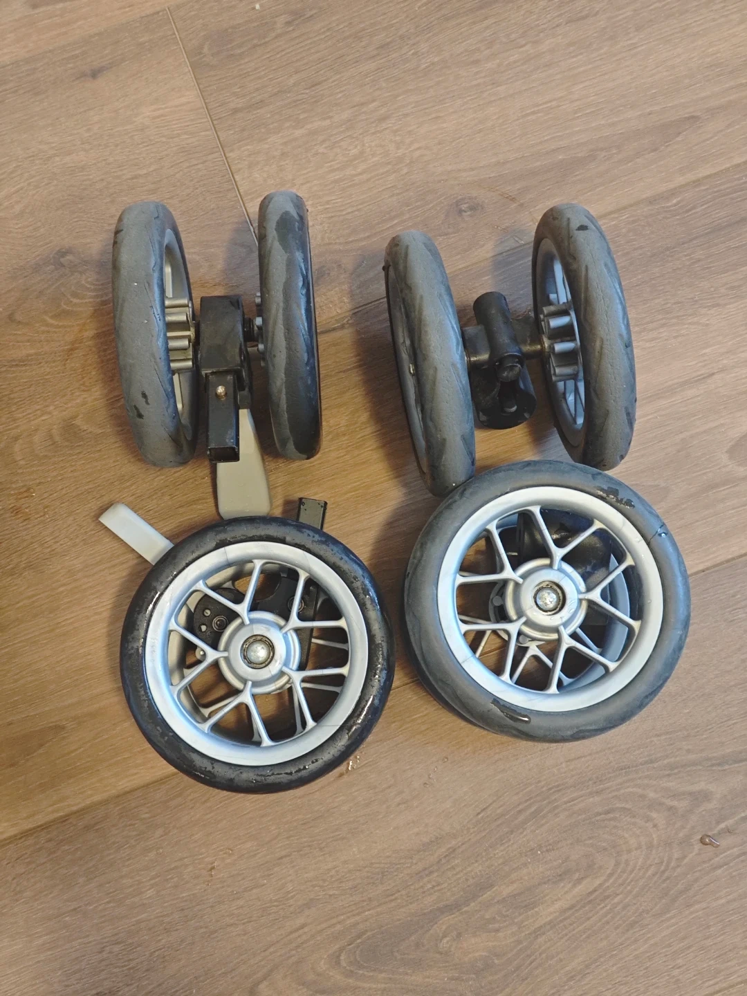 Replacement set of stroller wheels. Includes two larger rear wheels and two smaller front wheels.