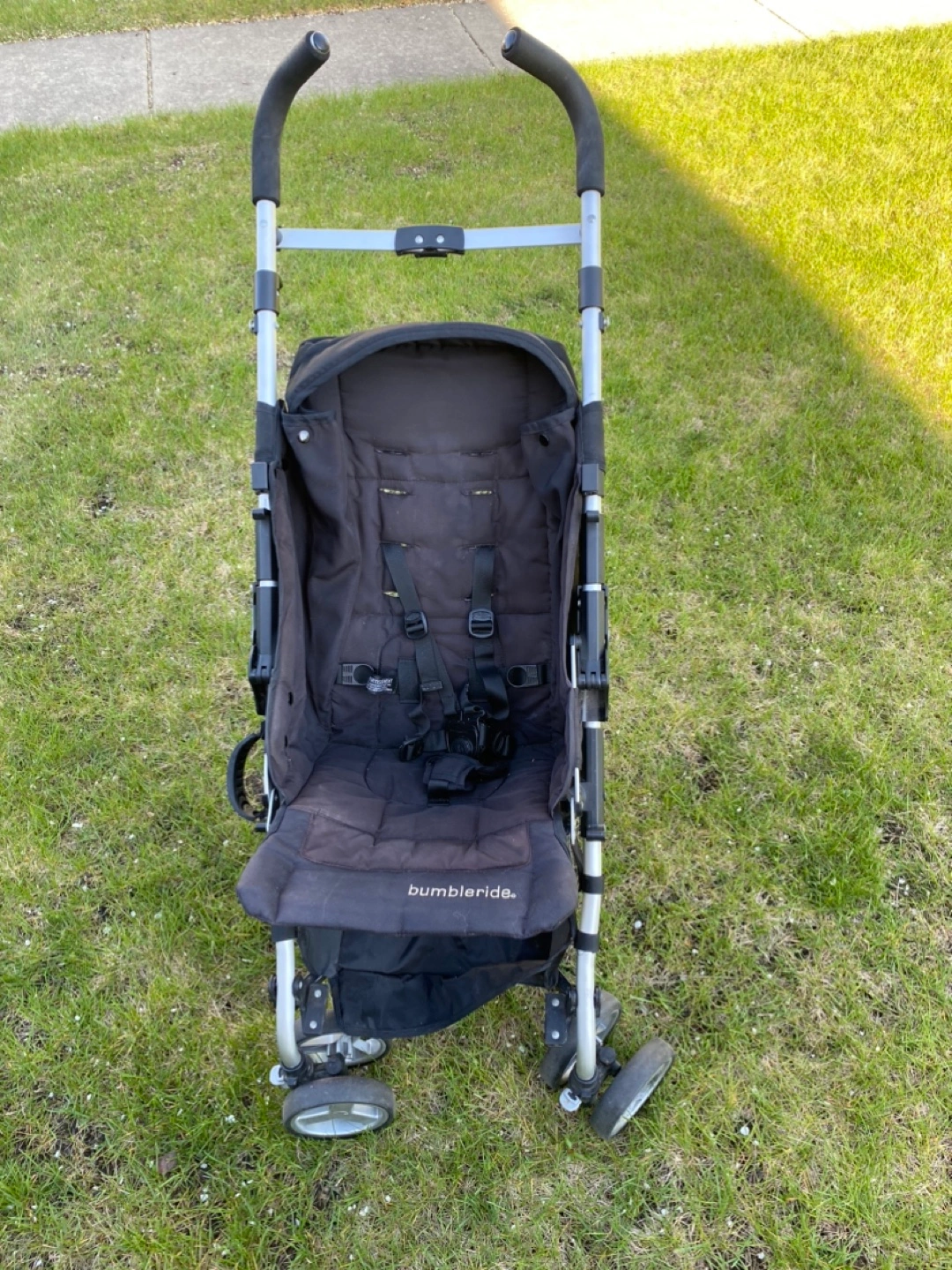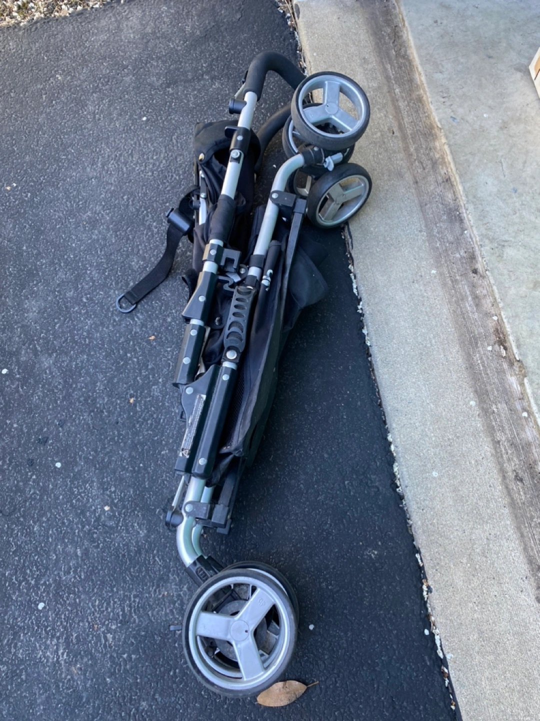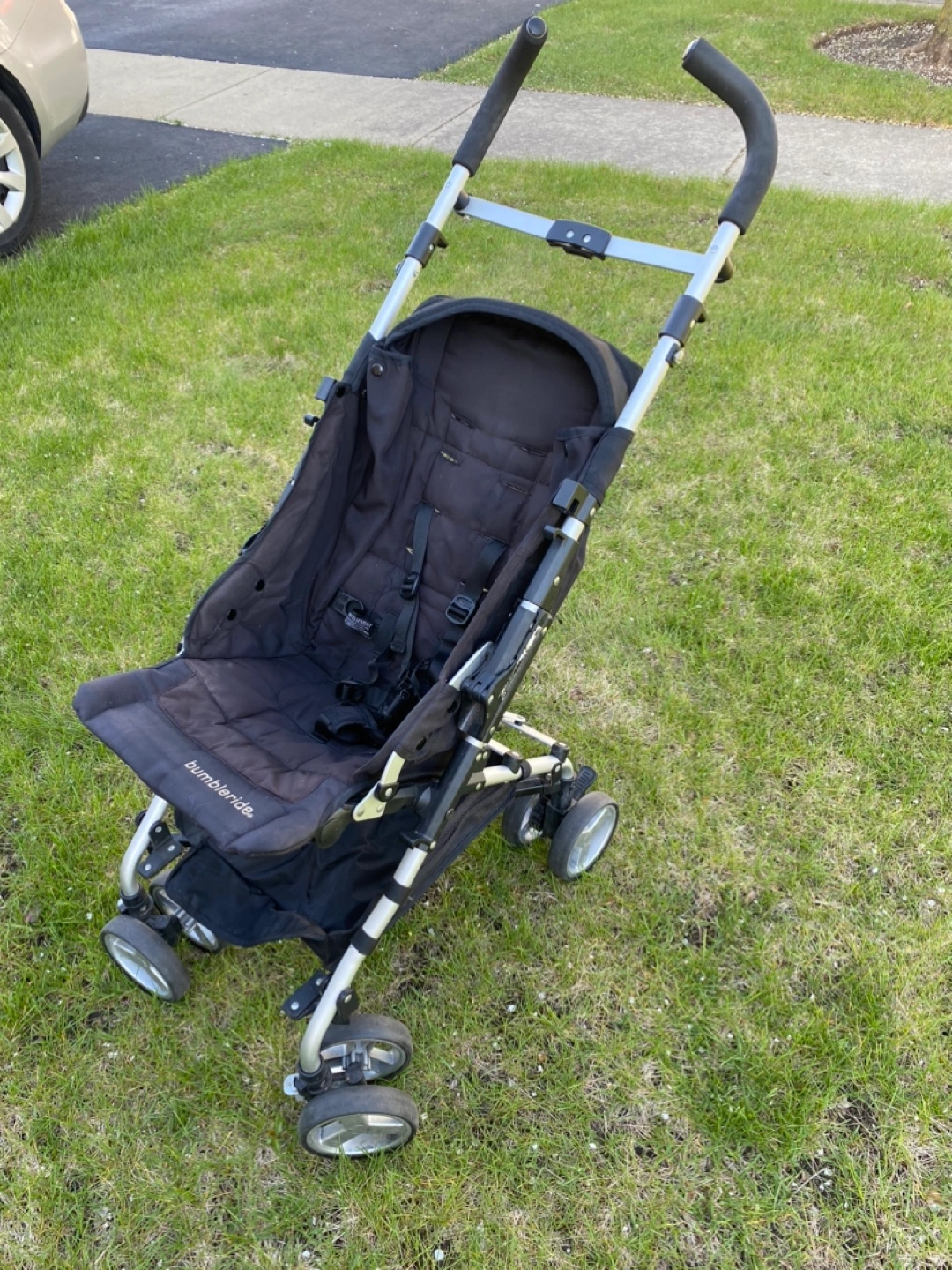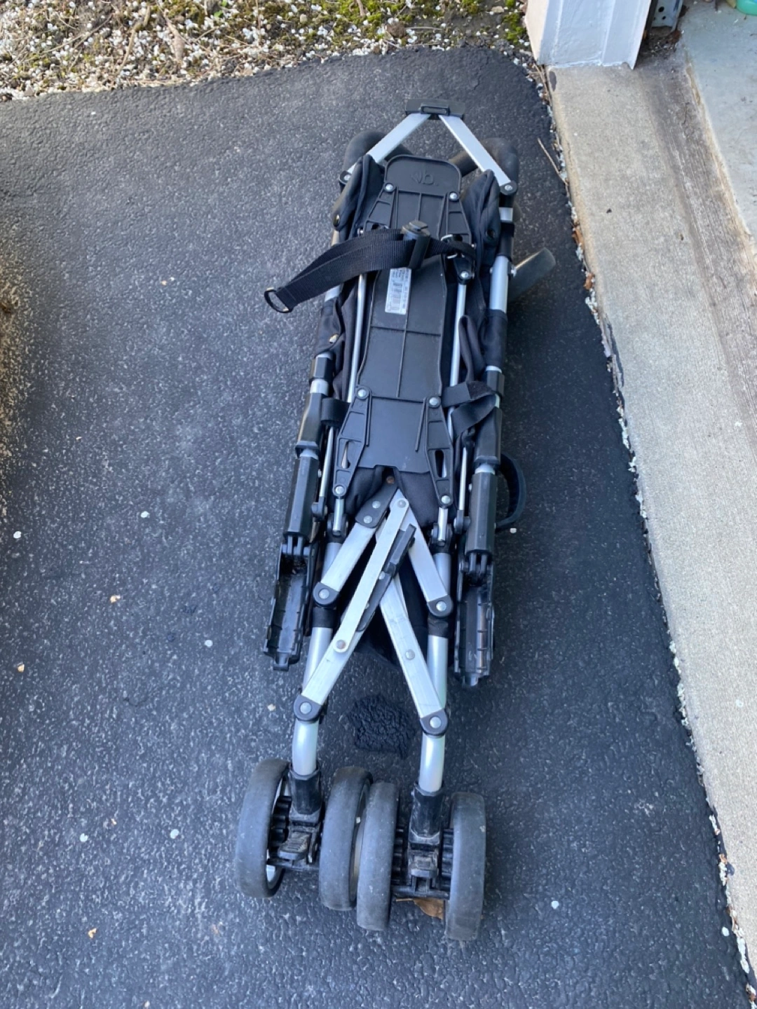 Lightweight stroller, easy to fold and carry. Black fabric, silver frame. Perfect for a day at the zoo or weekend at grandma & grandpa’s house. Just cleaned with blue dawn dish soap. Light wear and tear.