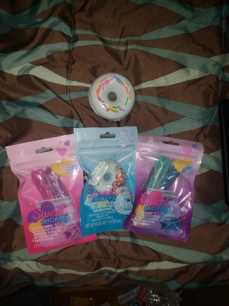 This set includes one reusable donut bath bomb and two packages of rock candy bath salt sticks. The bath bomb is scented with mint cherry. Each package of bath salt sticks contains two sticks.