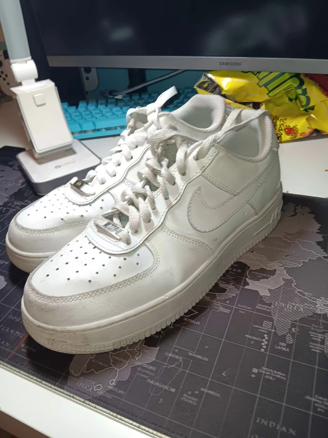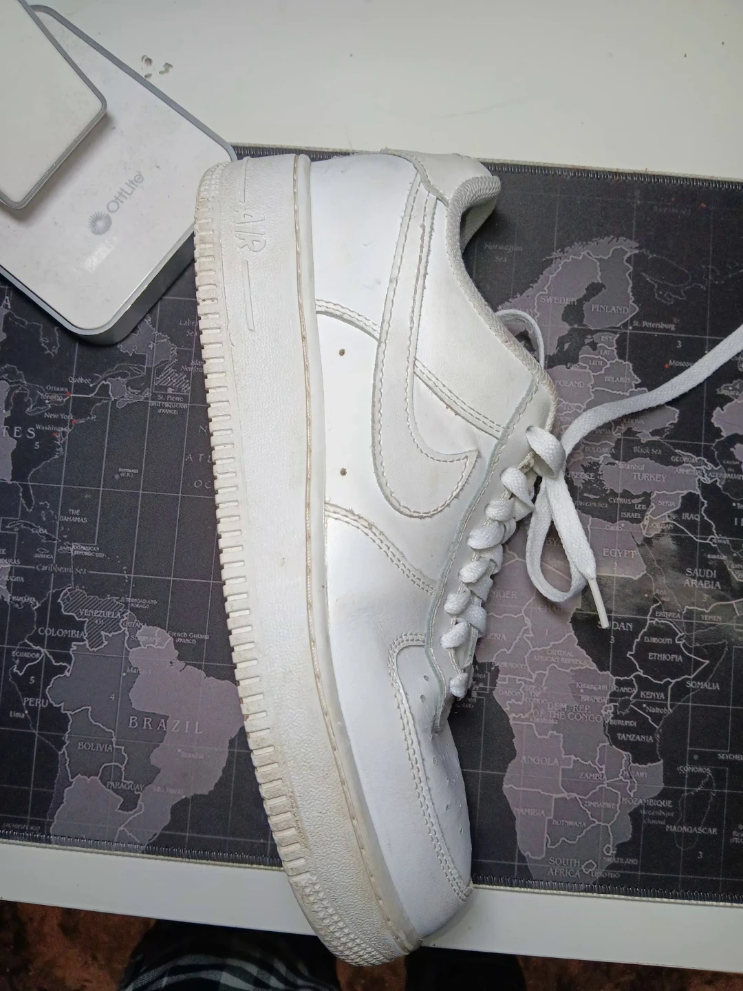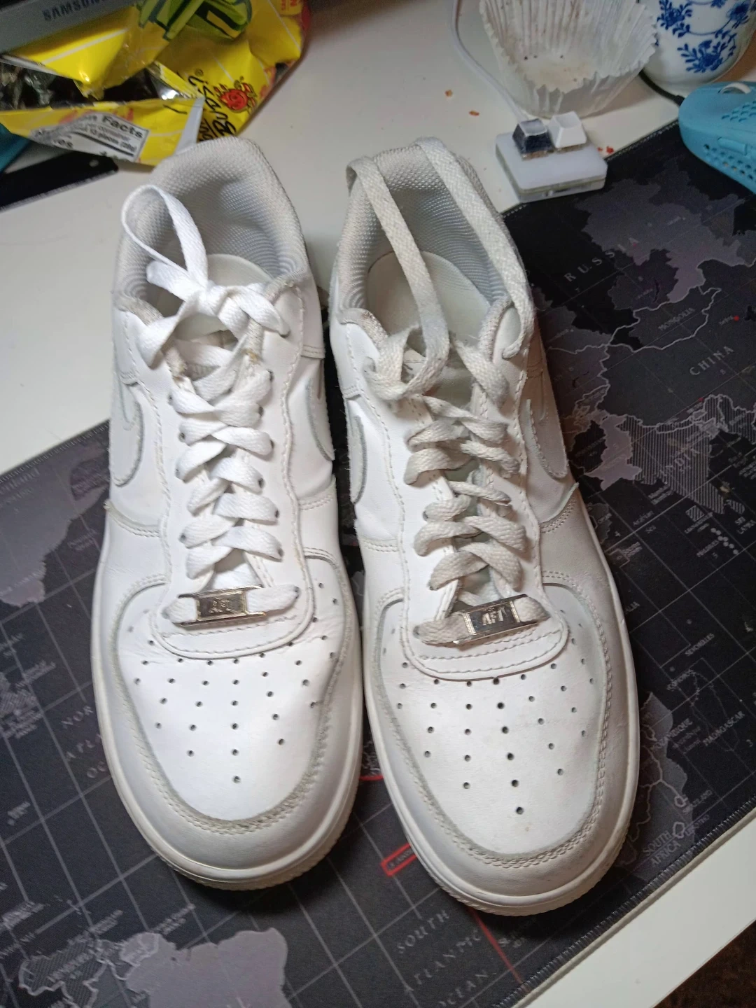 Classic white Nike Air Force 1 sneakers. Leather upper with lace-up closure. Rubber sole.
