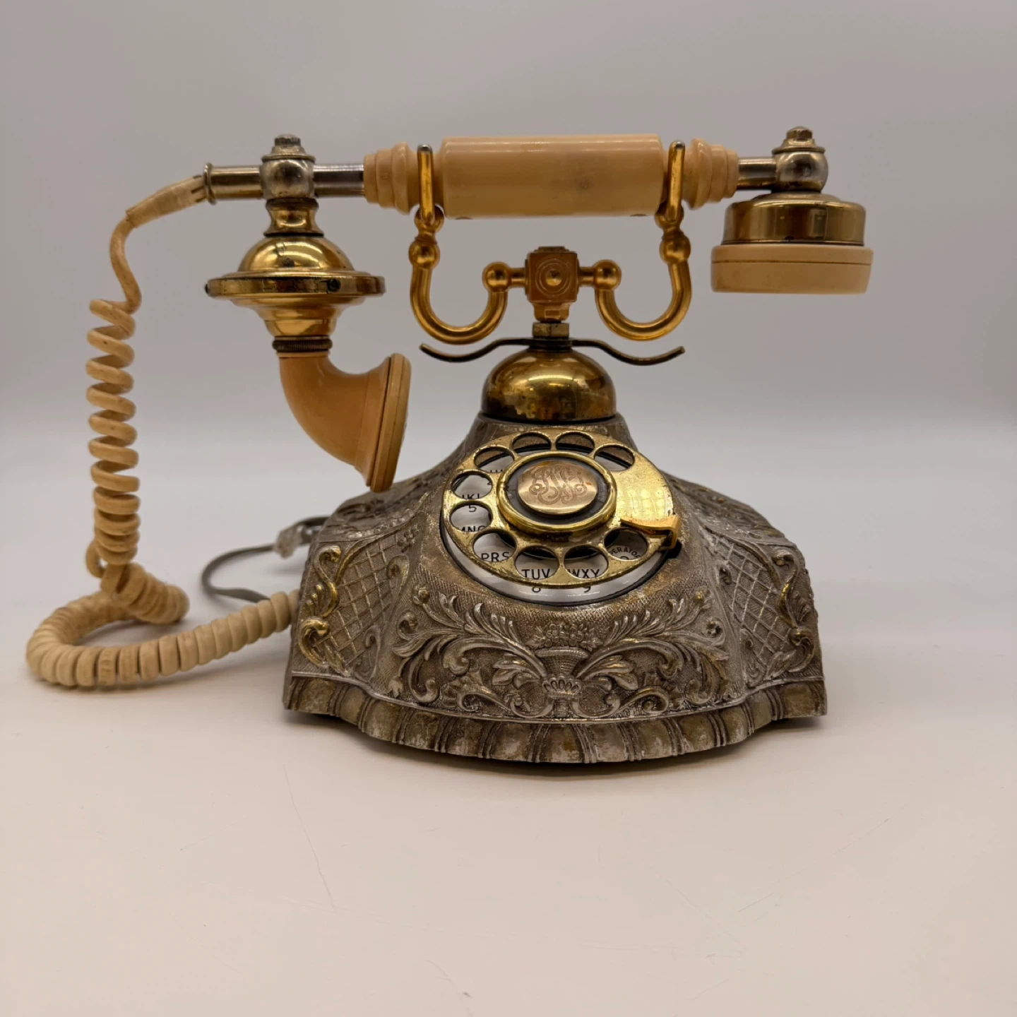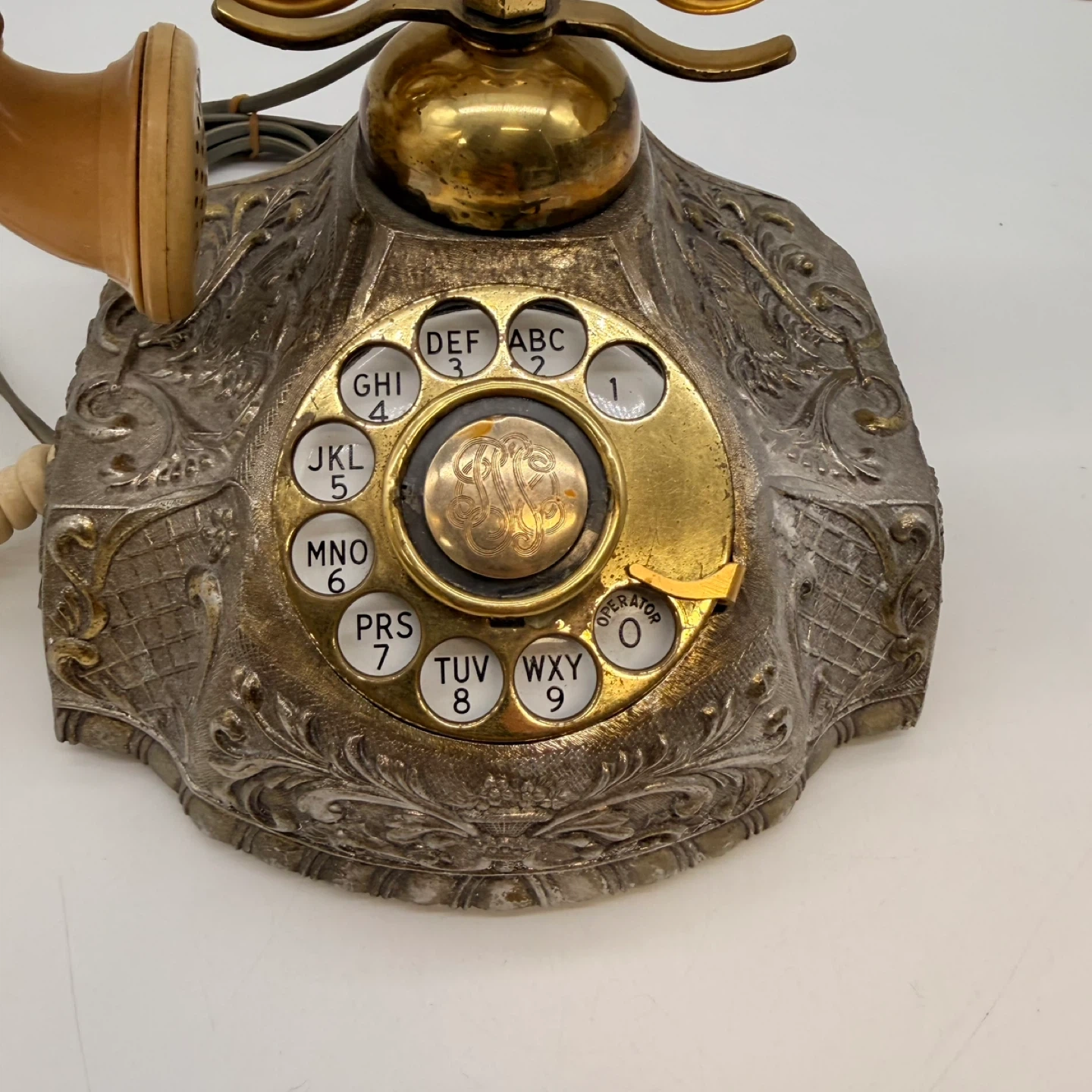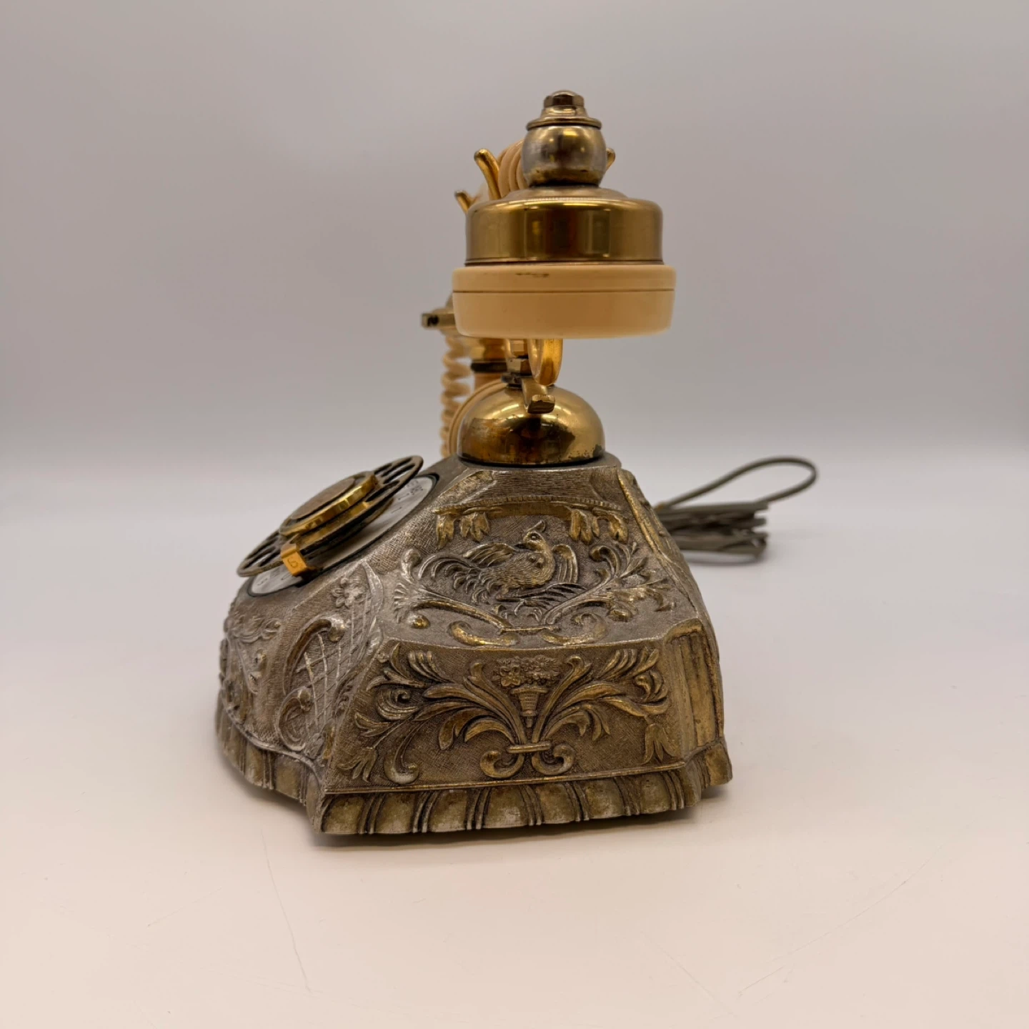 Beautiful vintage-style Hollywood Regency rotary dial telephone with ornate gold and bronze detailing. Heavy decorative base with classic old-fashion design.