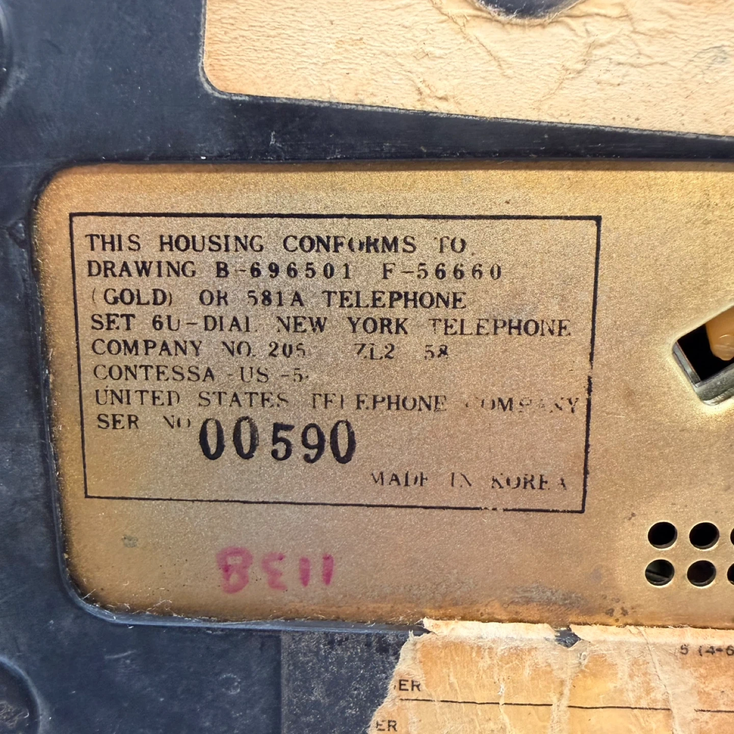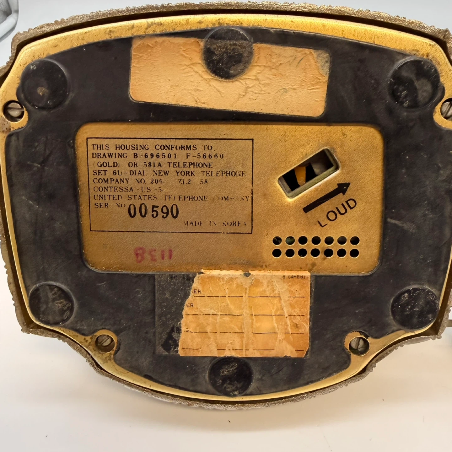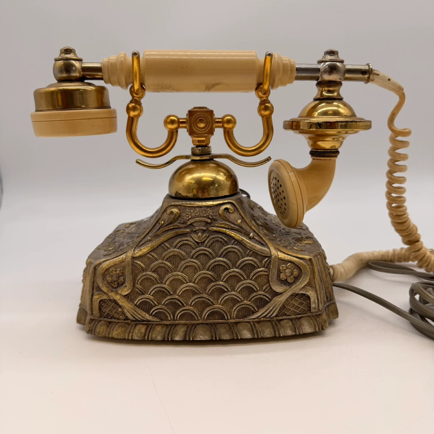 Beautiful vintage-style Hollywood Regency rotary dial telephone with ornate gold and bronze detailing. Heavy decorative base with classic old-fashion design.