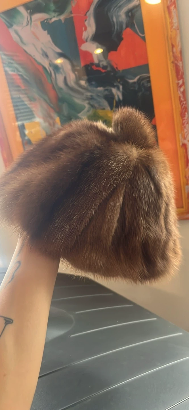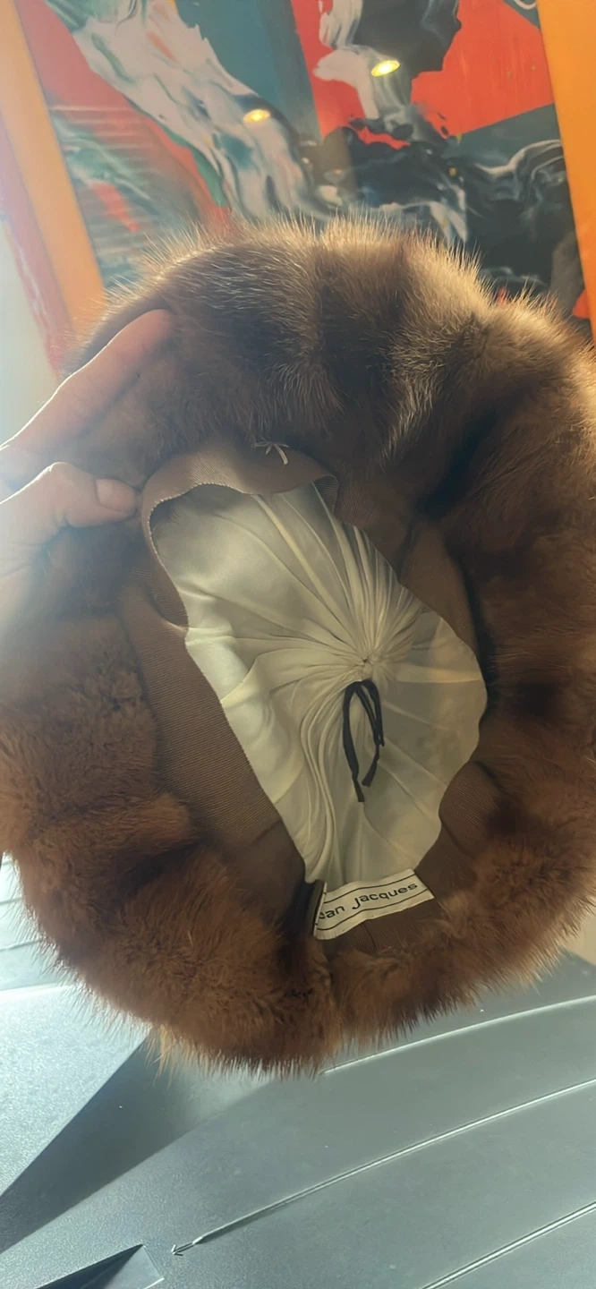 This is a genuine mink fur hat from Jean Jacques. It features a soft, luxurious brown fur exterior and a satin lining. The hat has a distinctive gathered crown detail.