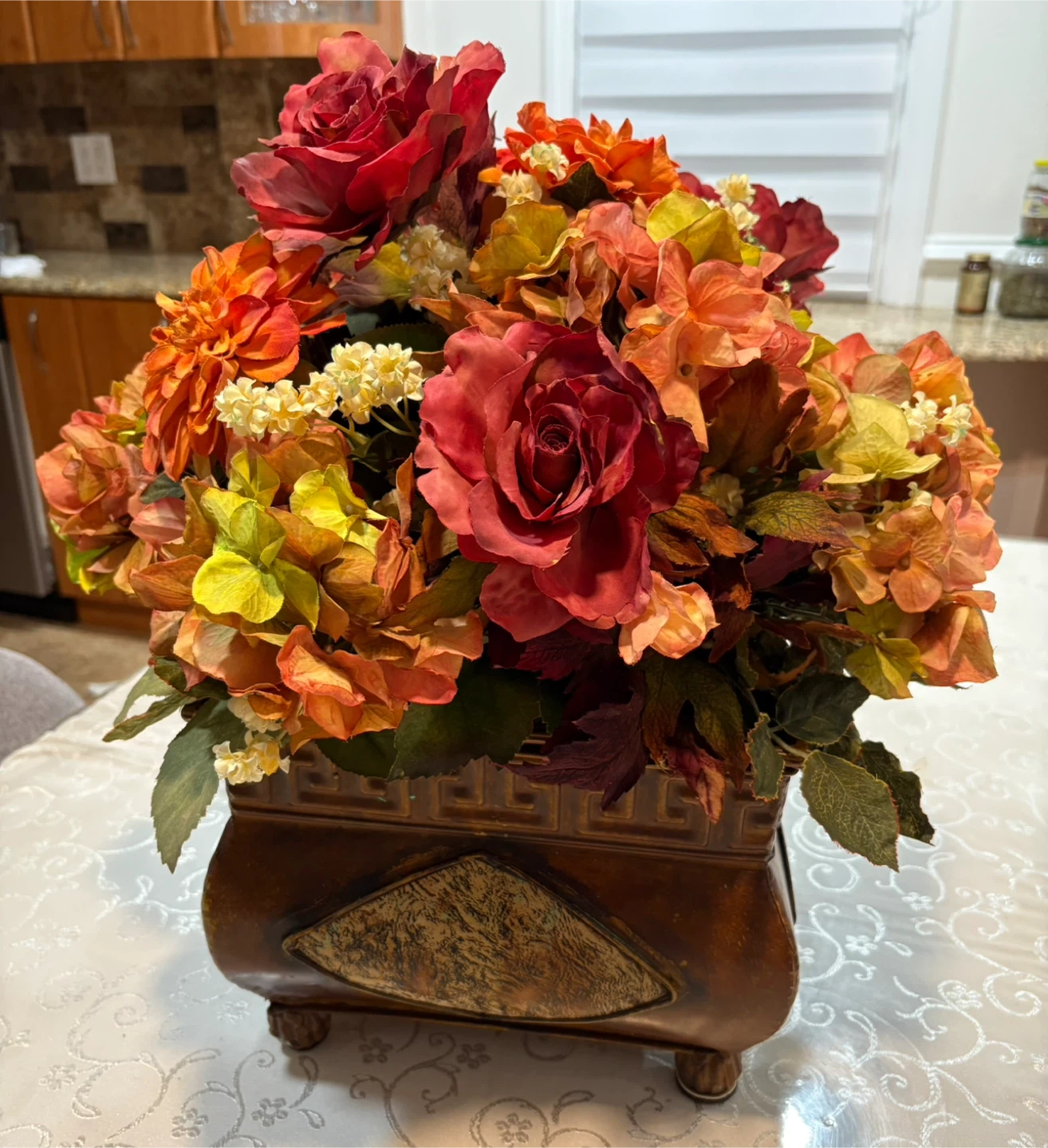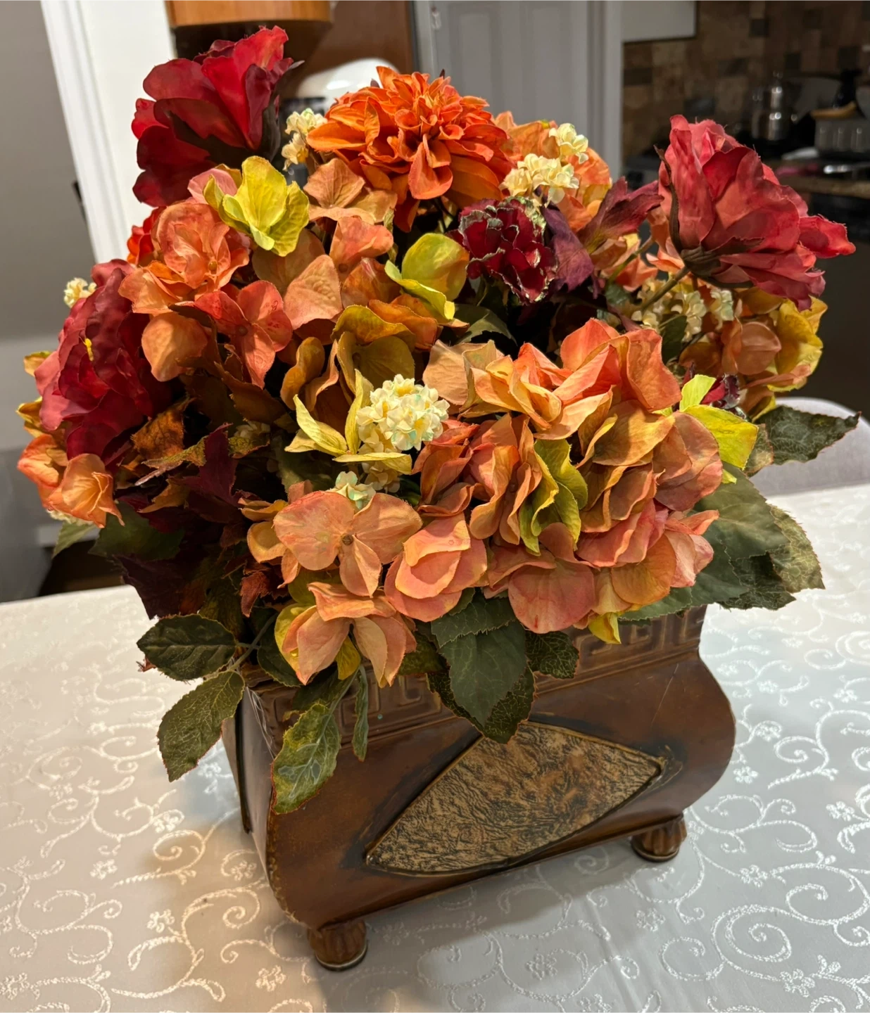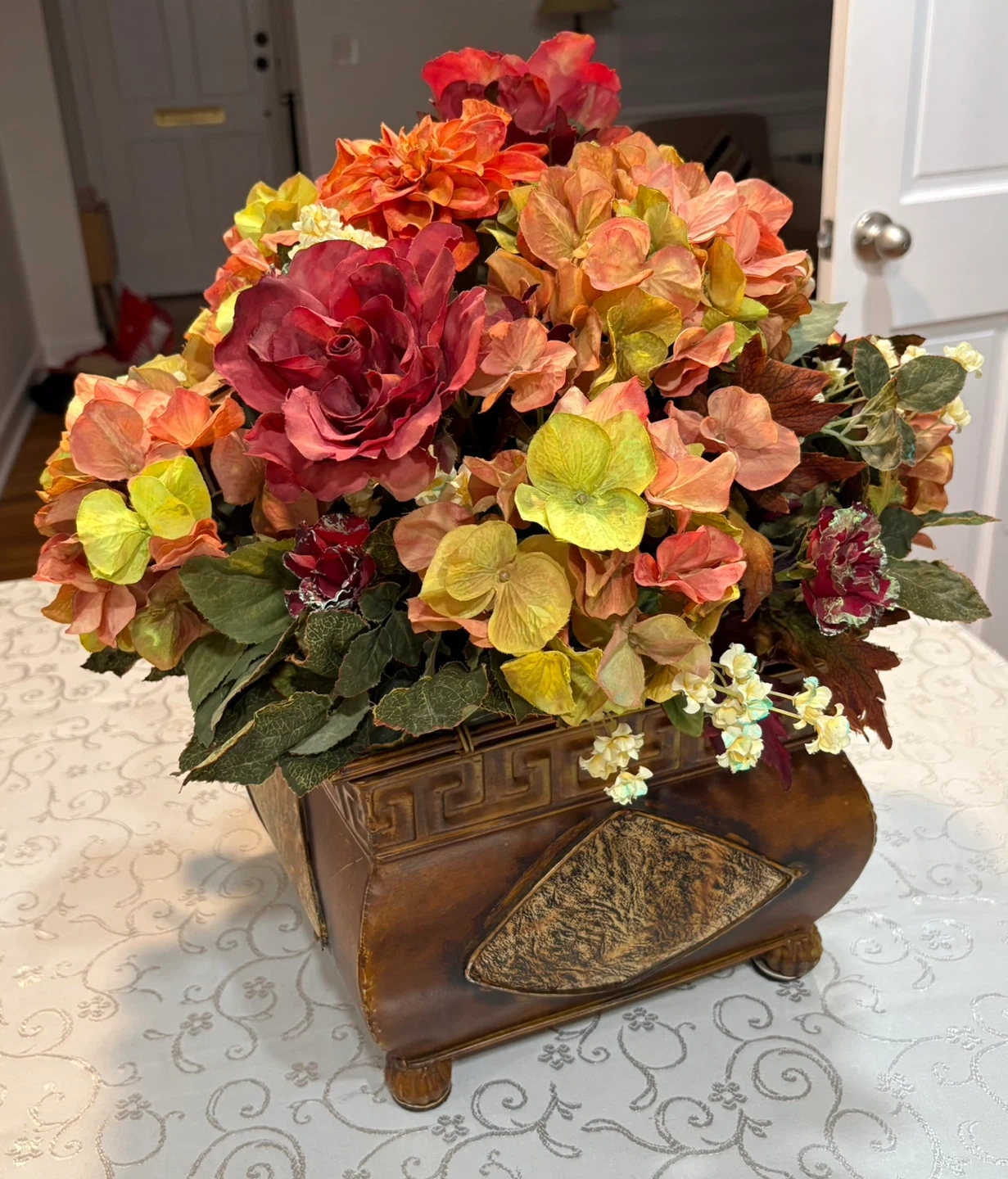 This Large vibrant artificial floral arrangement showcases a mix of roses, hydrangeas, and dahlia-like blooms in autumnal hues. It's set in a decorative bronze-toned pot with embossed detailing and a Greek key pattern. This piece adds a touch of lasting color to any room!