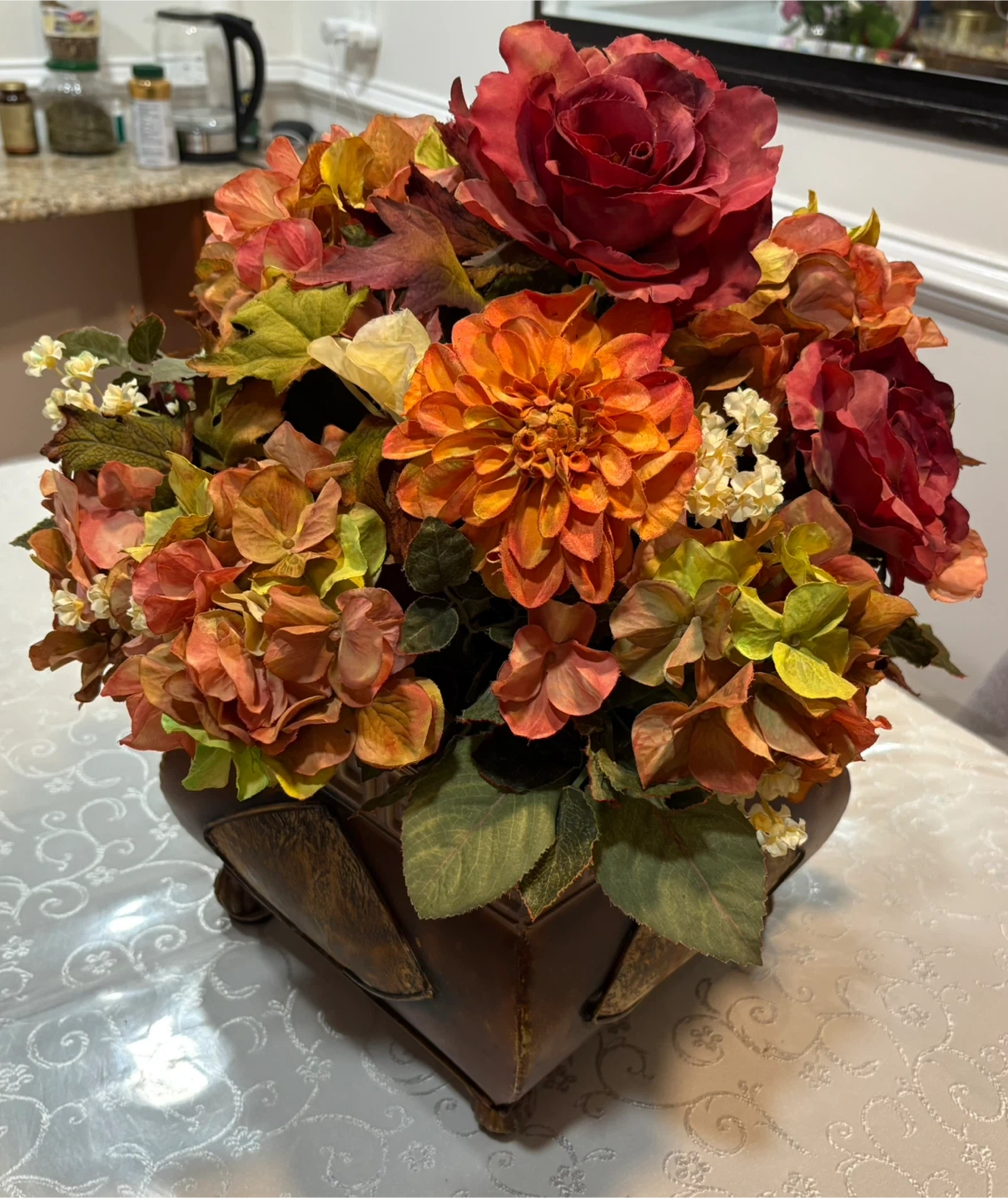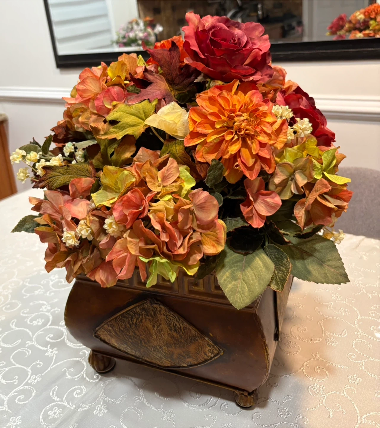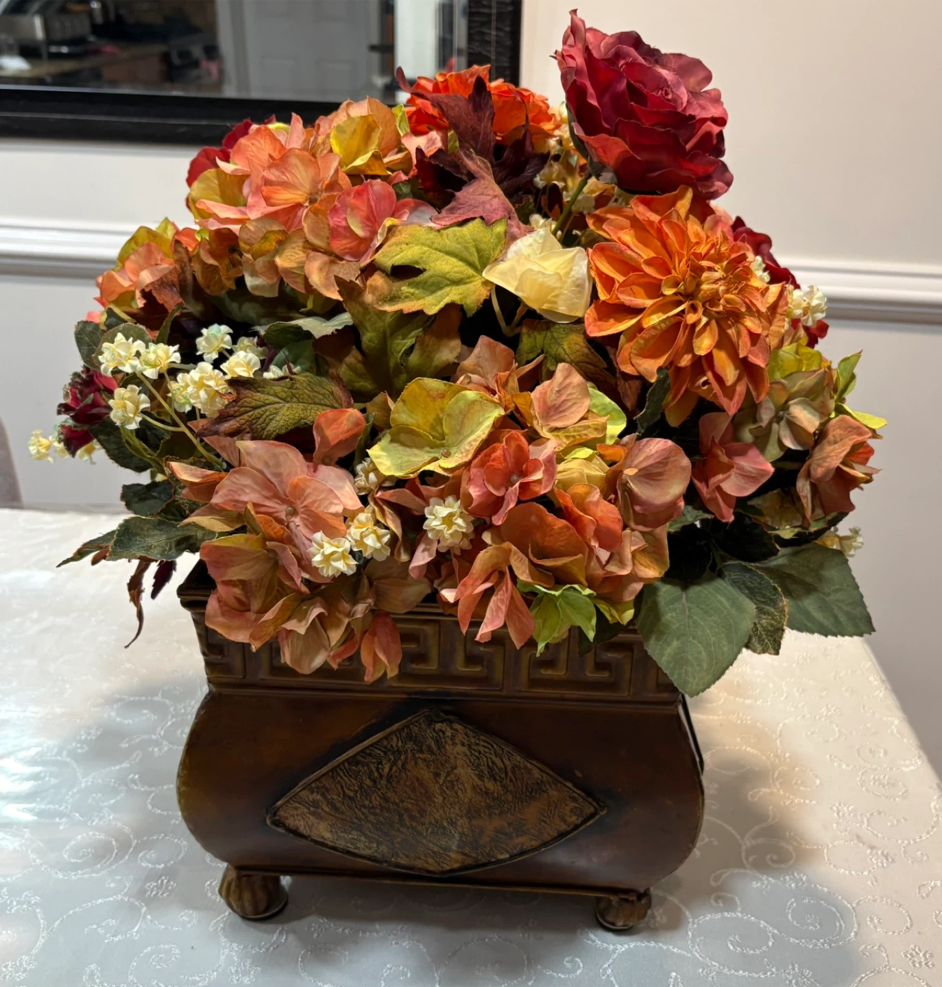 This Large vibrant artificial floral arrangement showcases a mix of roses, hydrangeas, and dahlia-like blooms in autumnal hues. It's set in a decorative bronze-toned pot with embossed detailing and a Greek key pattern. This piece adds a touch of lasting color to any room!