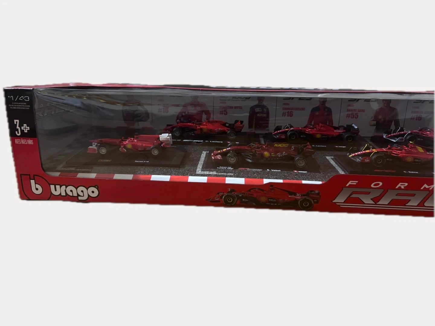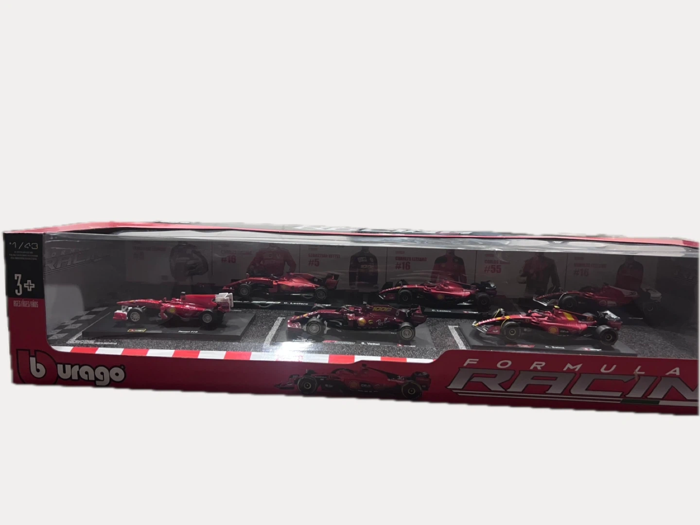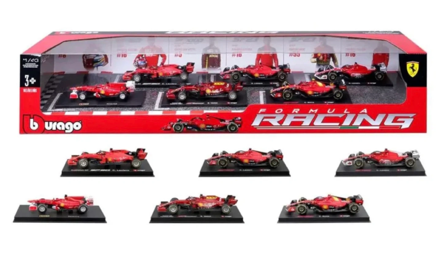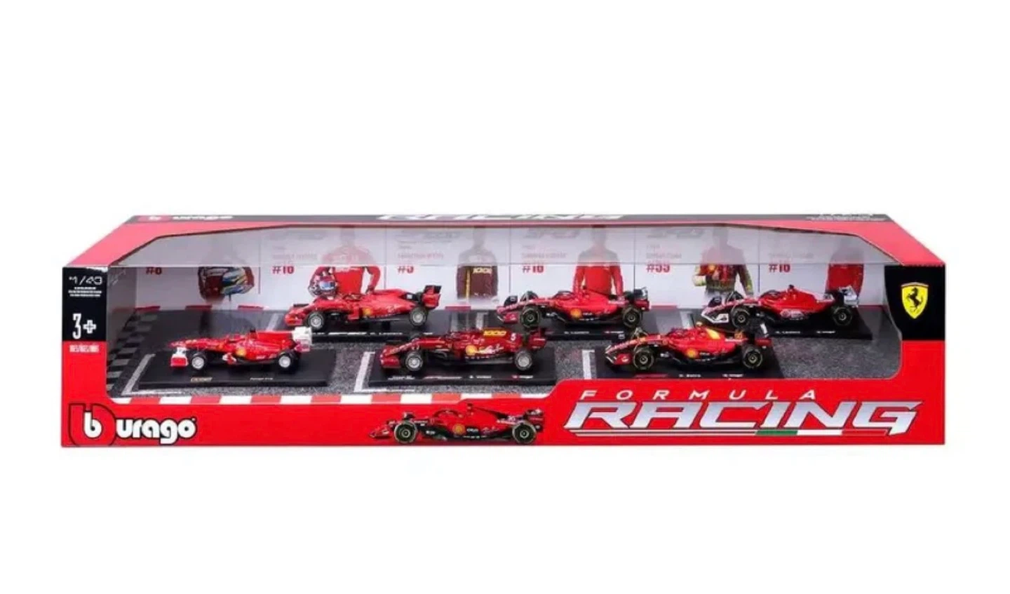 This set includes multiple Bburago Formula 1:43 scale diecast model cars. The cars are red and feature detailed designs. It's recommended for ages 3 and up.