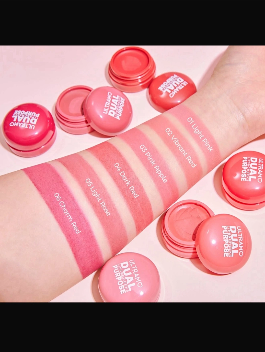 Check out these Ultramo Dual Purpose lip and cheek stains! They come in a variety of shades, including Light Pink, Vibrant Red, Pink Apple, Dark Red, Light Rose, and Charm Red. Perfect for adding a pop of color to your look
