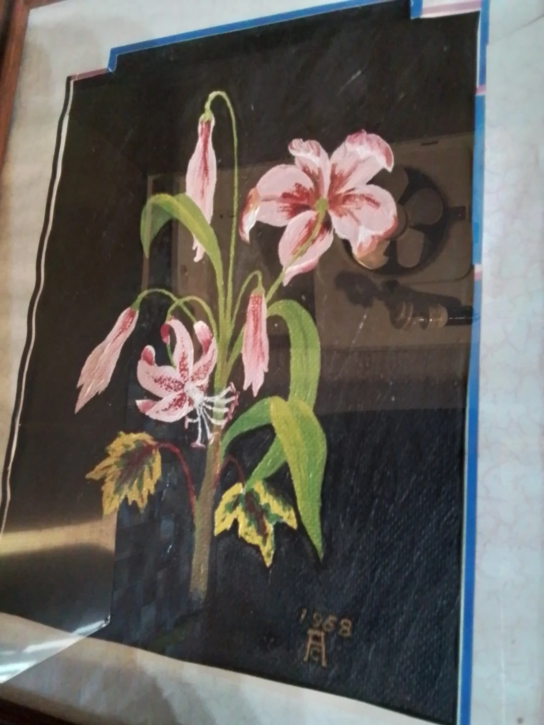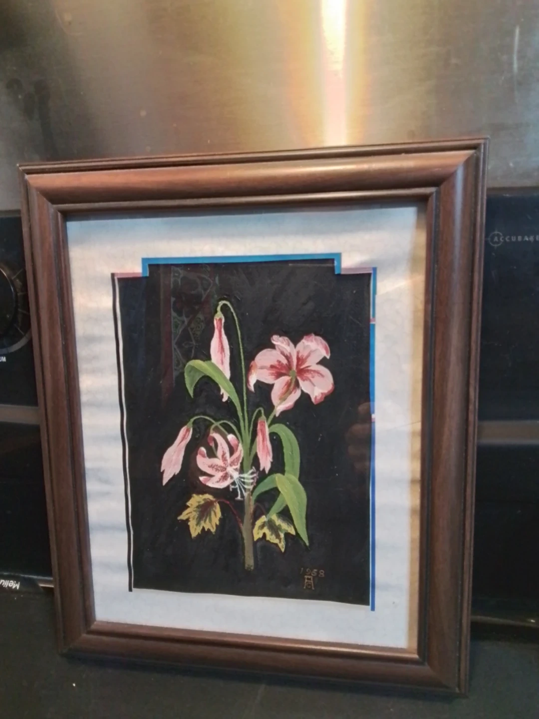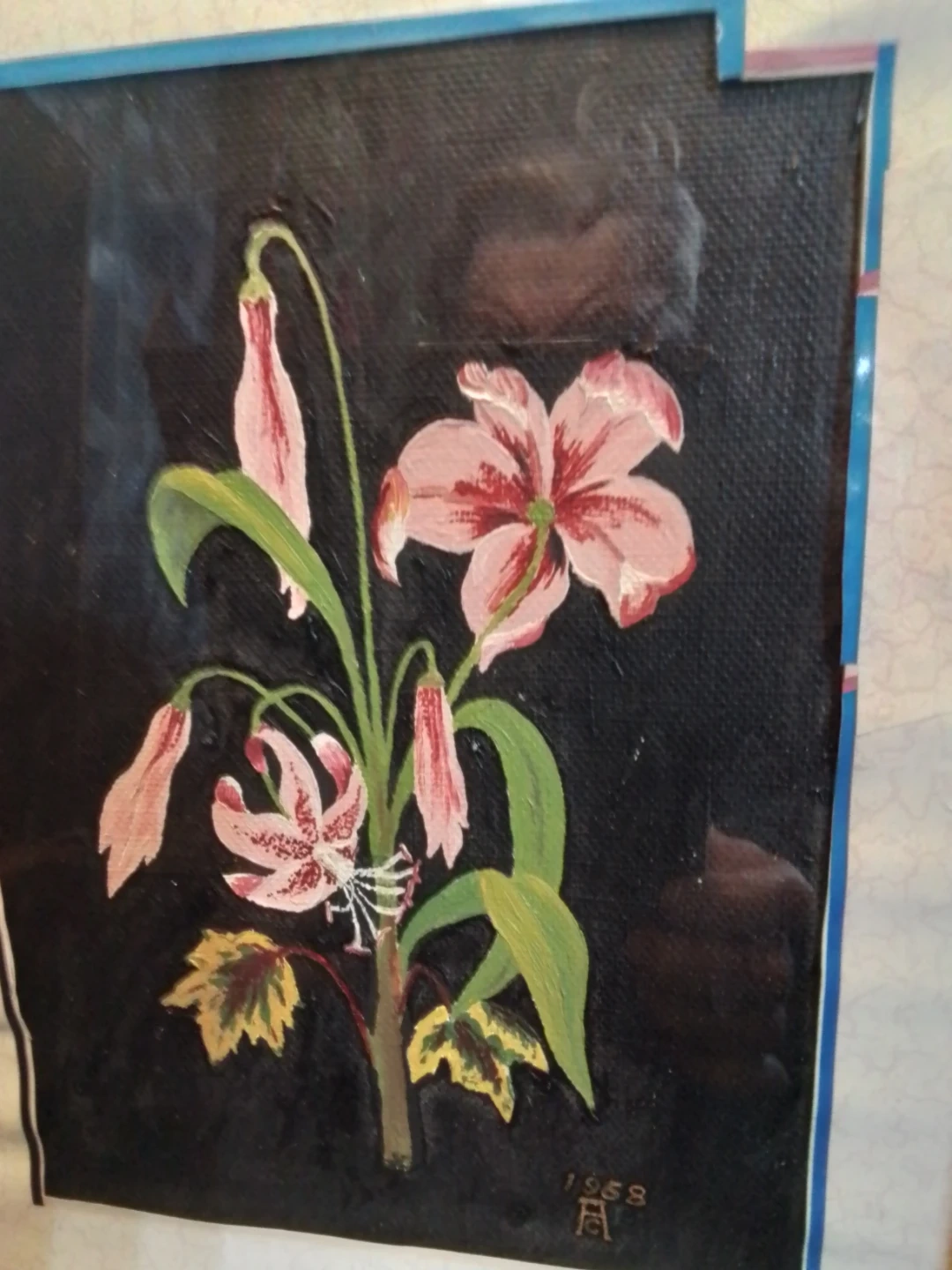 This is a framed painting depicting pink lilies on a dark background. The artwork is signed and dated 1958. It's housed in a simple wooden frame.