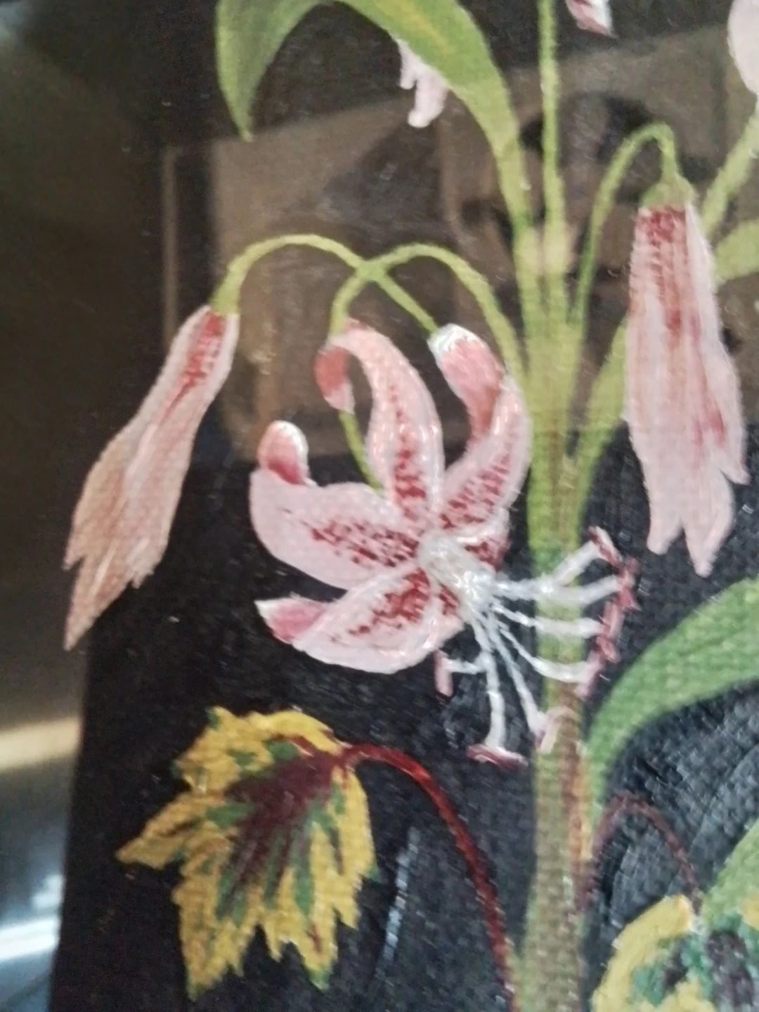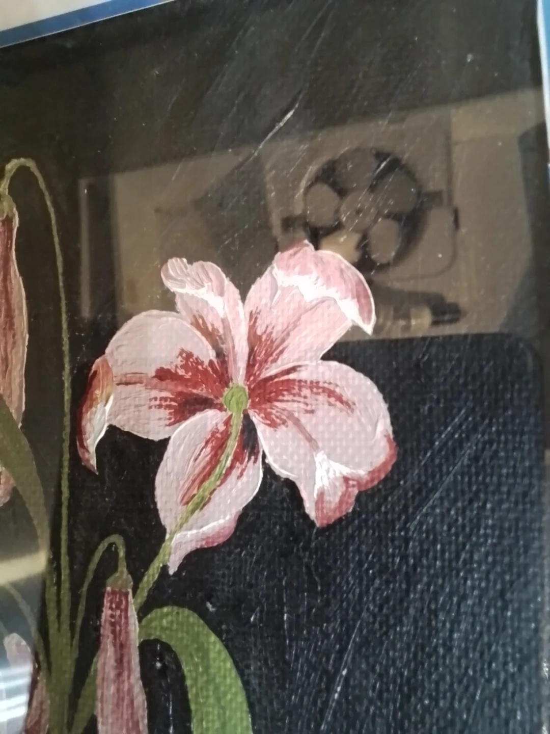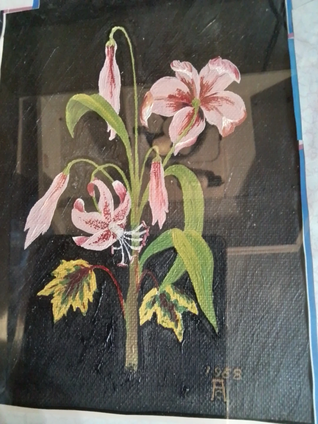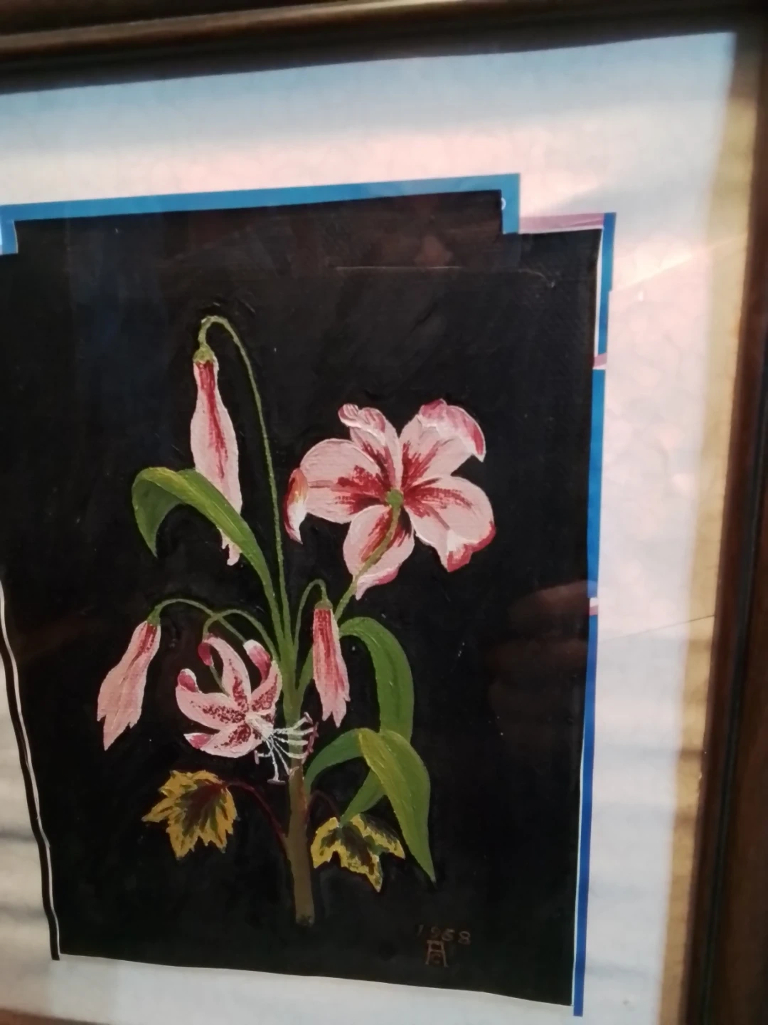 This is a framed painting depicting pink lilies on a dark background. The artwork is signed and dated 1958. It's housed in a simple wooden frame.