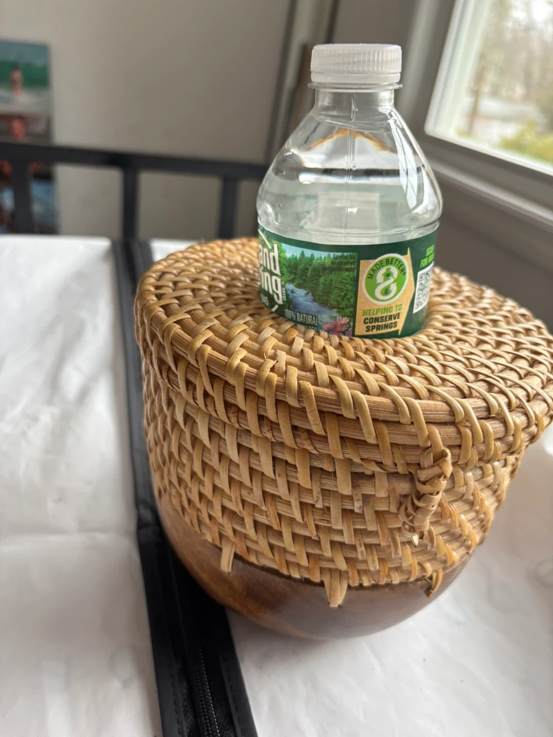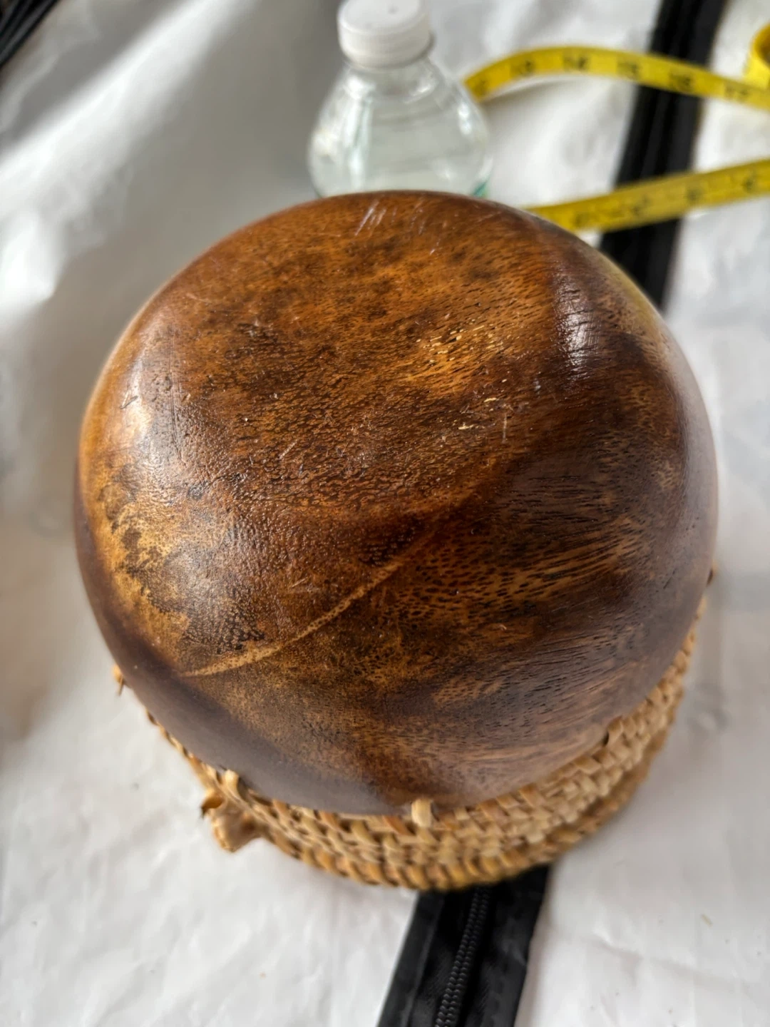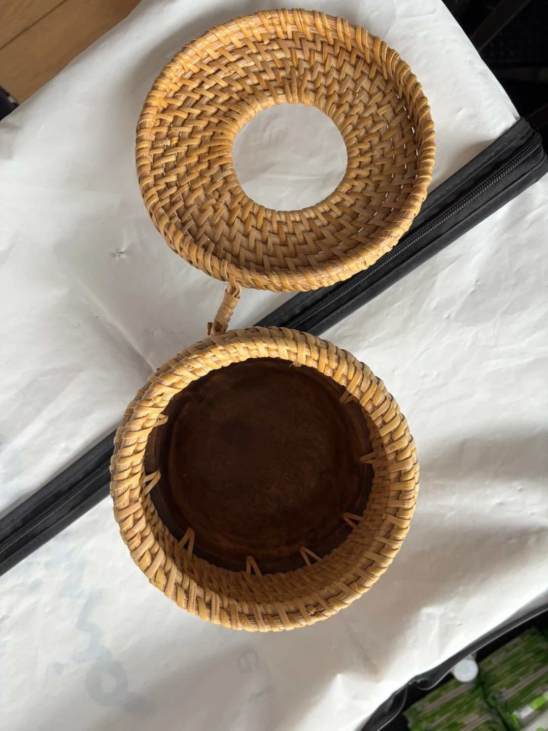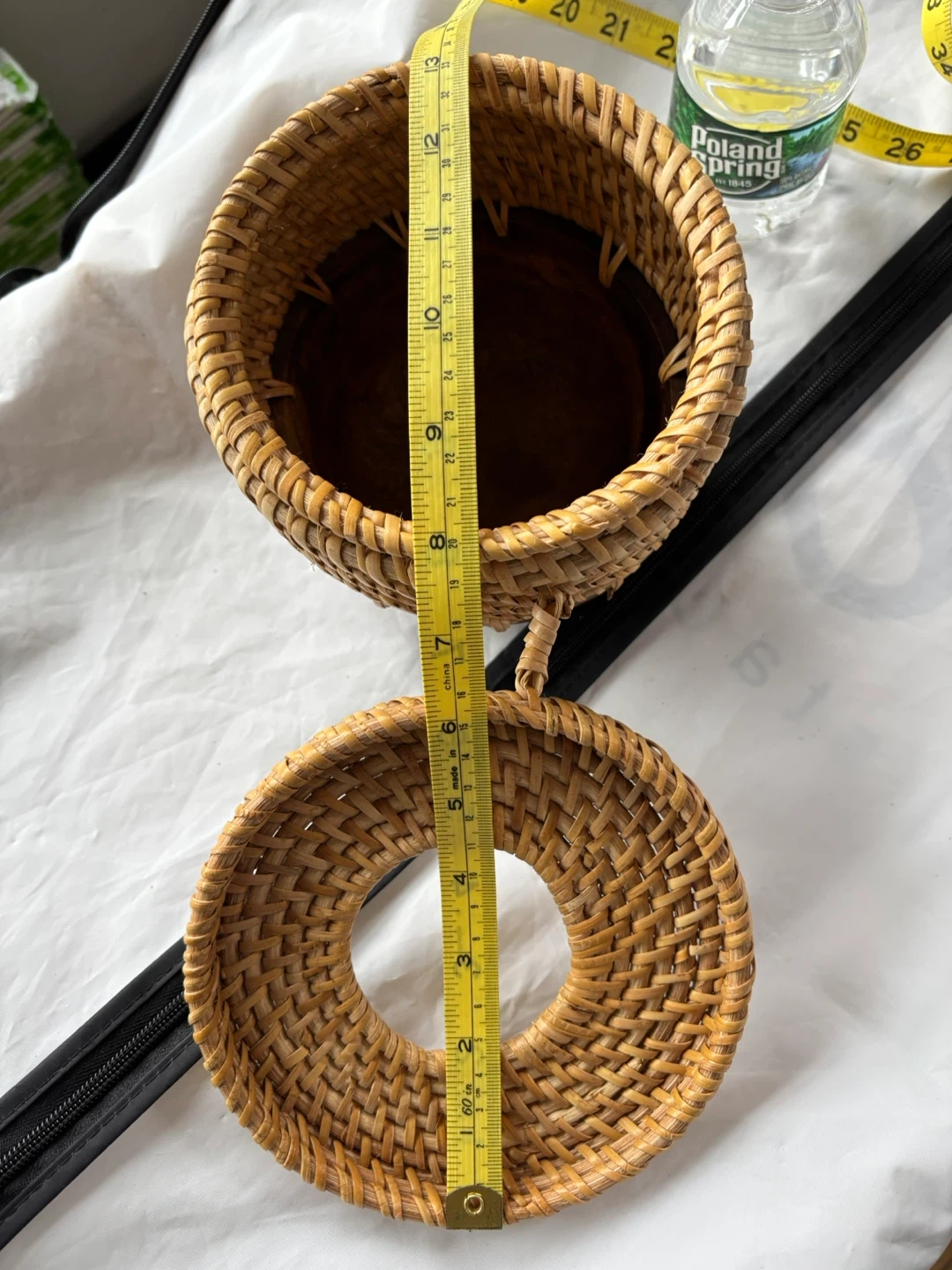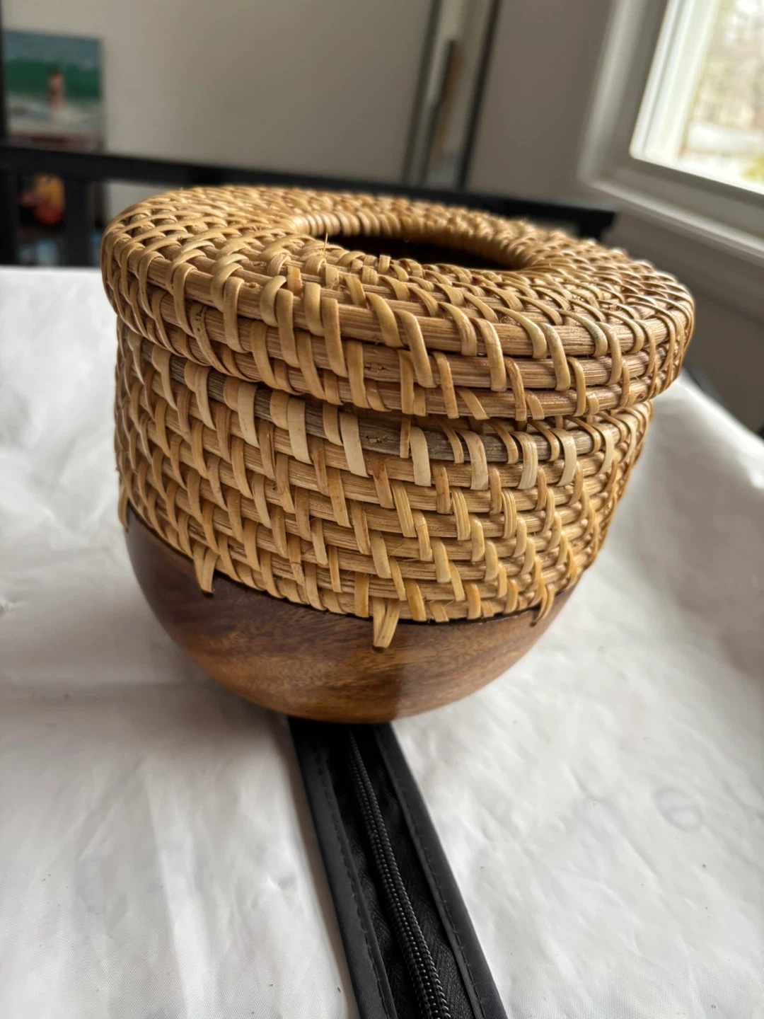 This hand crafted South African basket features a woven rattan exterior with a solid wood base. It includes a matching rattan lid with a cutout handle for a bottle neck. Used as a wine bottle ice holder The basket measures approximately 6 inches in height and 6 inches in diameter.