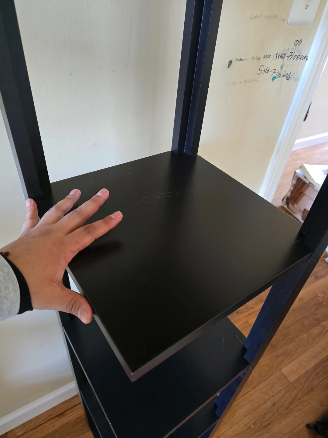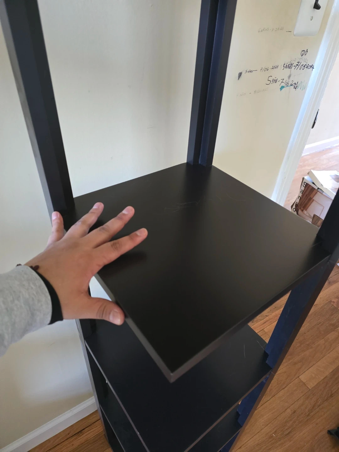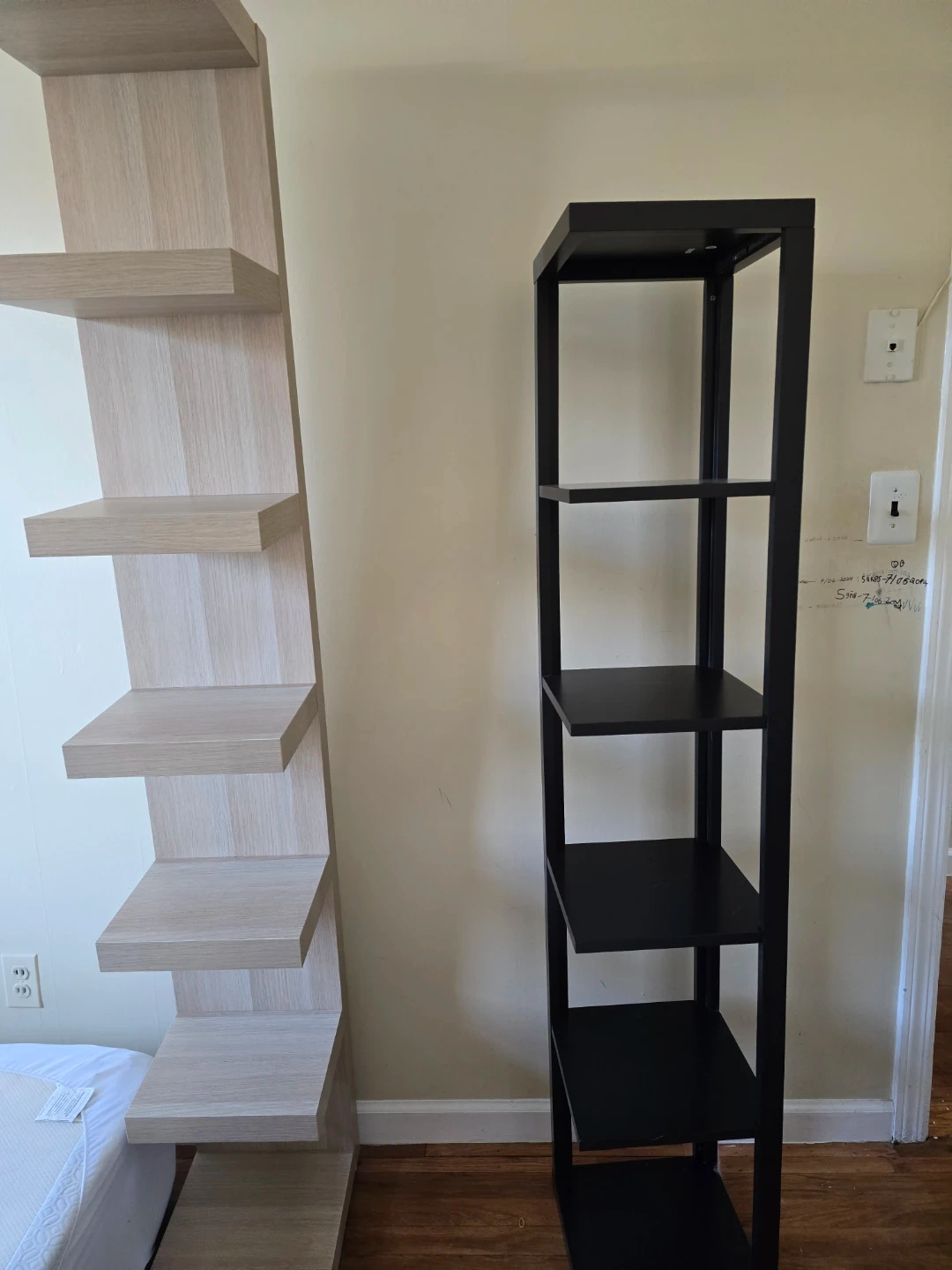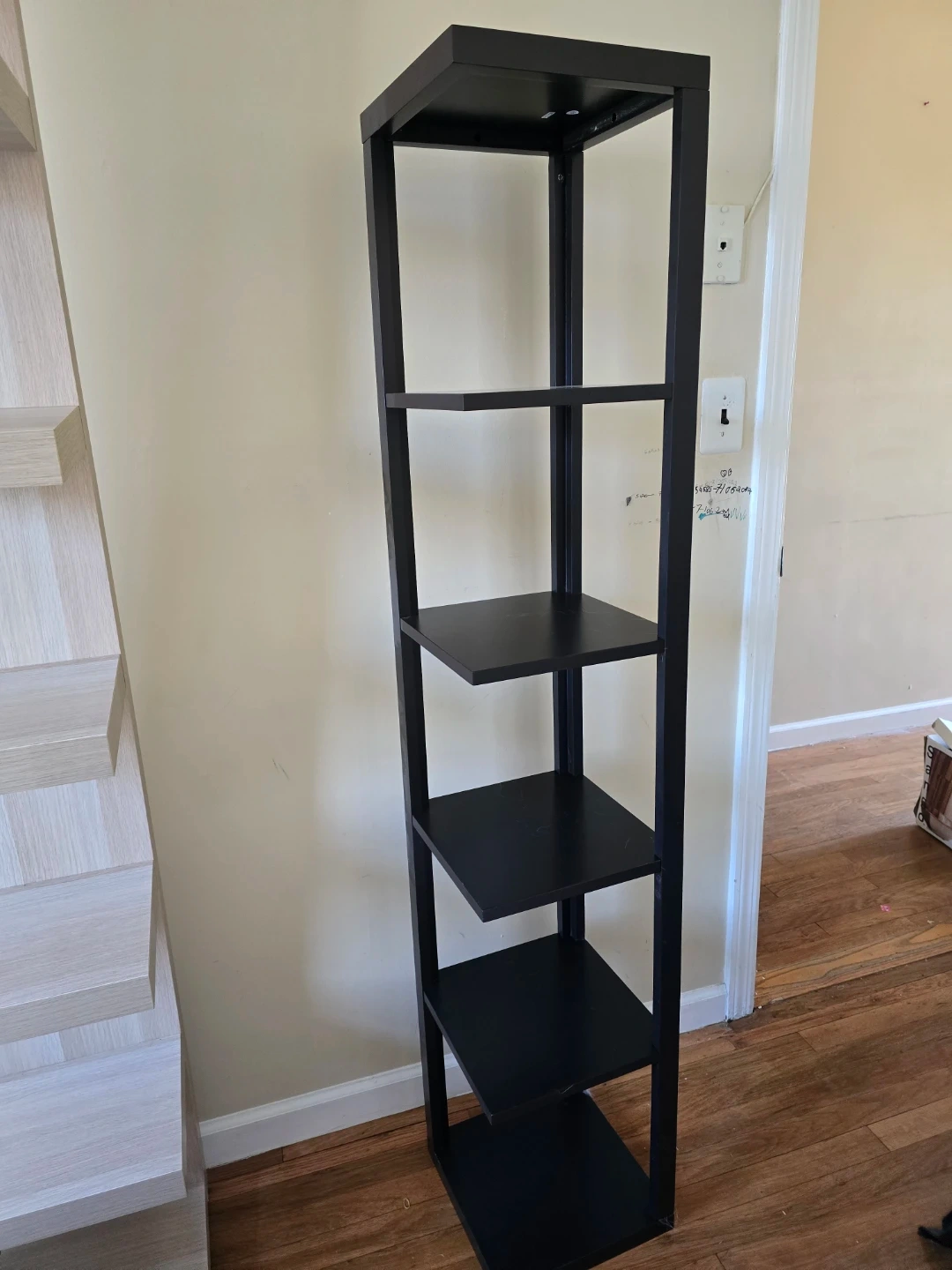 This black metal ladder bookshelf has five shelves. It's perfect for storing books or displaying decor. The shelves are made of wood.