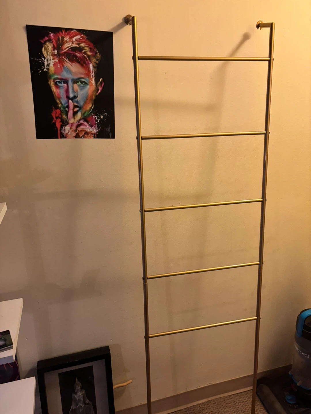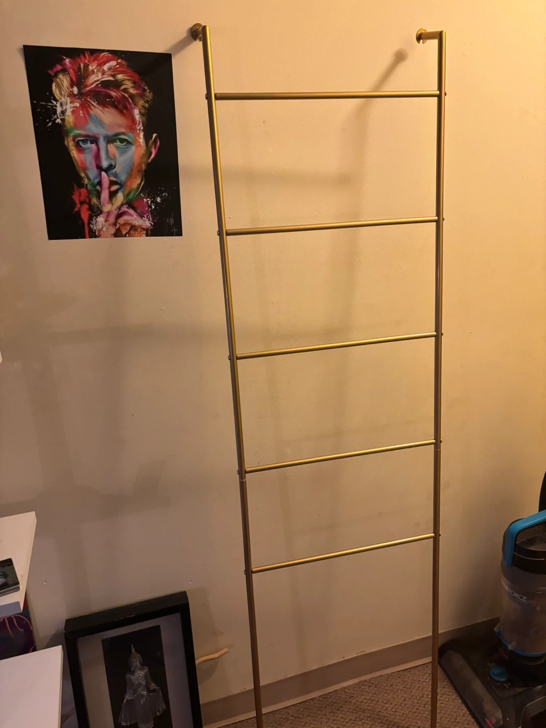 Selling a gold metal decorative ladder towel rack. ! It's in great shape and would look lovely in any room. Perfect for displaying blankets or towels, or just as a stylish accent piece for your home 70 by 20 inches and five rungs.