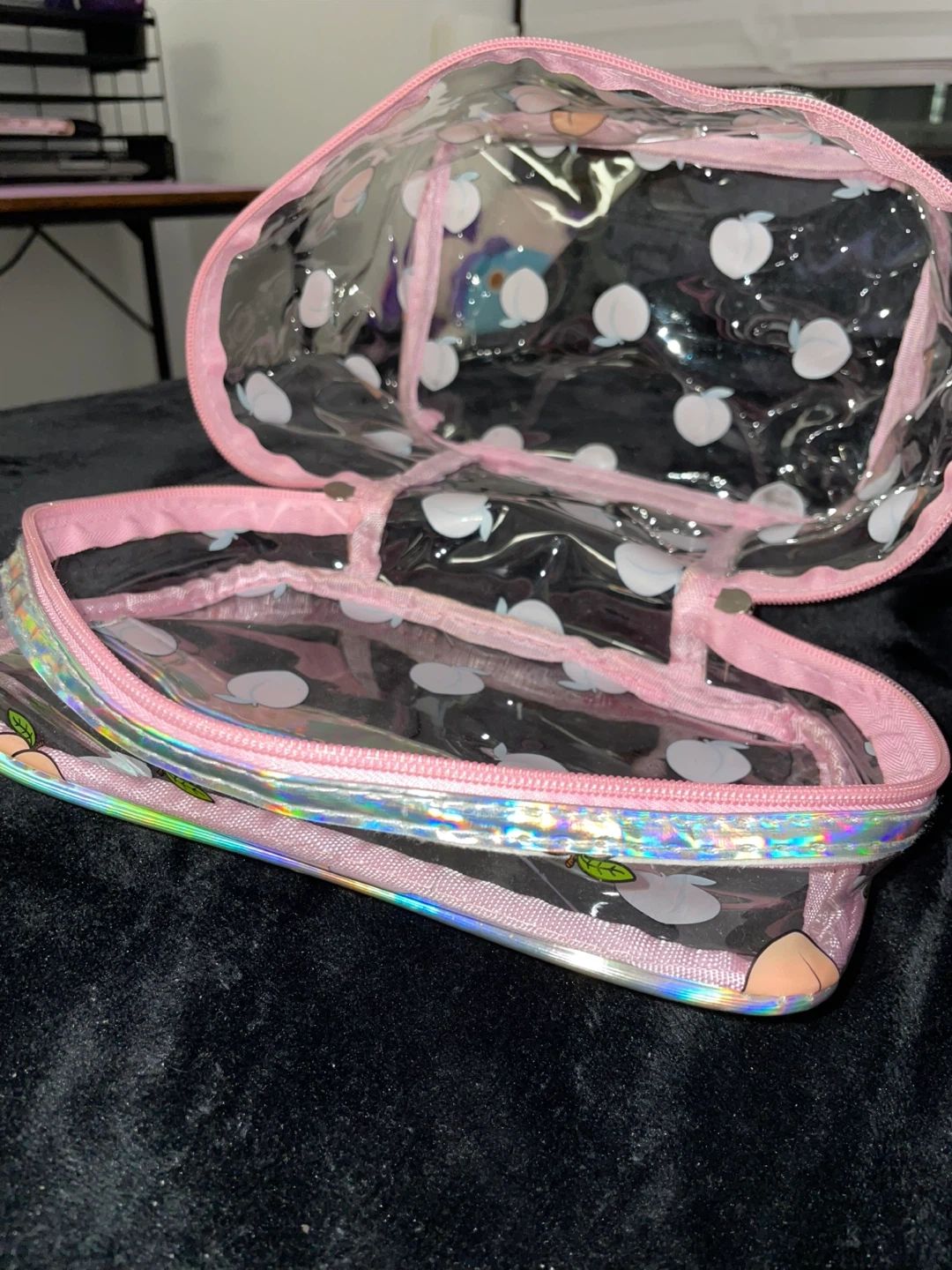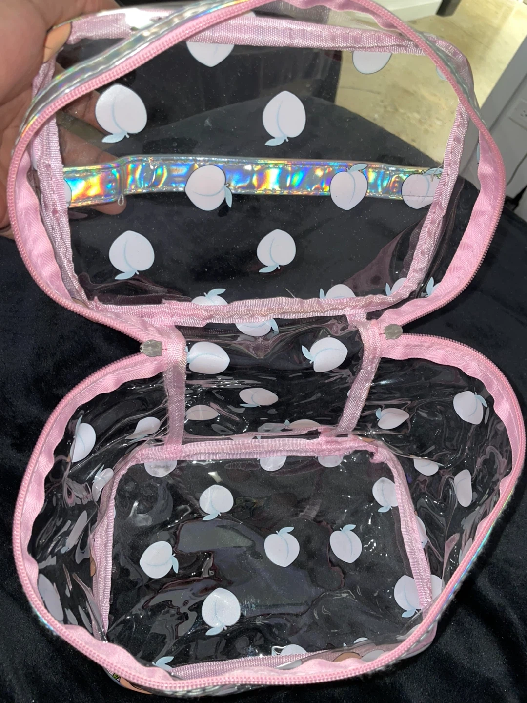 Peach print, lightly used. Adorable pink and iridescent trimmed bag.