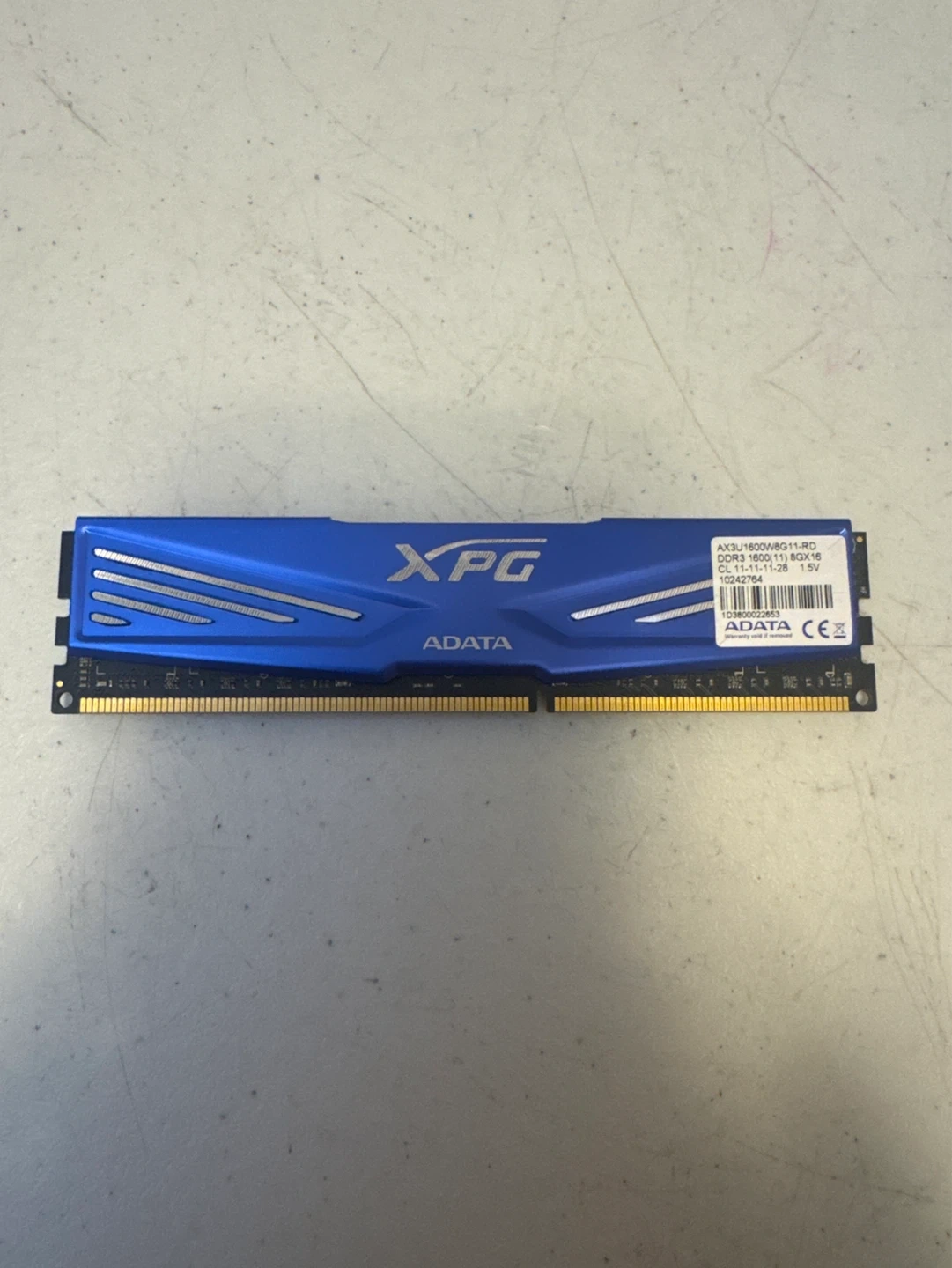 This is an ADATA XPG DDR3 RAM stick. It's 8GB with a speed of 1600MHz and CAS latency of 11. The voltage is 1.5V. This RAM is suitable for desktops.