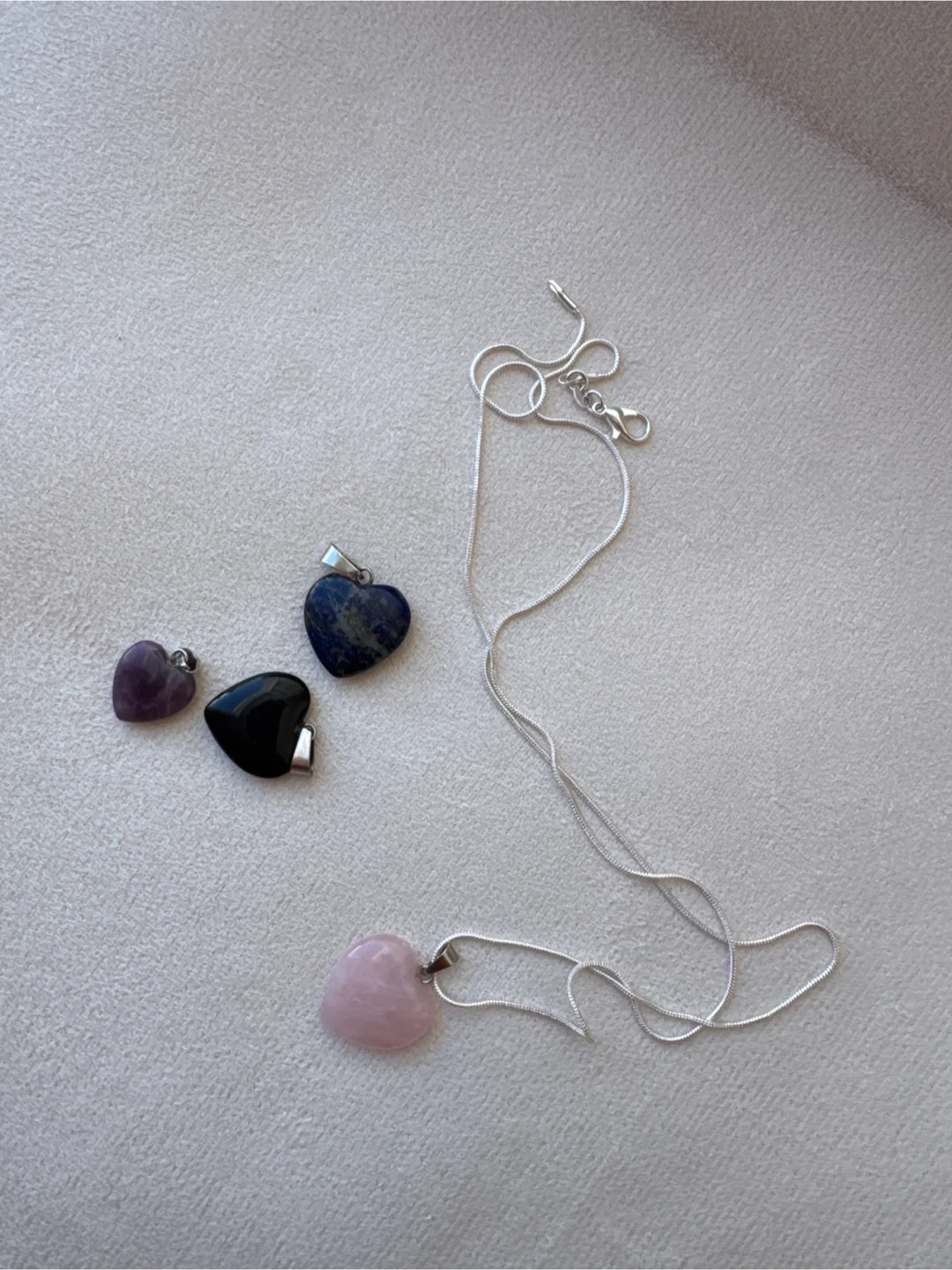Set of four heart-shaped pendants. Includes lapis lazuli, amethyst, black obsidian, and rose quartz. 💜