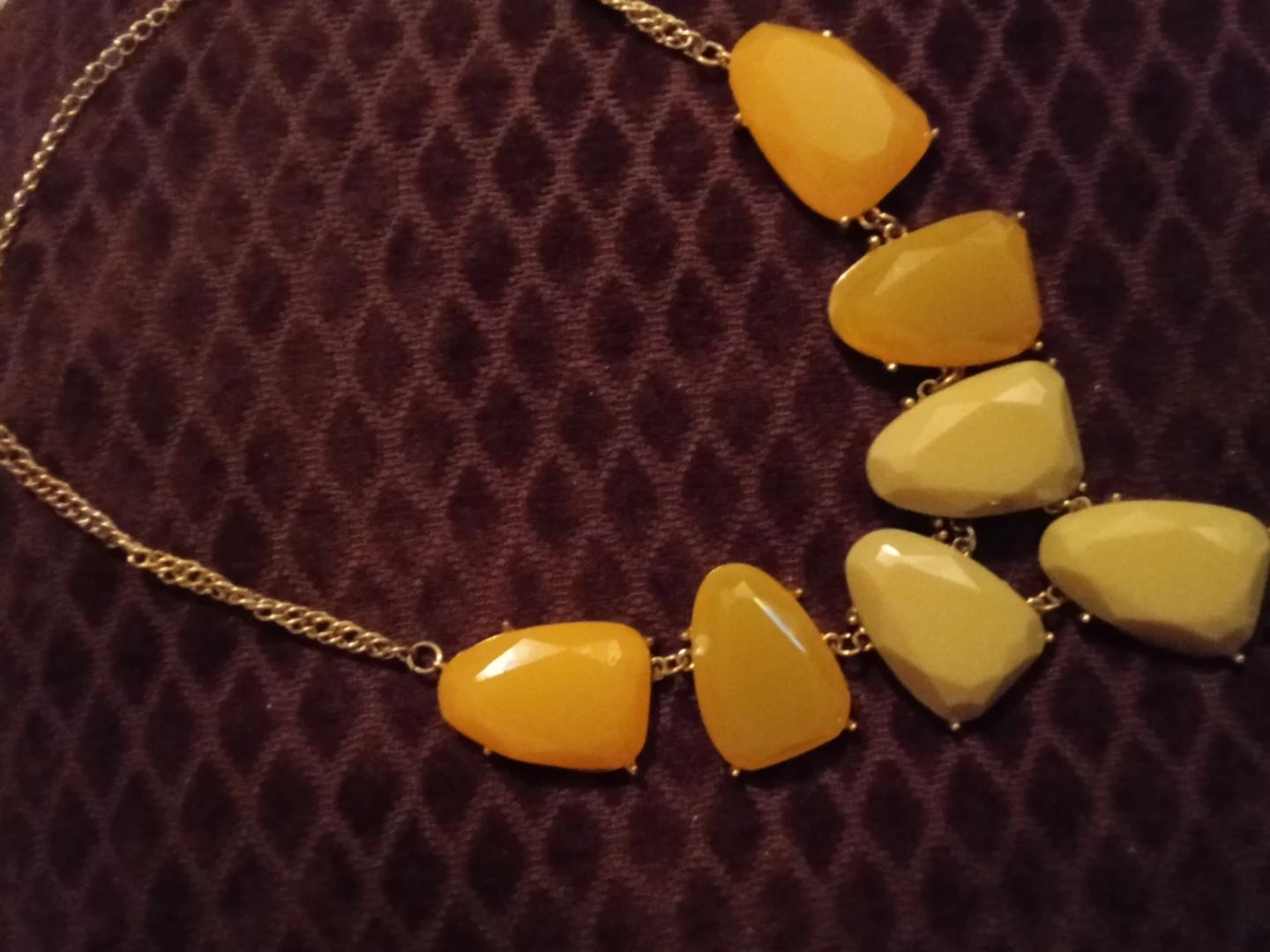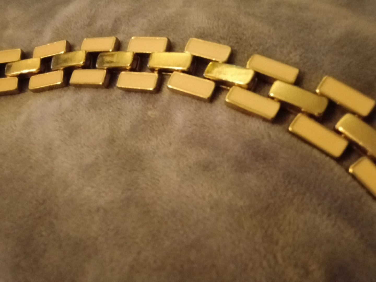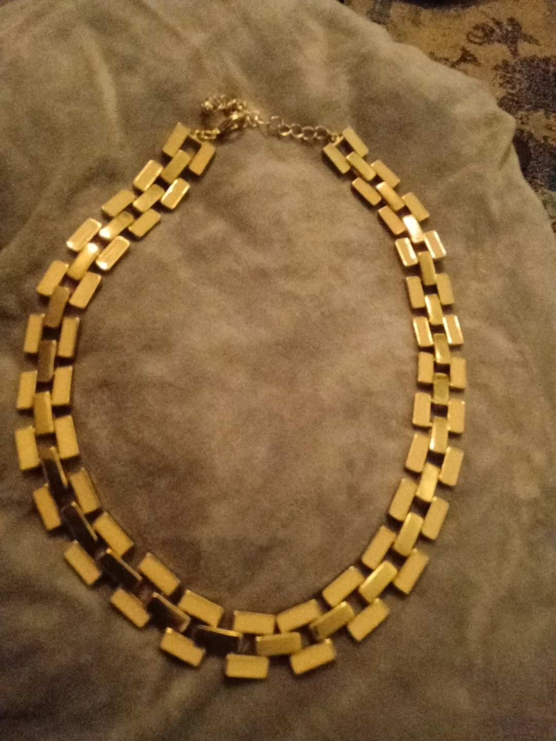 Chunky gold tone necklace with multiple strands. Features a mix of rectangular and rounded shapes. Lobster clasp closure.