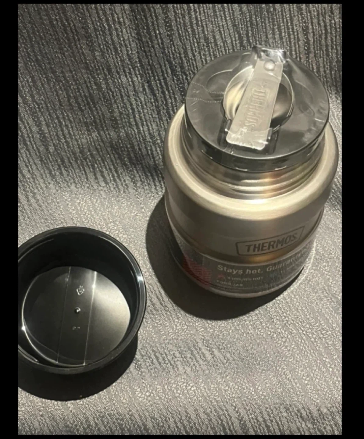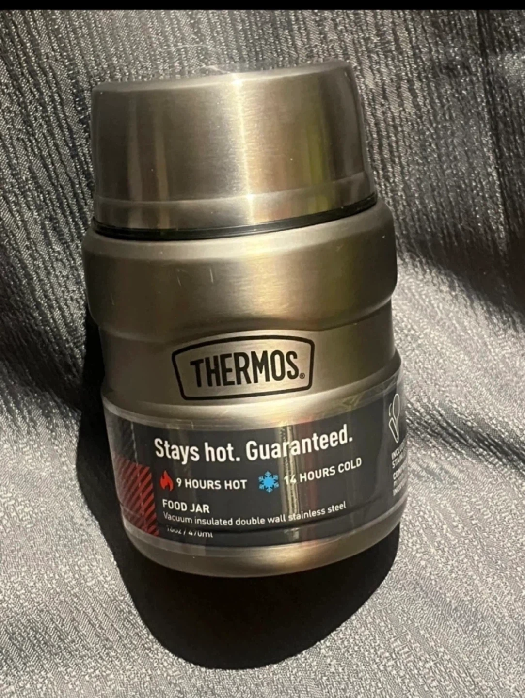 This Thermos food jar is perfect for keeping your food hot or cold on the go! It's vacuum insulated with double-wall stainless steel, so it stays hot for 9 hours or cold for 14 hours. Guaranteed!