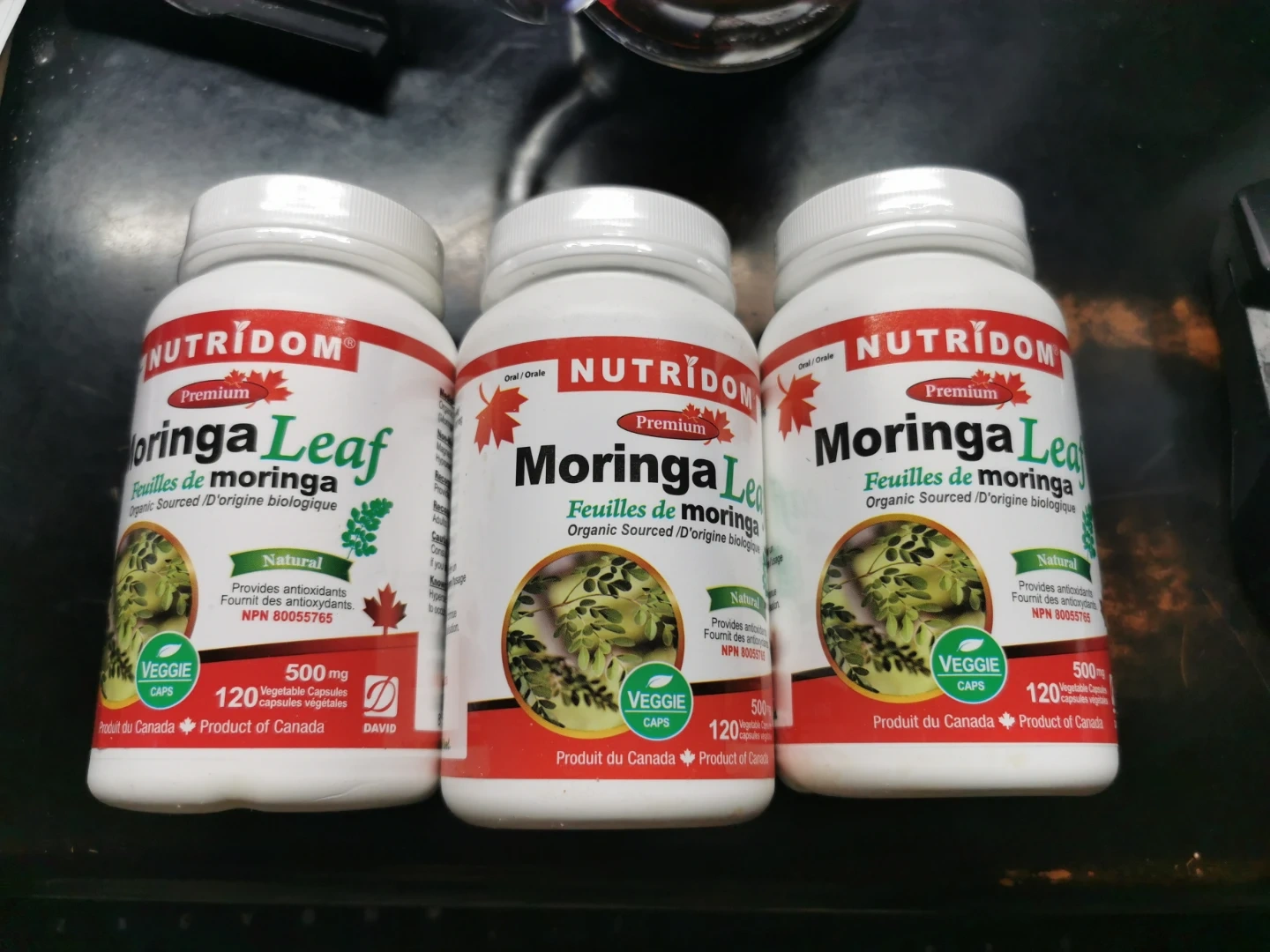 Three bottles of Nutridom Moringa Leaf vegetable capsules. Each bottle contains 120 capsules. Provides antioxidants and is organic sourced. 500 mg per capsule.