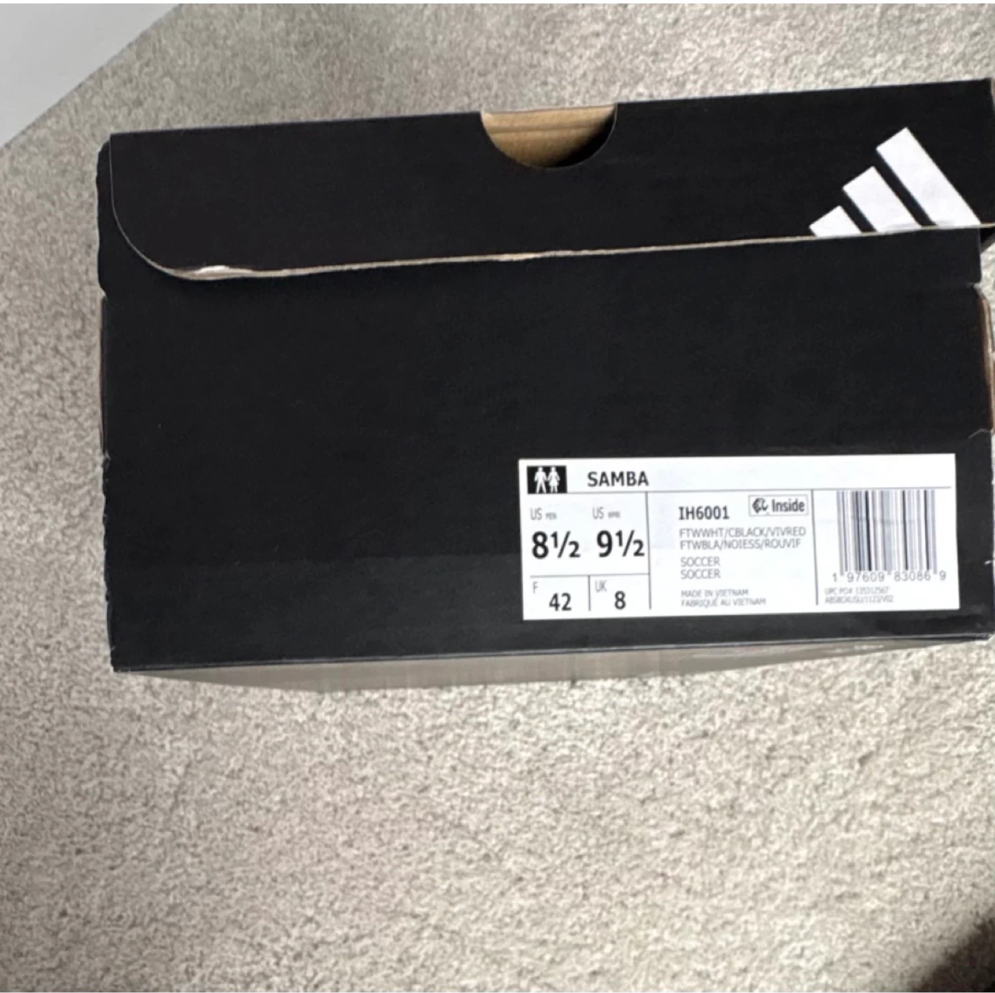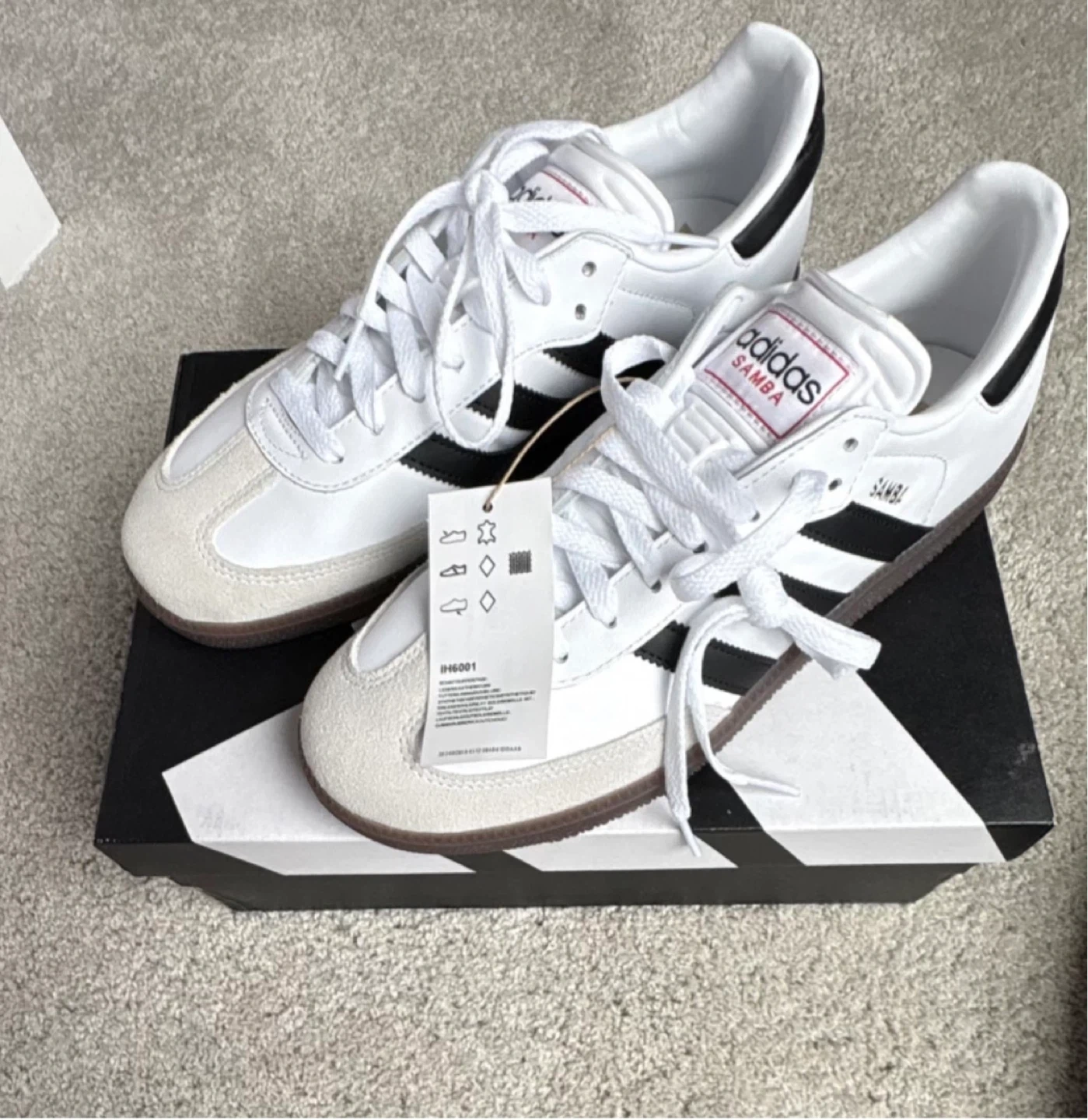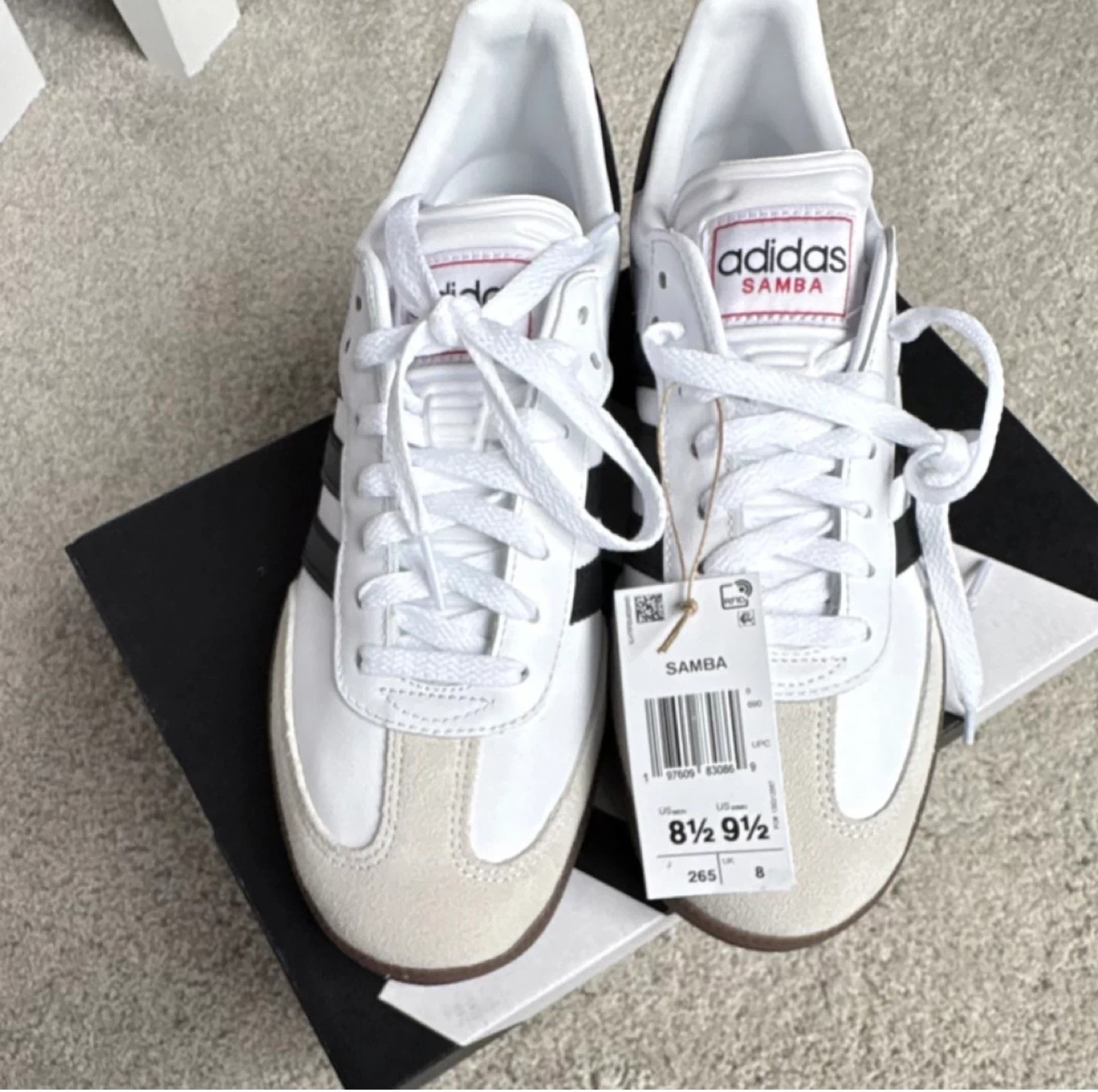 Adidas Samba shoes in white with black stripes. These soccer shoes are a size 8.5 US. Comes with original box.