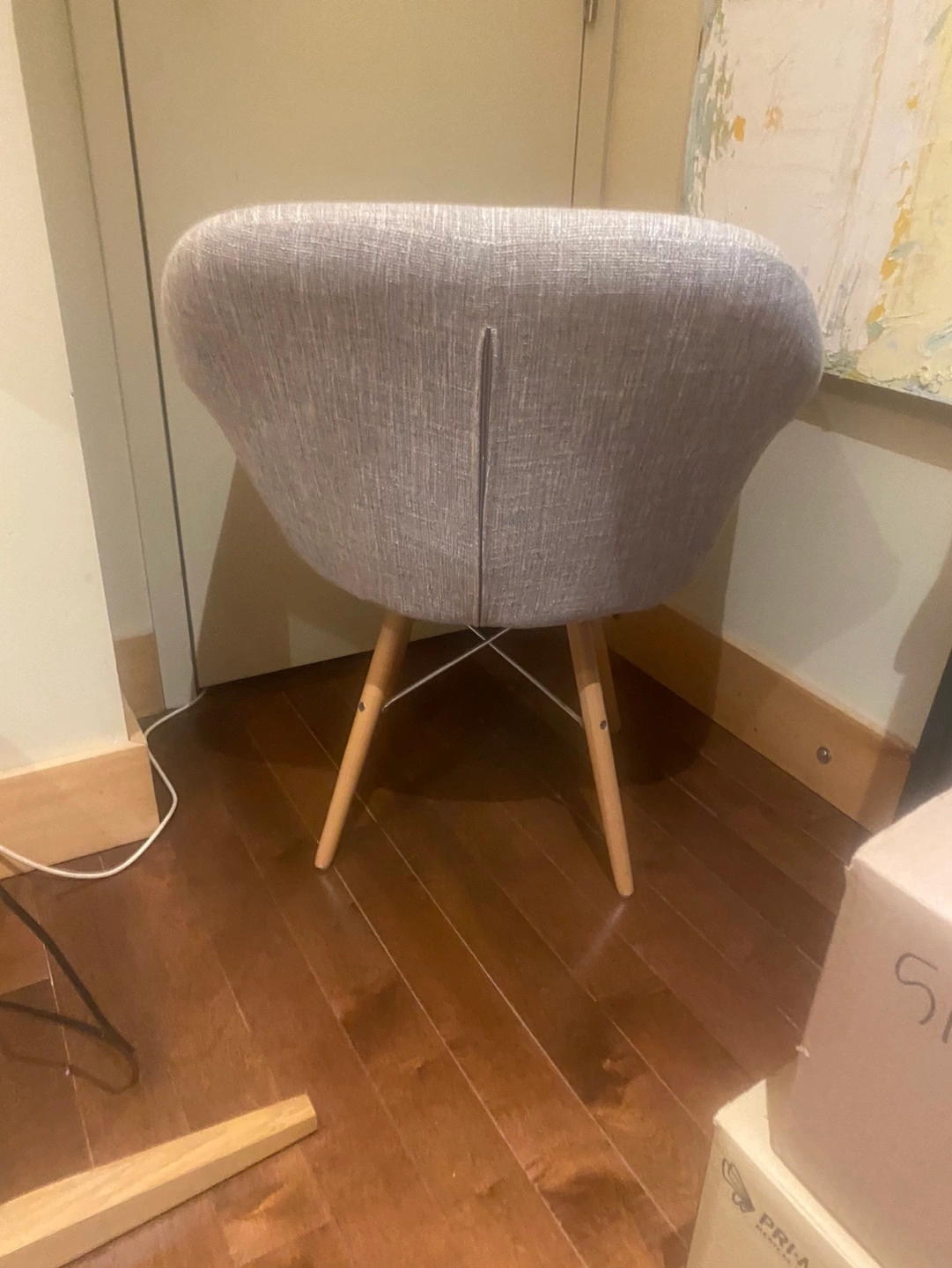Stylish accent chair. Features a curved back and seat. Light grey fabric upholstery. Wooden legs. Perfect for a living room or office 🩶