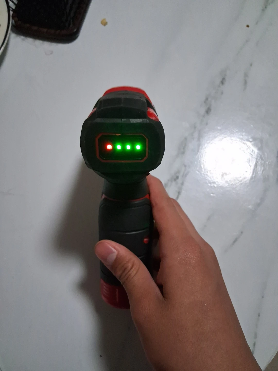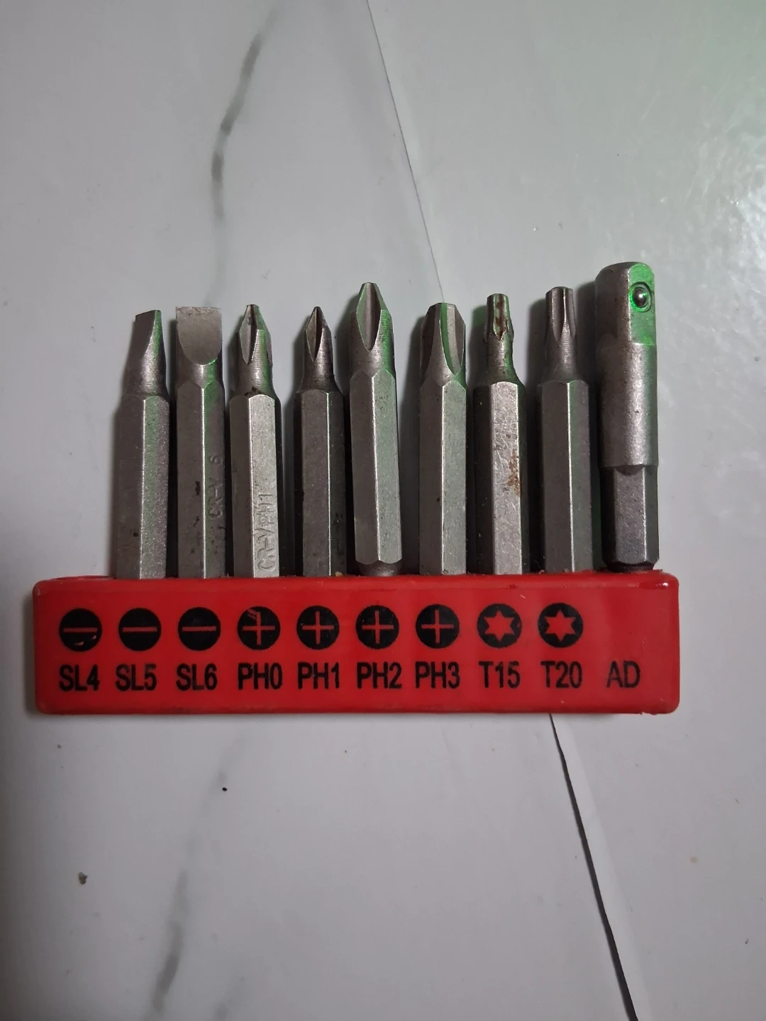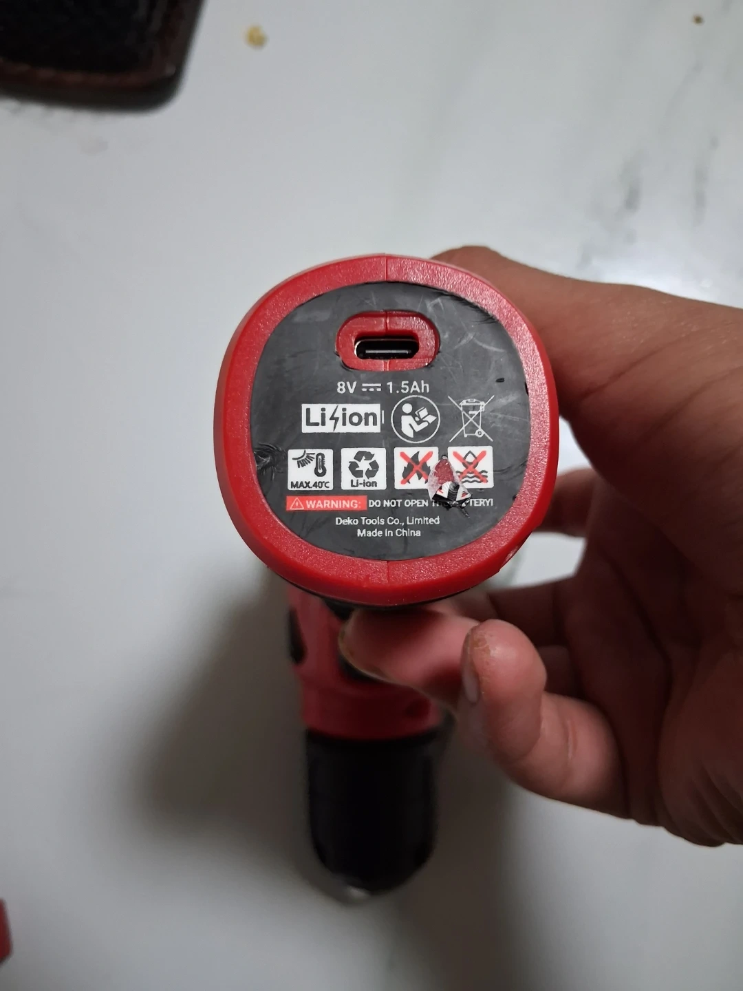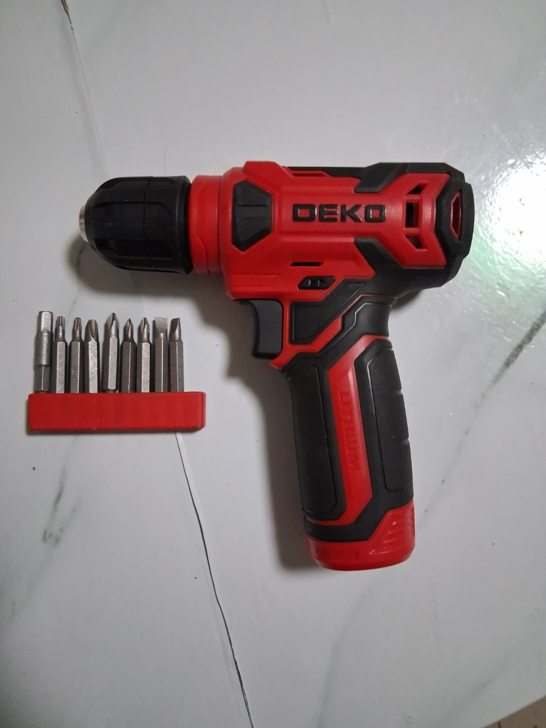 This is a DEKO 8V cordless drill with a lithium-ion battery. It includes a set of 9 common screw bits. The drill has a charging indicator light. Great for small home projects!