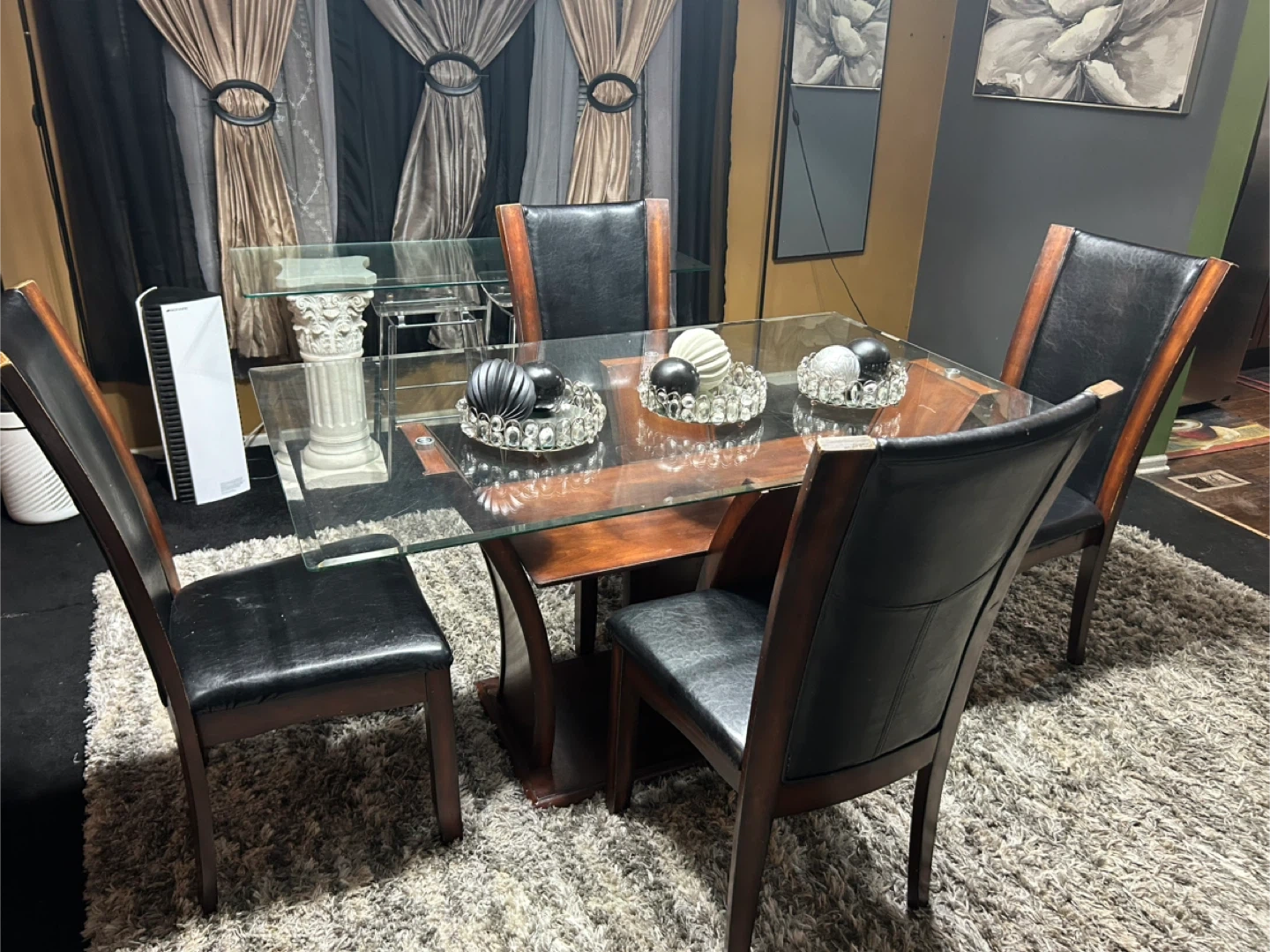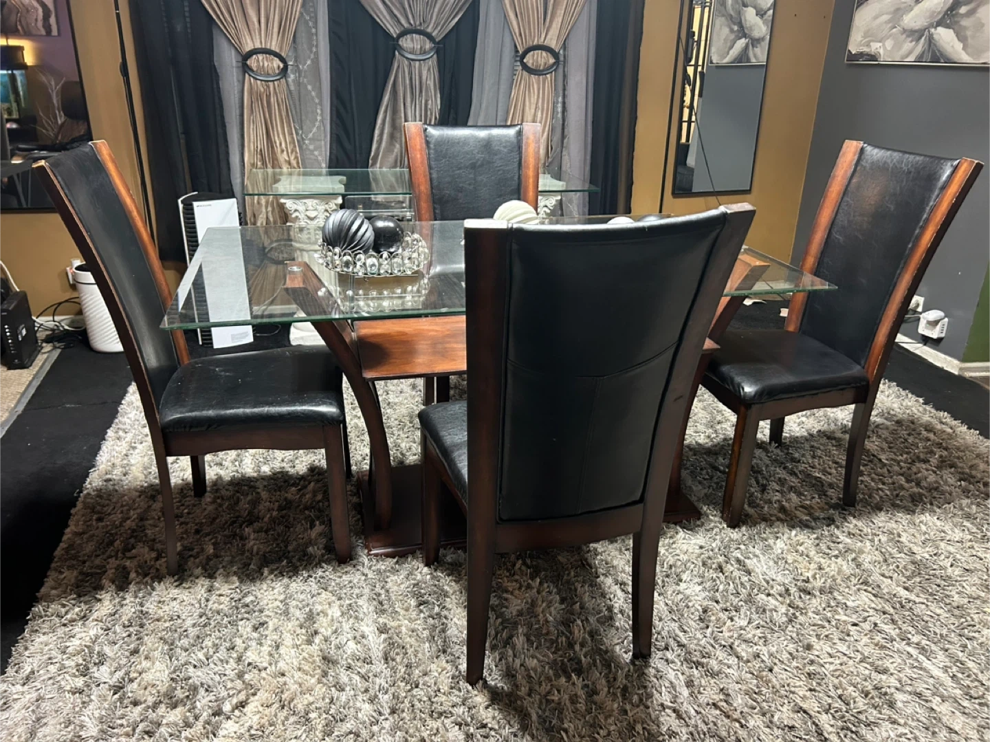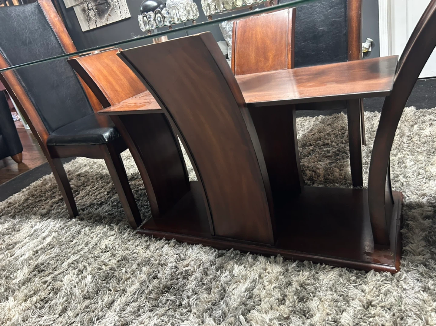 Selling a dining table with a glass top and four chairs. The chairs have a dark wood frame with black leather seats. The table has a unique wooden base. Great for a dining room or kitchen area