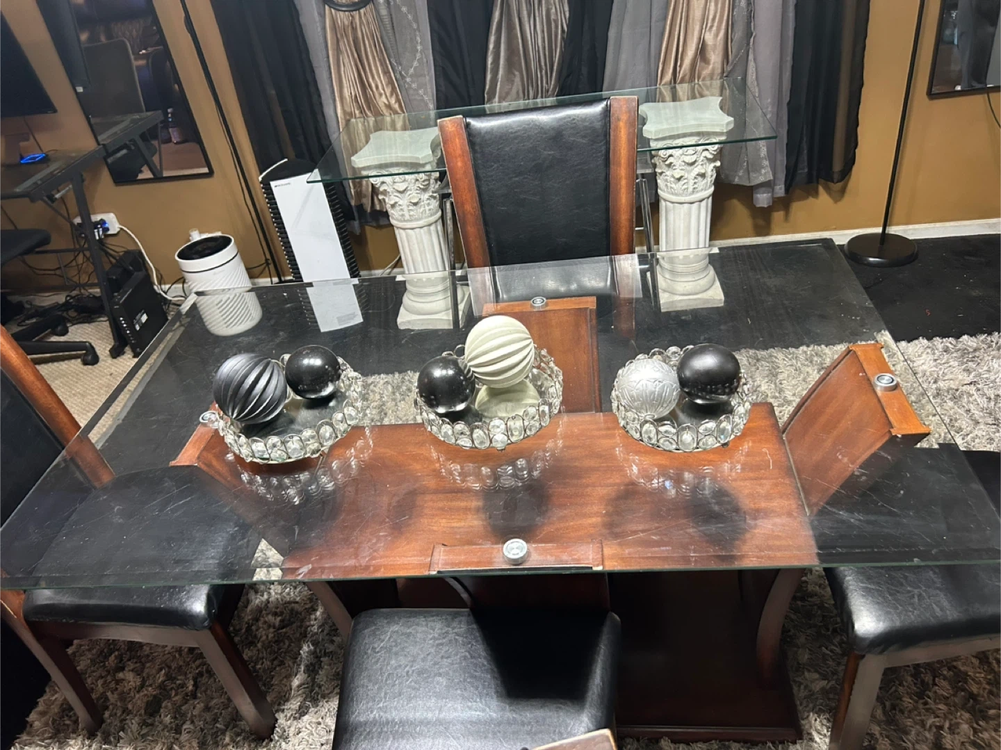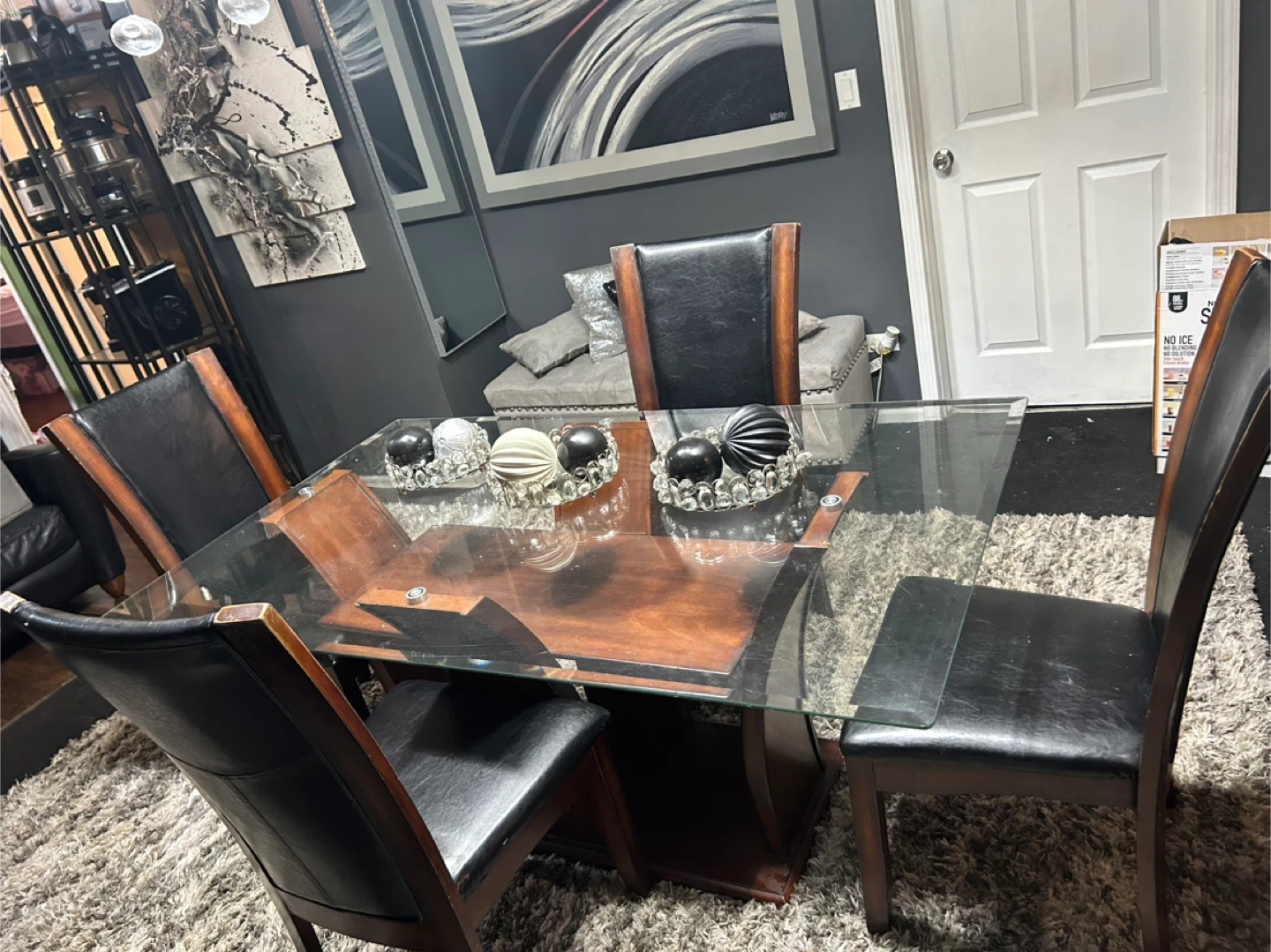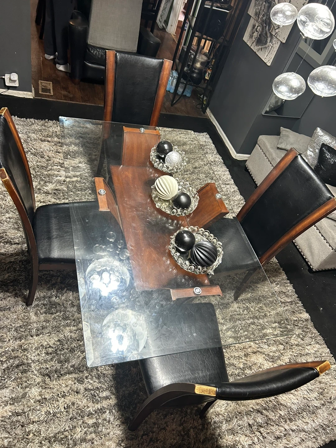 Selling a dining table with a glass top and four chairs. The chairs have a dark wood frame with black leather seats. The table has a unique wooden base. Great for a dining room or kitchen area