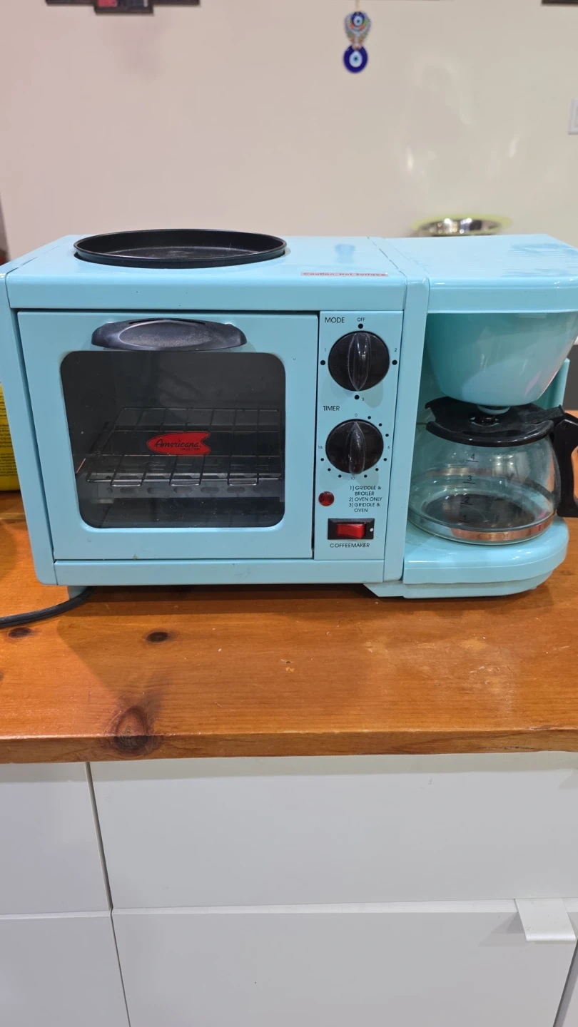 This Americana breakfast station includes a mini oven, griddle, and coffeemaker. It's light blue and compact for small spaces. Perfect for making a quick breakfast!