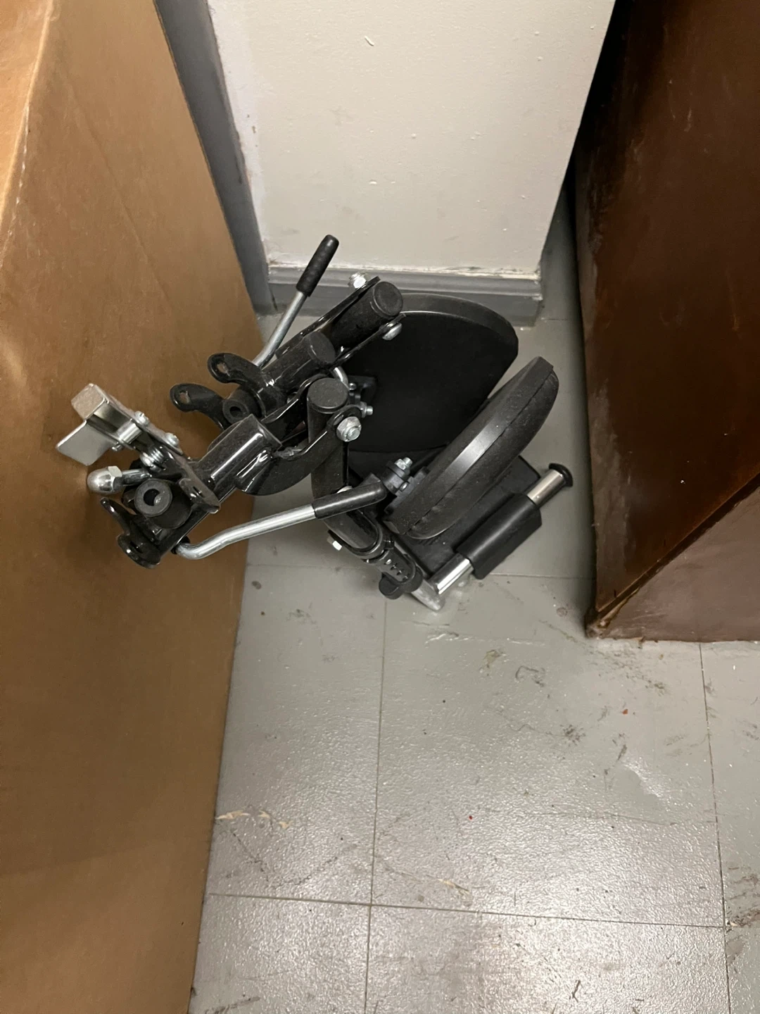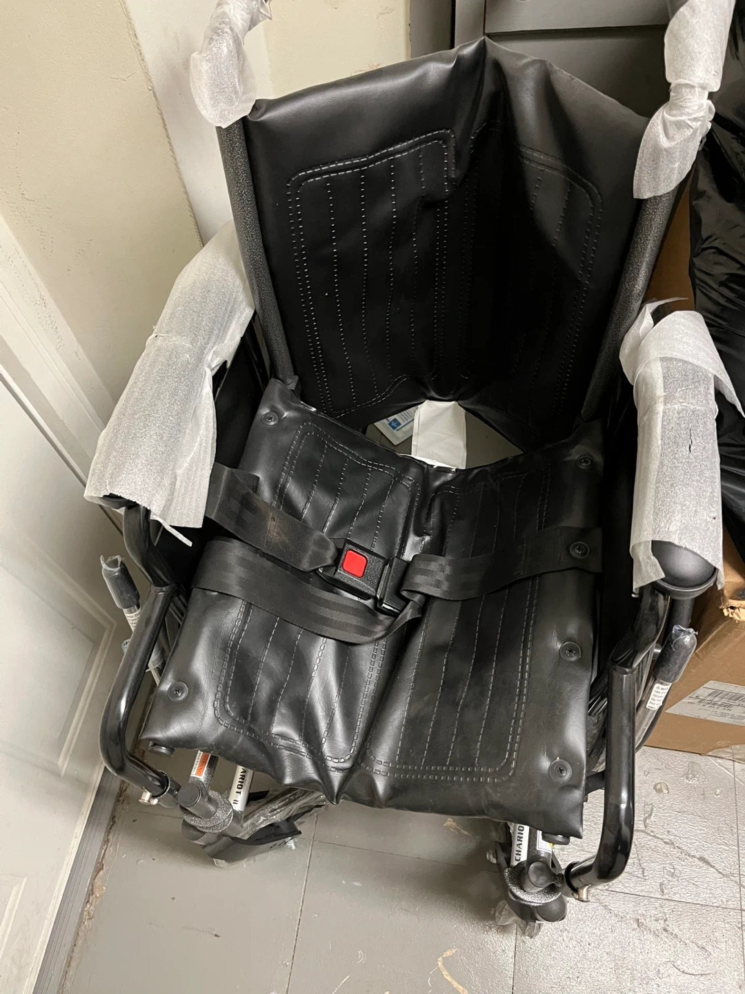 Black wheelchair with adjustable seatbelt. It has a metal frame and black upholstery. This wheelchair is designed for mobility assistance.