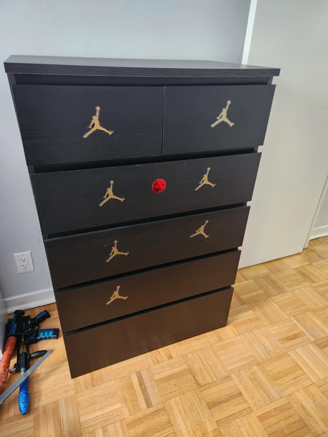 This black dresser has six drawers with decorative Jordan logos on each. It's a sturdy piece of furniture suitable for bedroom storage. Made of wood composite.