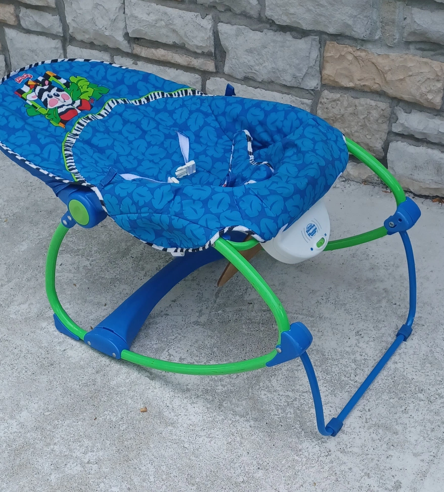 Selling a gently used Fisher-Price baby bouncer in great condition! It features a fun blue pattern and a cute zebra character. Perfect for keeping your little one entertained and comfortable.