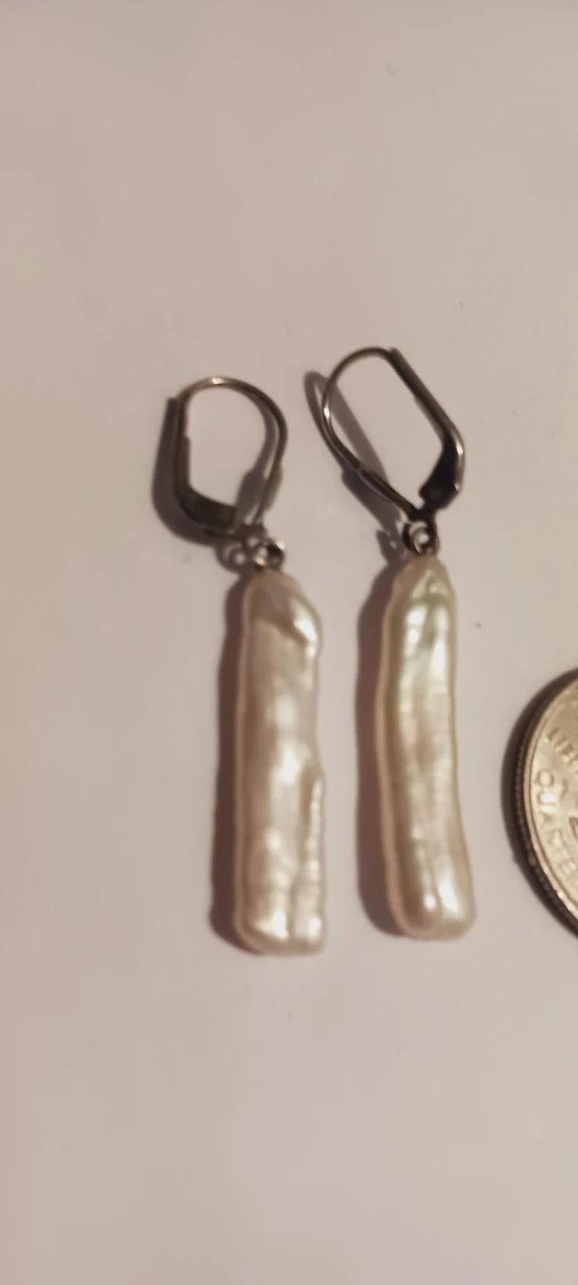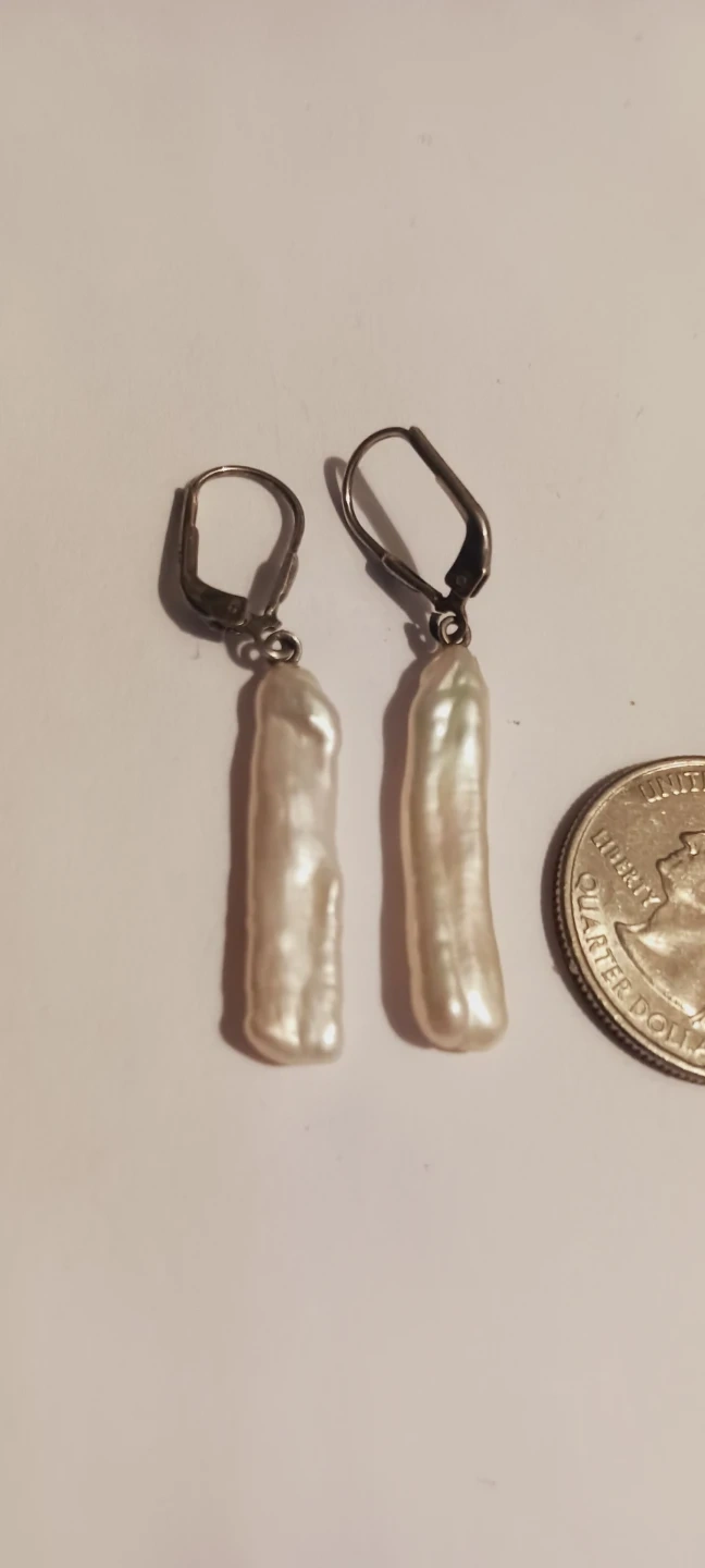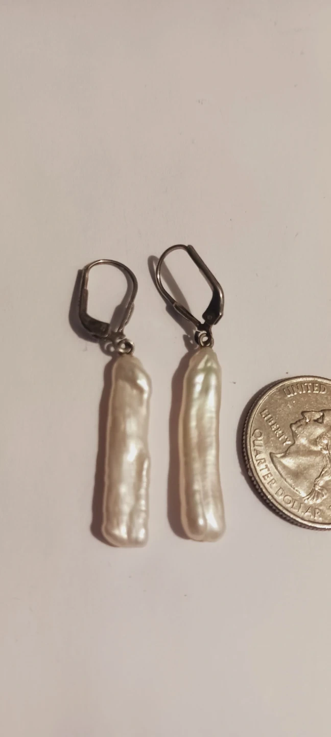 Sterling Silver 925 Stamped Genuine Baroque White Biwa pearl drop earrings with STERLING SILVER 925 STAMPED leverback closures. Each pearl is elongated with a unique irregular shape. Perfect for adding a touch of elegance to any outfit! 2" long. Excellent condition. ALL MY PRICES ARE NEGOTIABLE !!