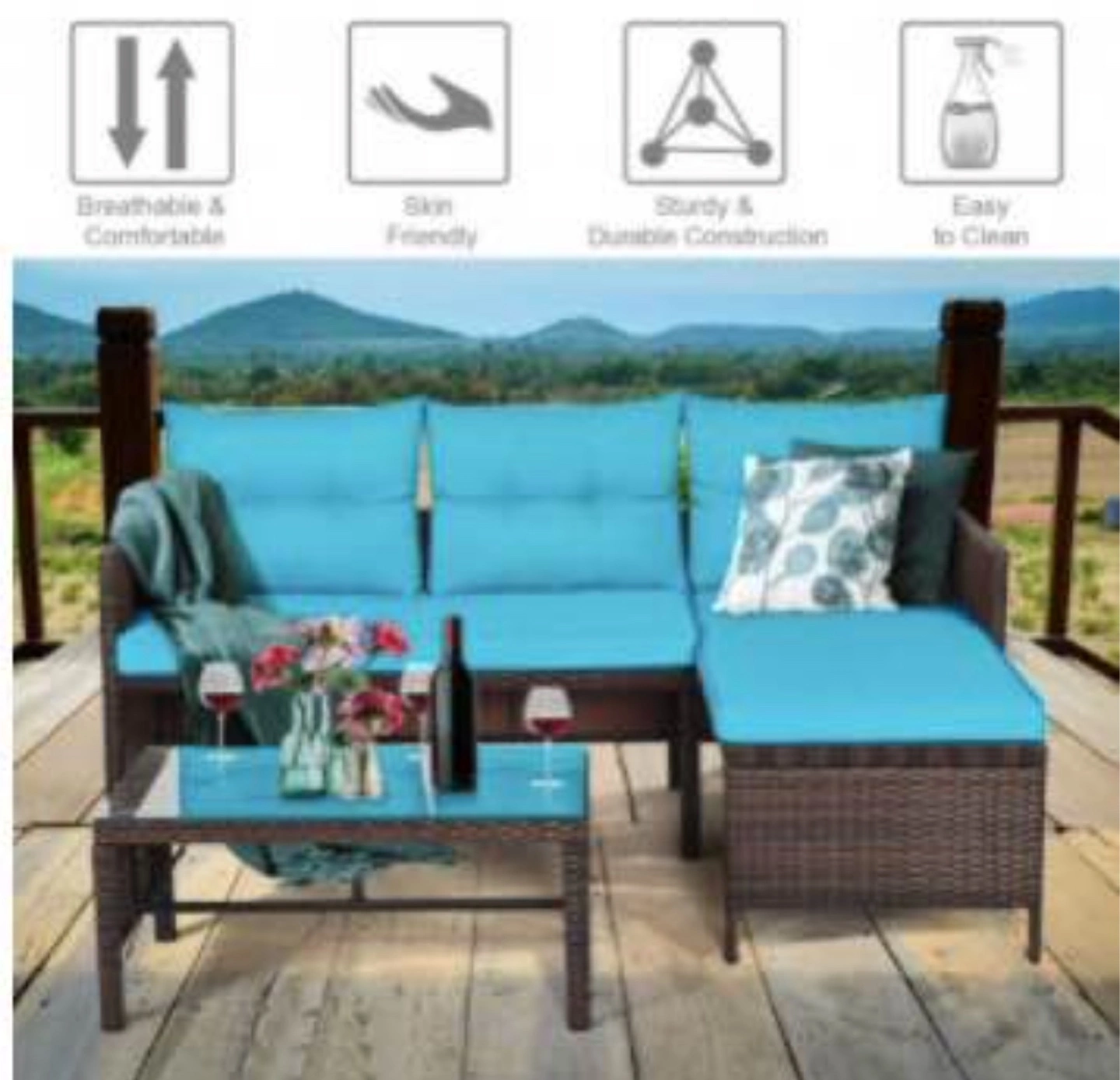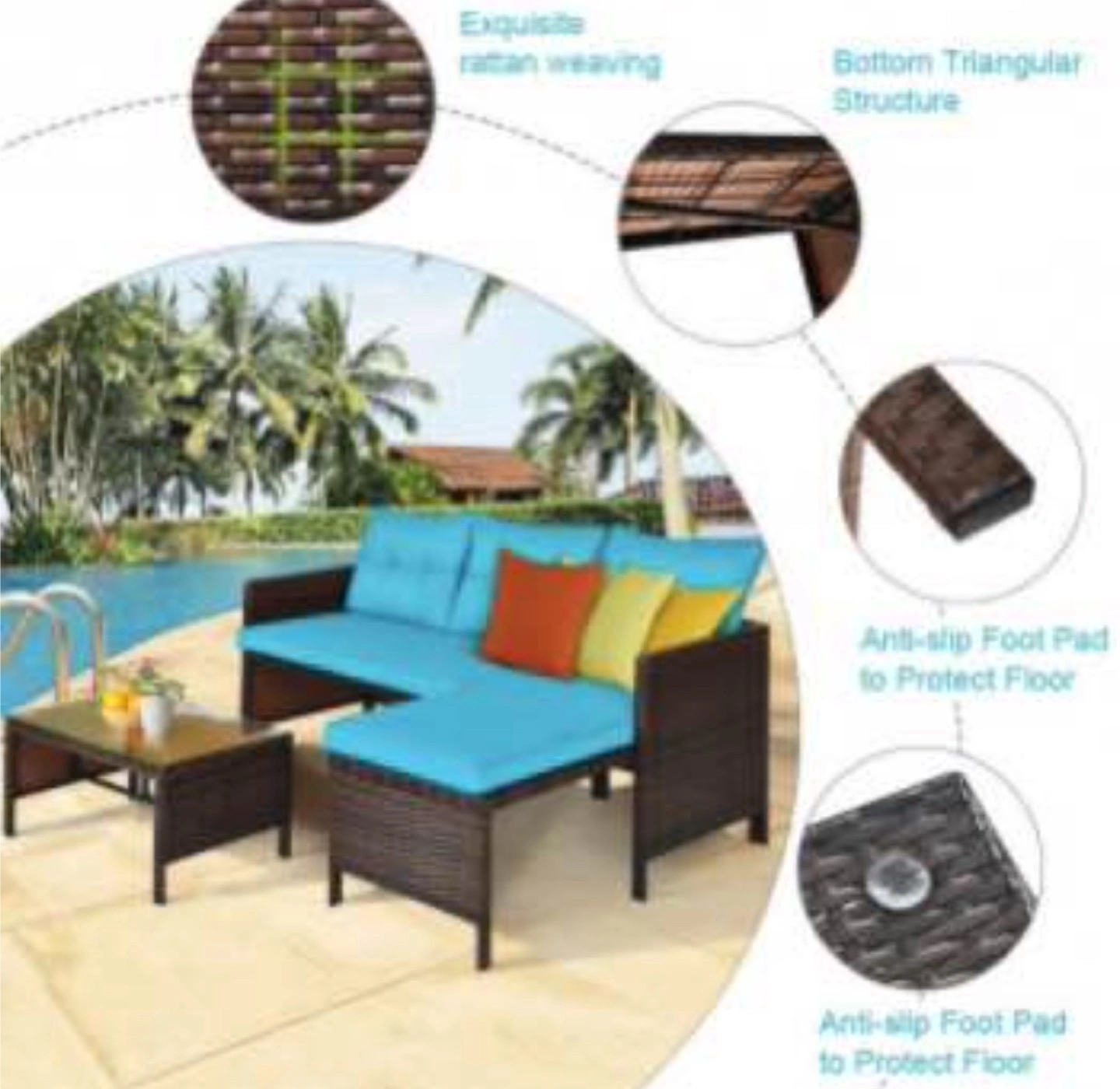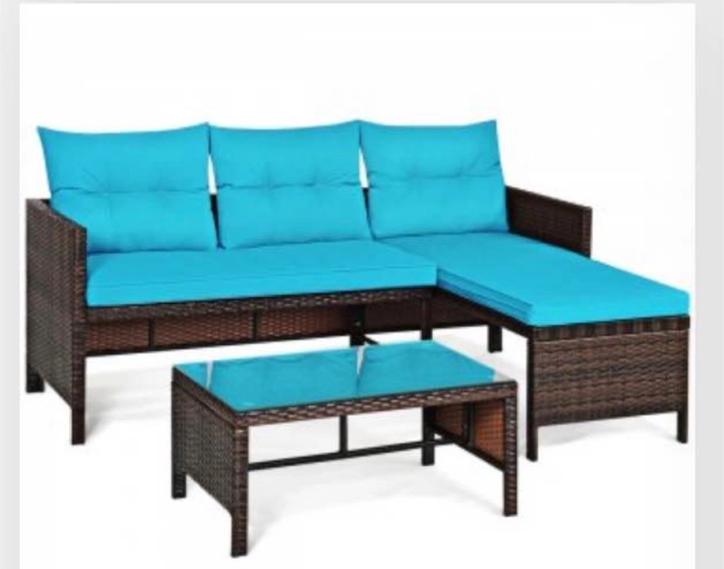 3-Piece Outdoor Wicker Sectional Sofa Set with Teal Cushions