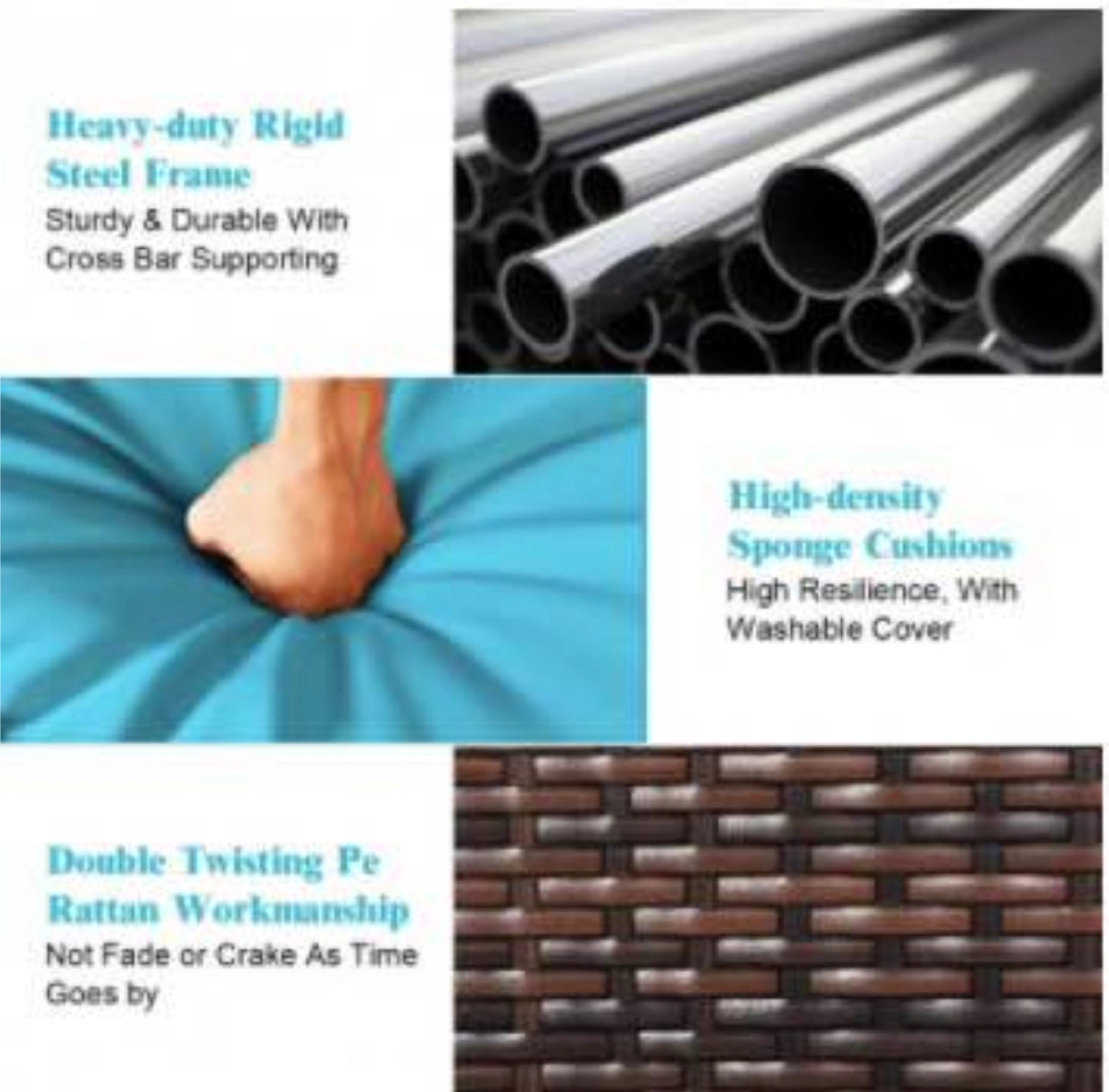Durable wicker construction. Includes loveseat, chaise lounge, and coffee table. Teal cushions included. Perfect for patios, poolsides, or gardens.