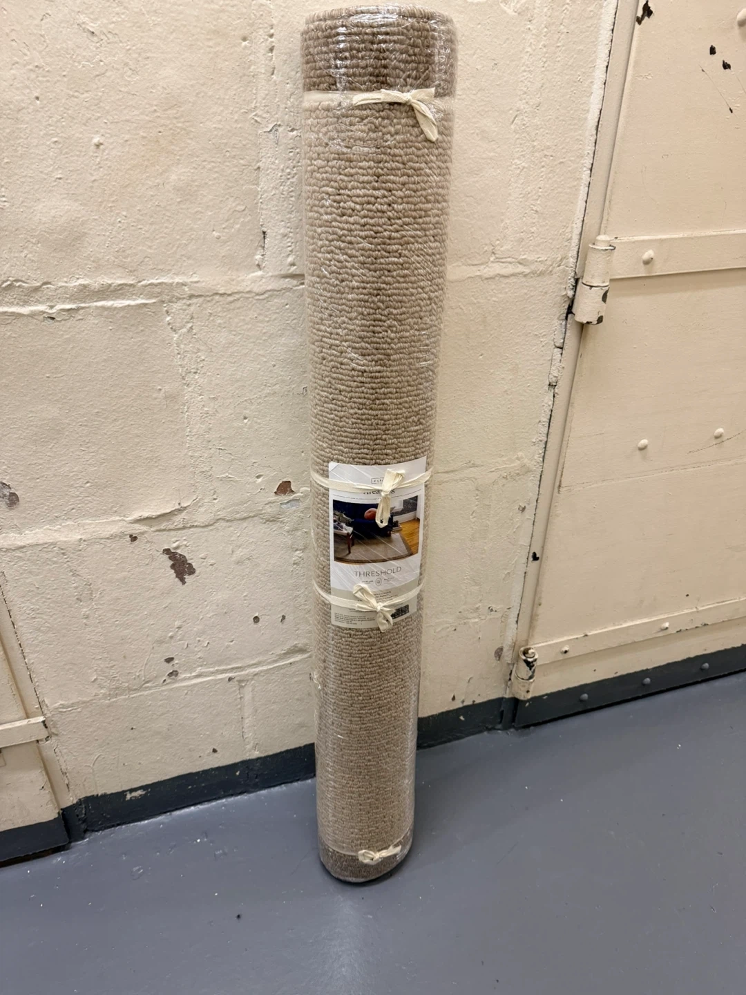 This is a Threshold area rug with a beige and brown color scheme. It's made of durable material. It's perfect for adding a touch of warmth to any room!