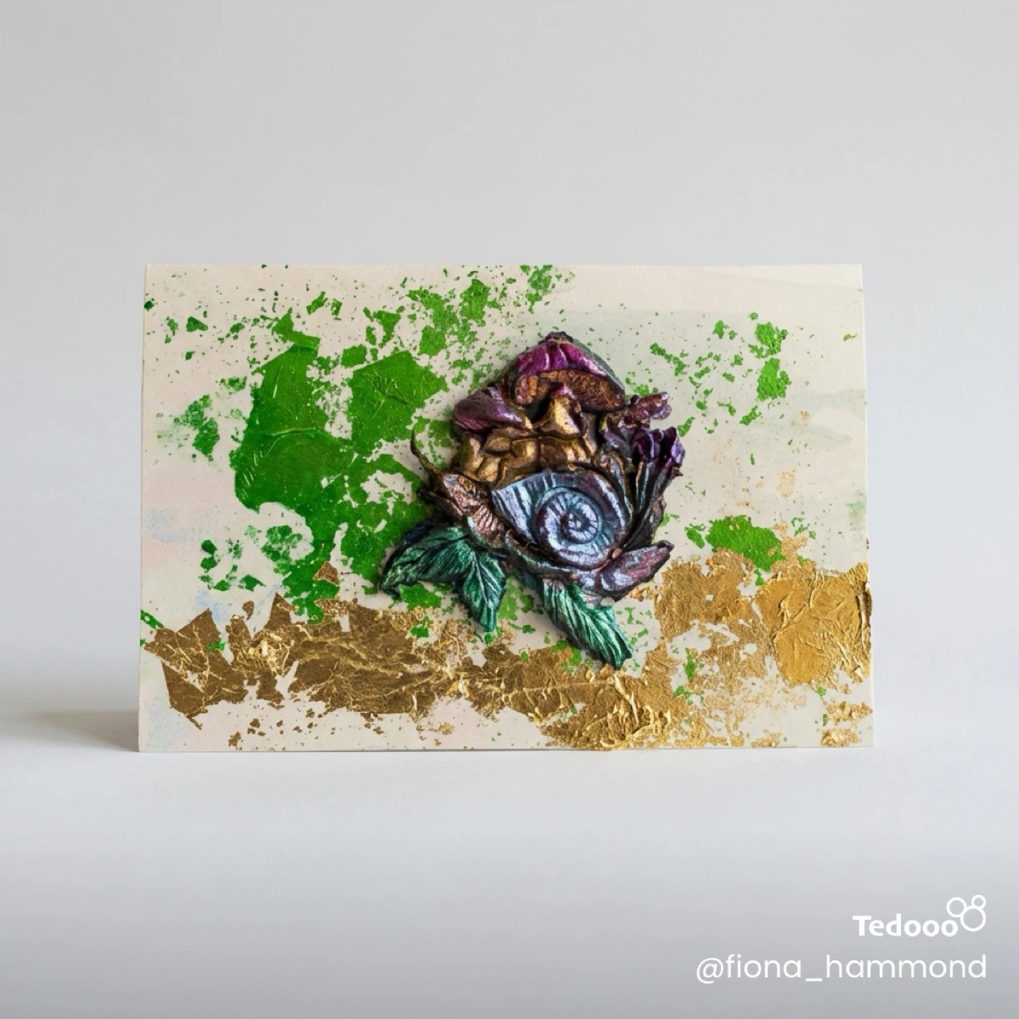A unique mixed media art piece featuring a sculpted snail with mushrooms and foliage. It's adorned with metallic green splatters and gold leaf accents on a textured background. This decorative item is a one of a kind greeting card.
