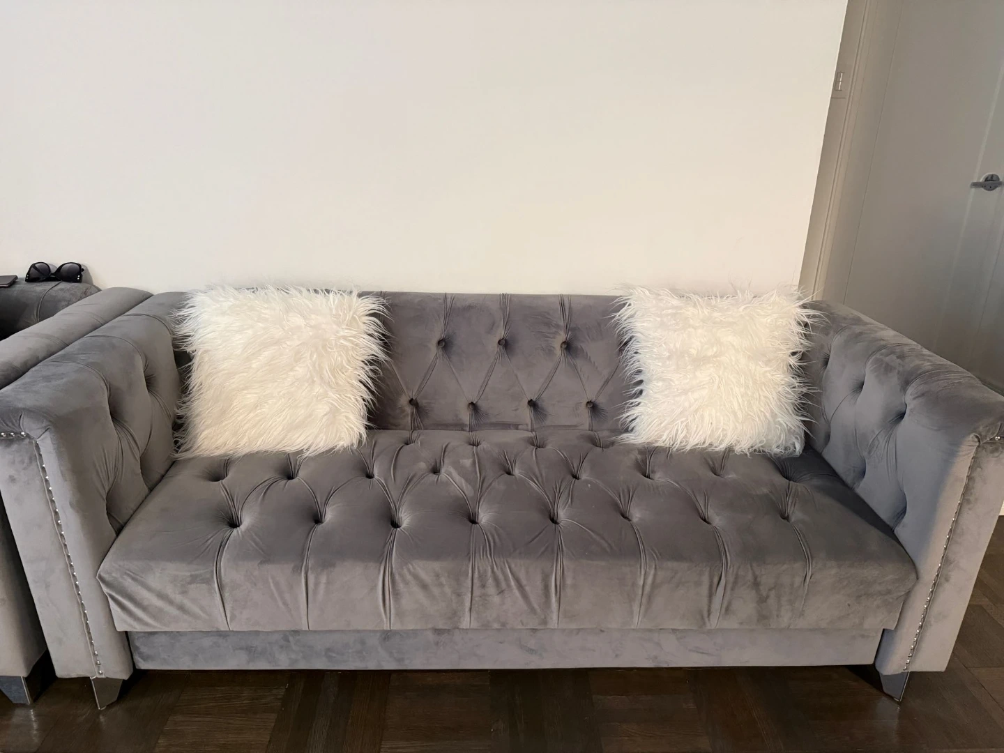 Stylish grey velvet sofa featuring deep button tufting and decorative silver studs along the arms. Comes with two fluffy white accent pillows. Its chesterfield design adds a touch of elegance to any living space. A lovely couch for relaxing or entertaining guests!