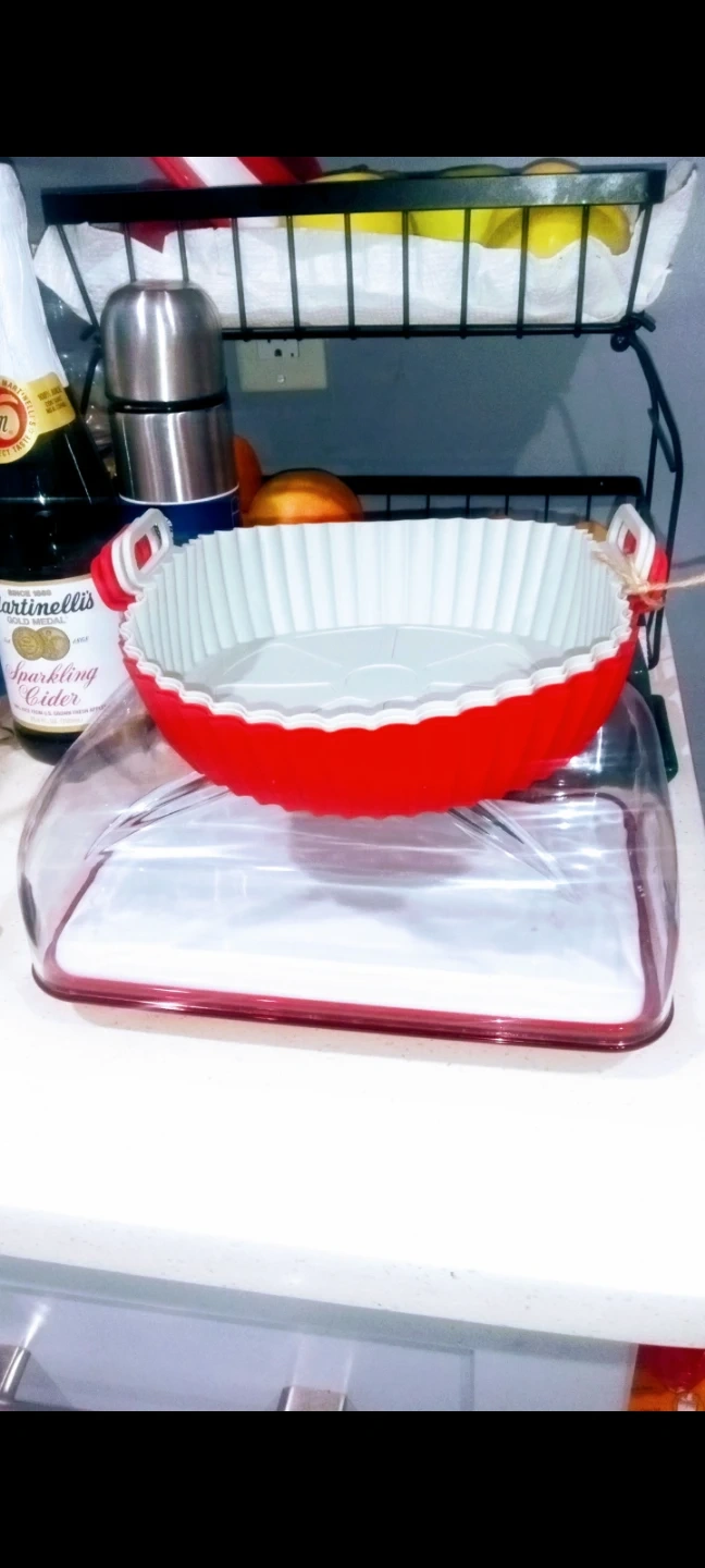 Ceramic pie dish with red scalloped edges and a clear plastic lid. It's perfect for baking and serving pies or quiches! Dish is oven safe.