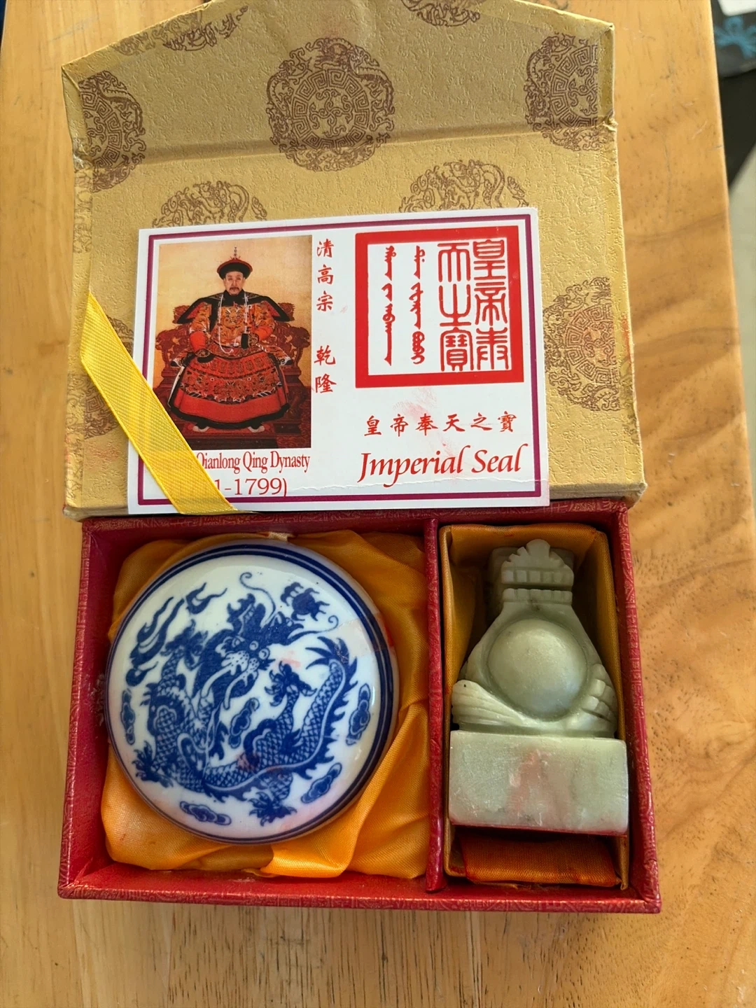 Selling a Qianlong Qing Dynasty Imperial Seal. It comes with the original box and includes the seal and a ceramic dish with a dragon design. This is a beautiful piece!