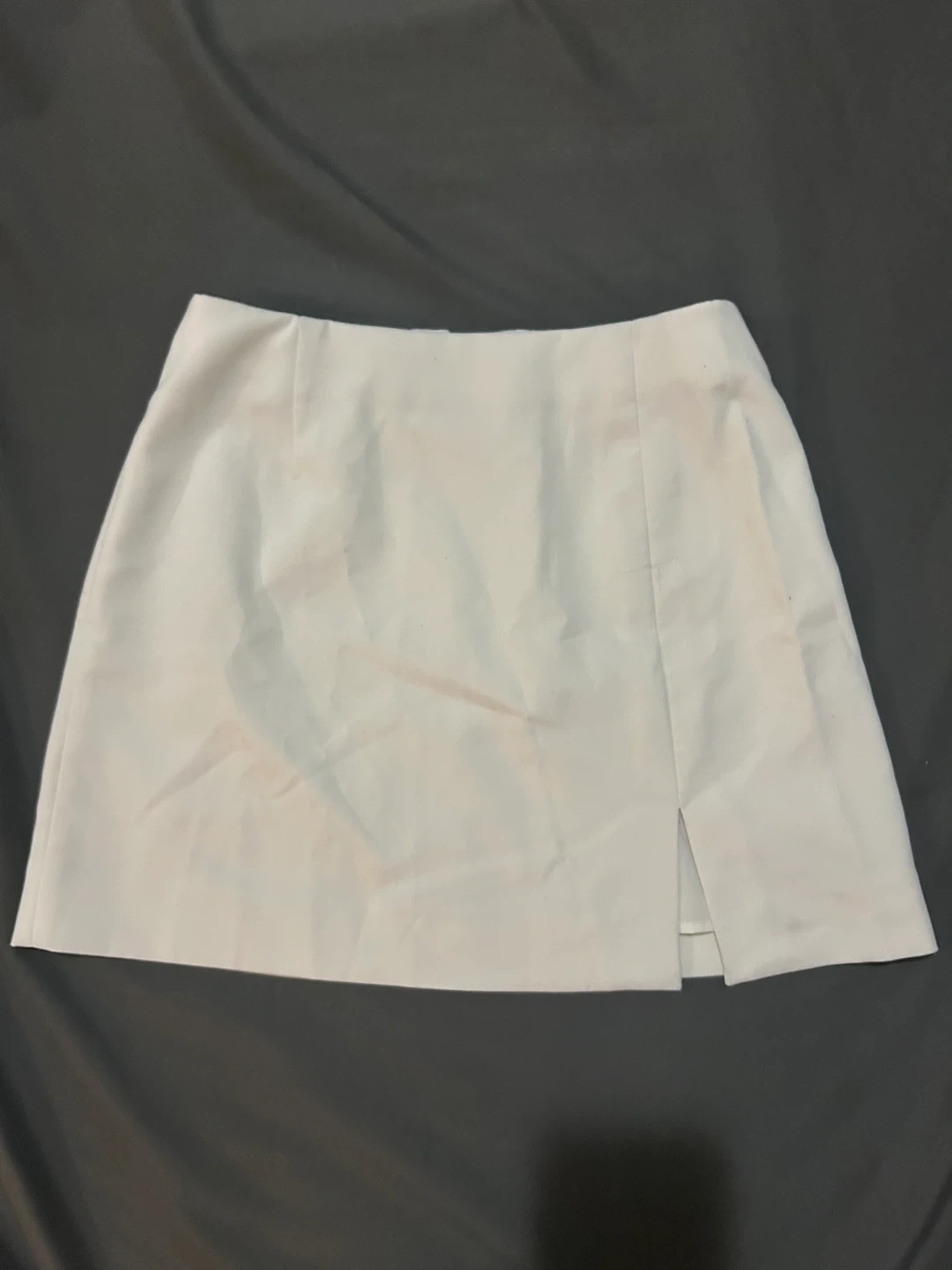 A cute white mini skirt with a slit on one side. Perfect for summer or going out! It's in great condition. Tag was cut out for comfortability when wearing.