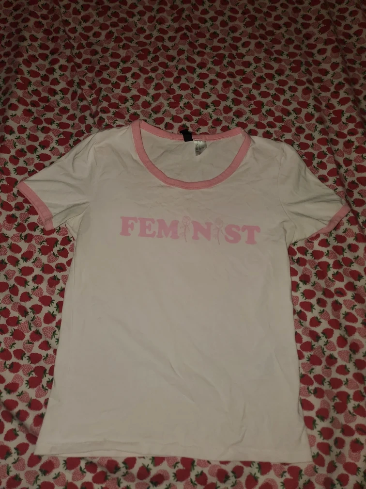 Selling a H&M Divided t-shirt! It's pink with trim and has the word 'Feminist' printed on the front. The size is S.