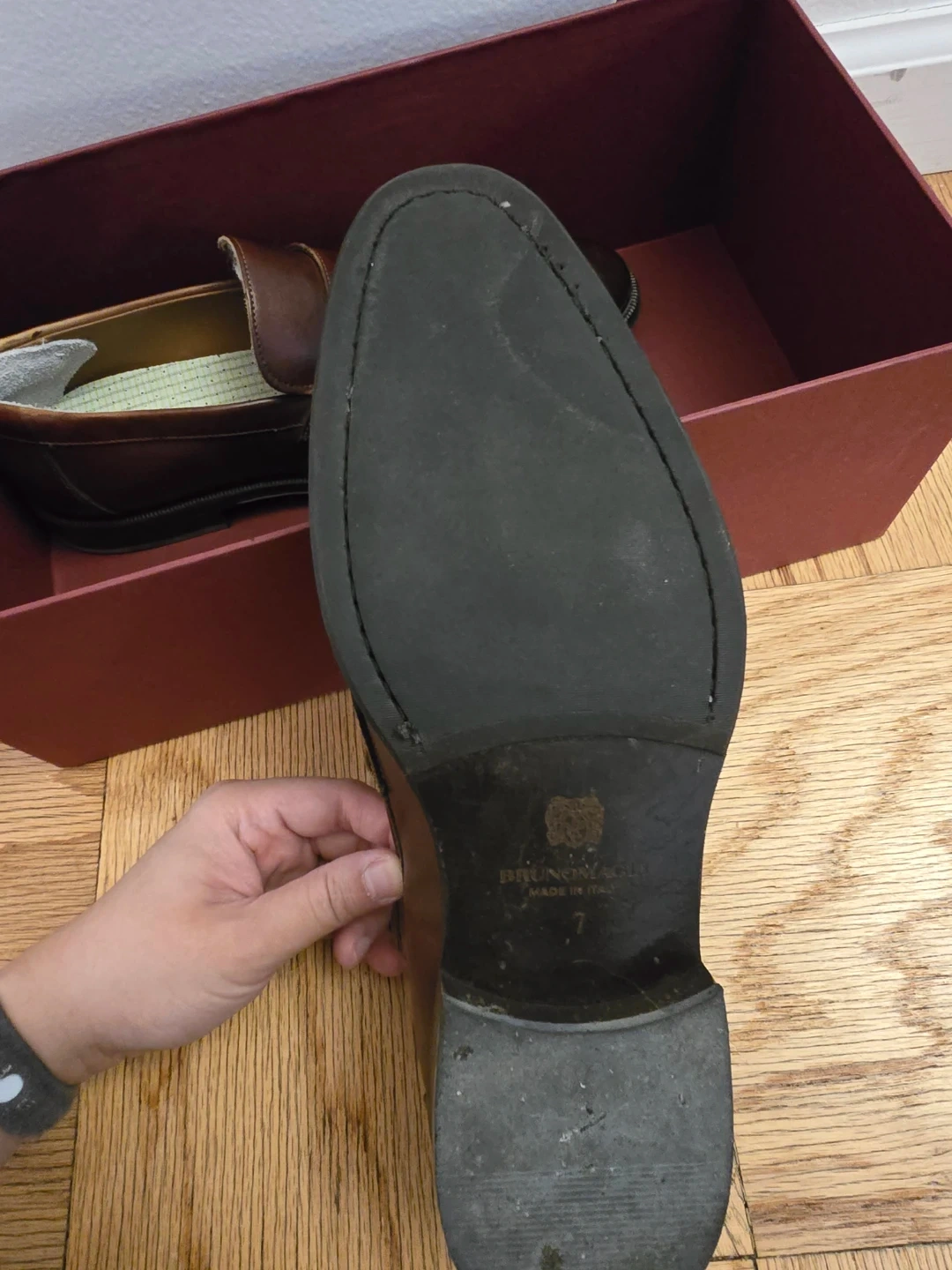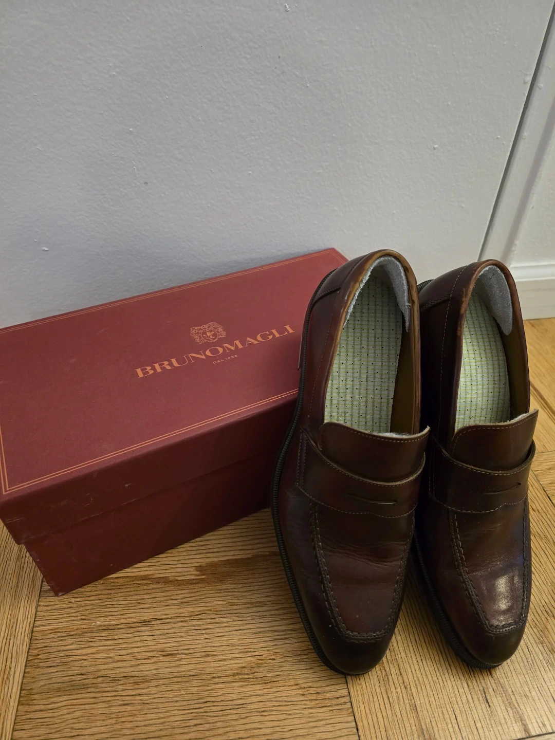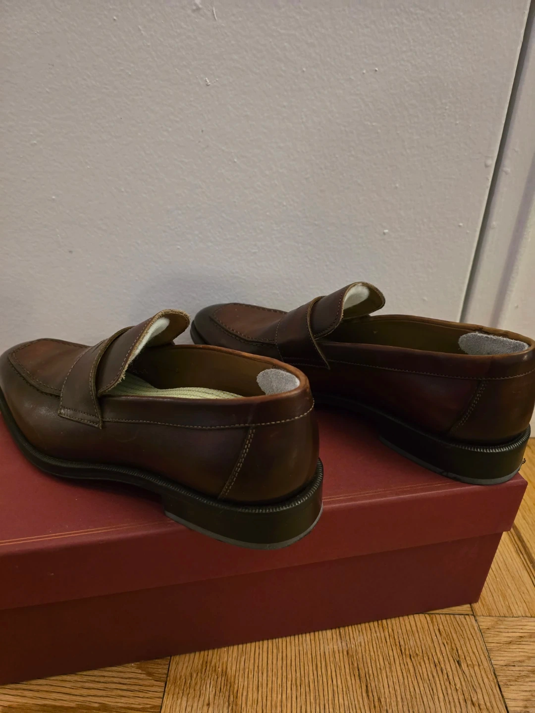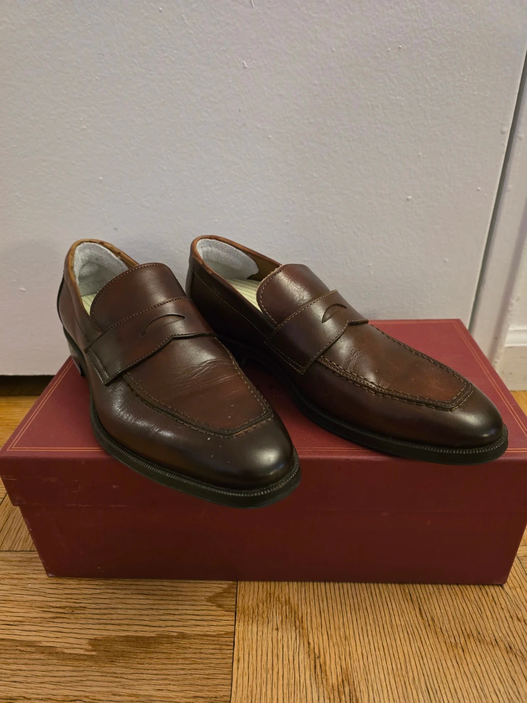 Selling Bruno Magli men's loafers in a rich brown leather. They're a slip-on style with a classic penny loafer strap across the vamp. The shoes come with their original box. Only worn ONCE for a wedding.
