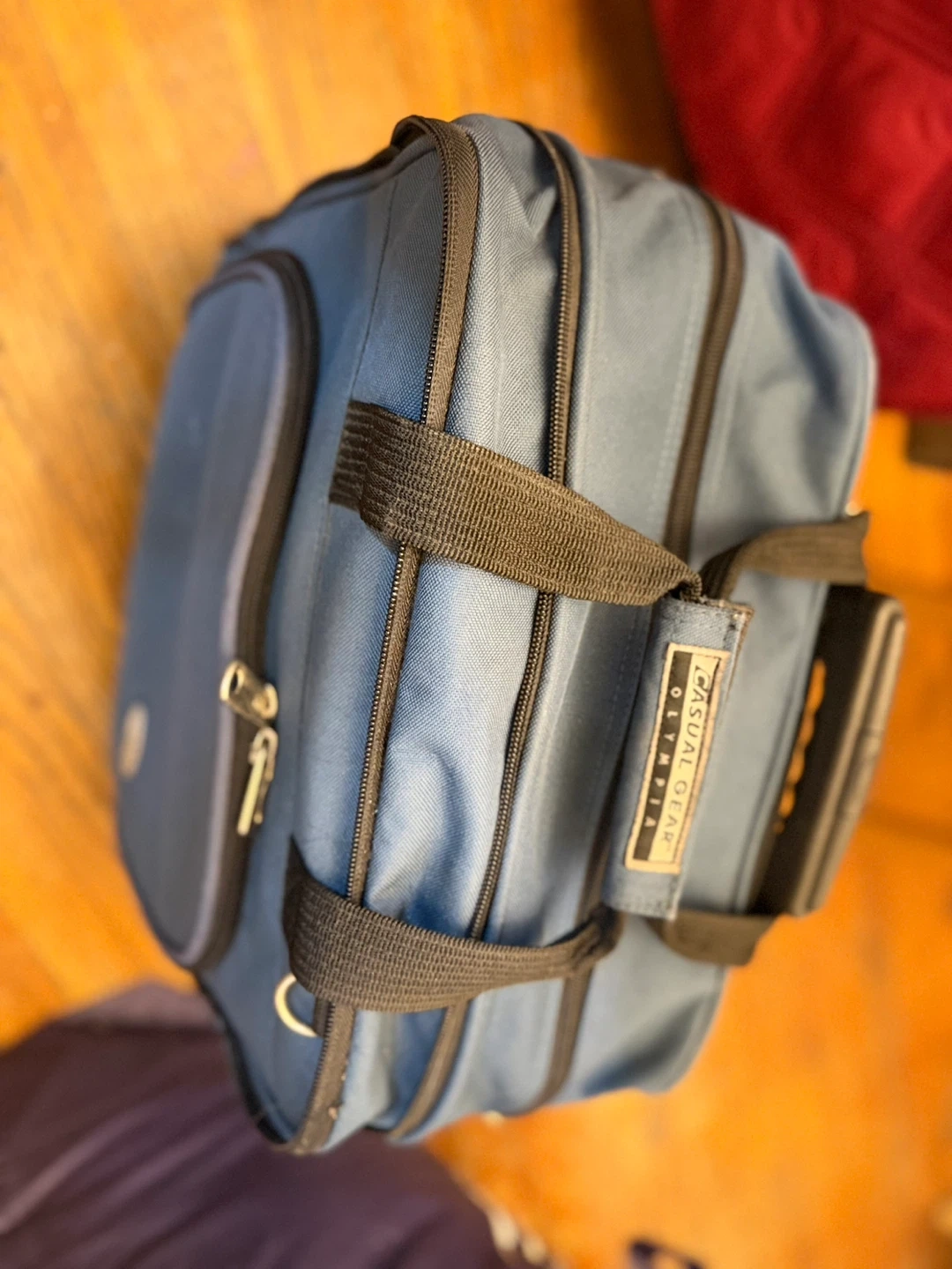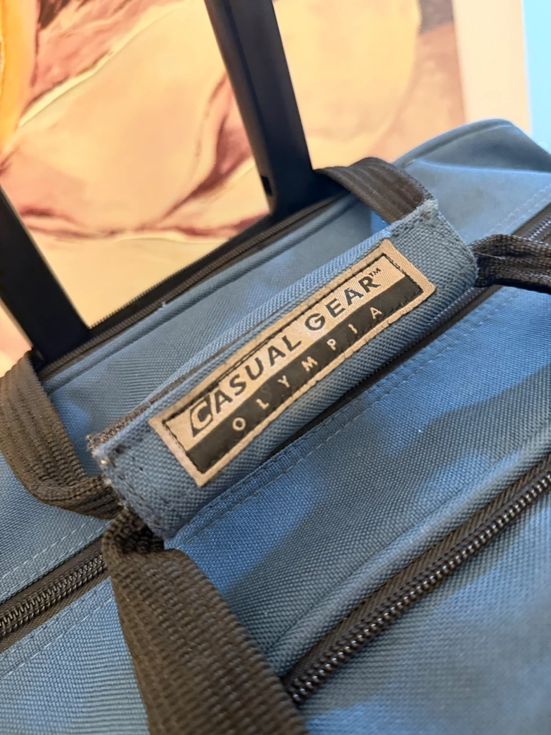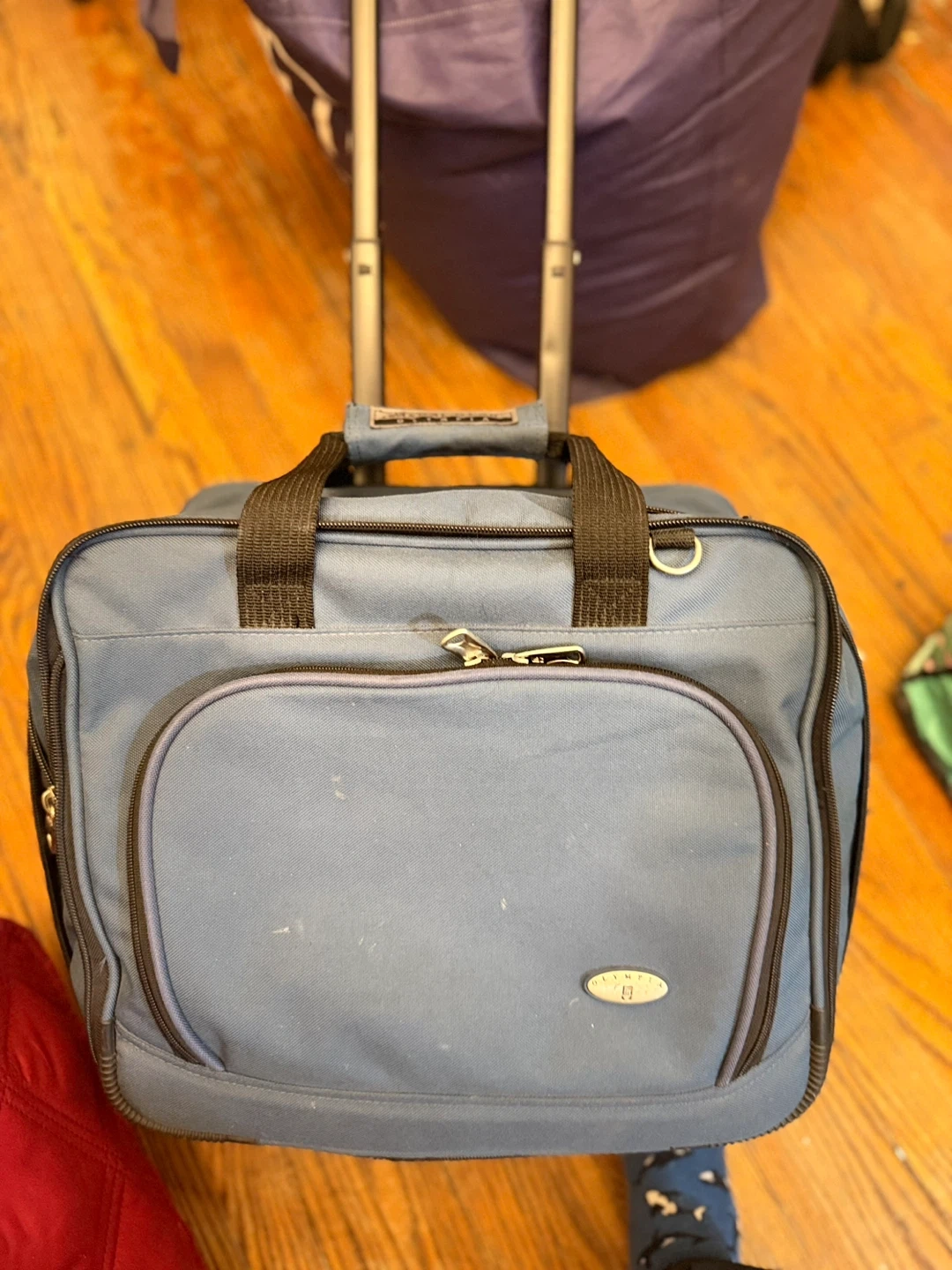 This blue rolling carry-on bag from Casual Gear Olympia is great for travel! It's made of durable fabric with sturdy zippers and comfortable handles. Features a telescoping handle for easy transport.