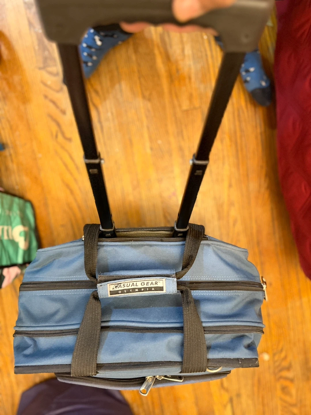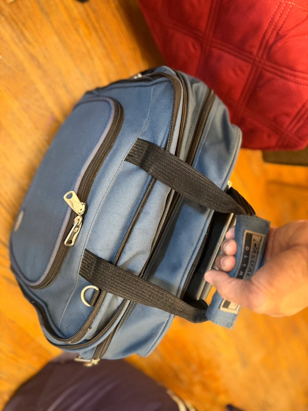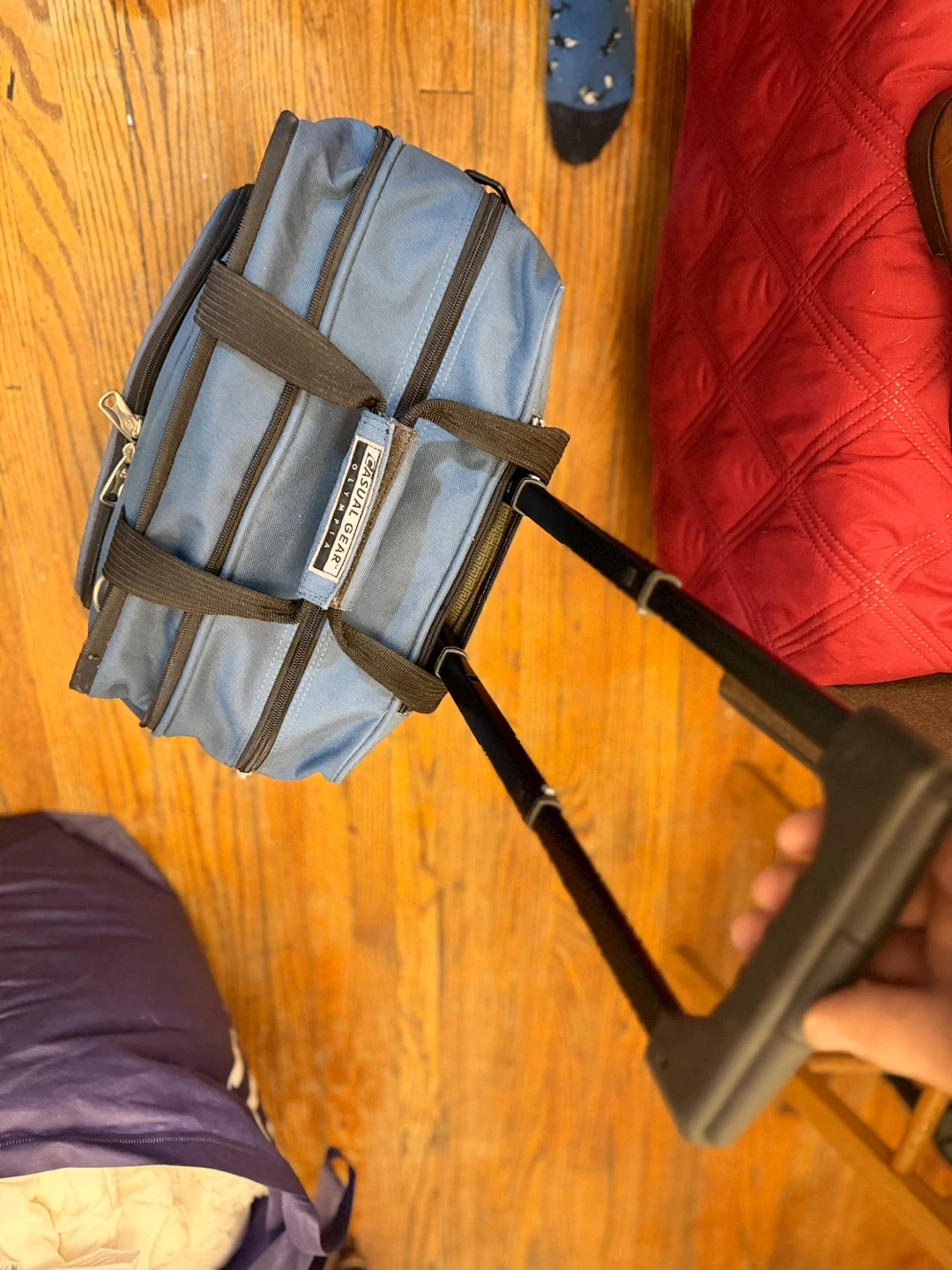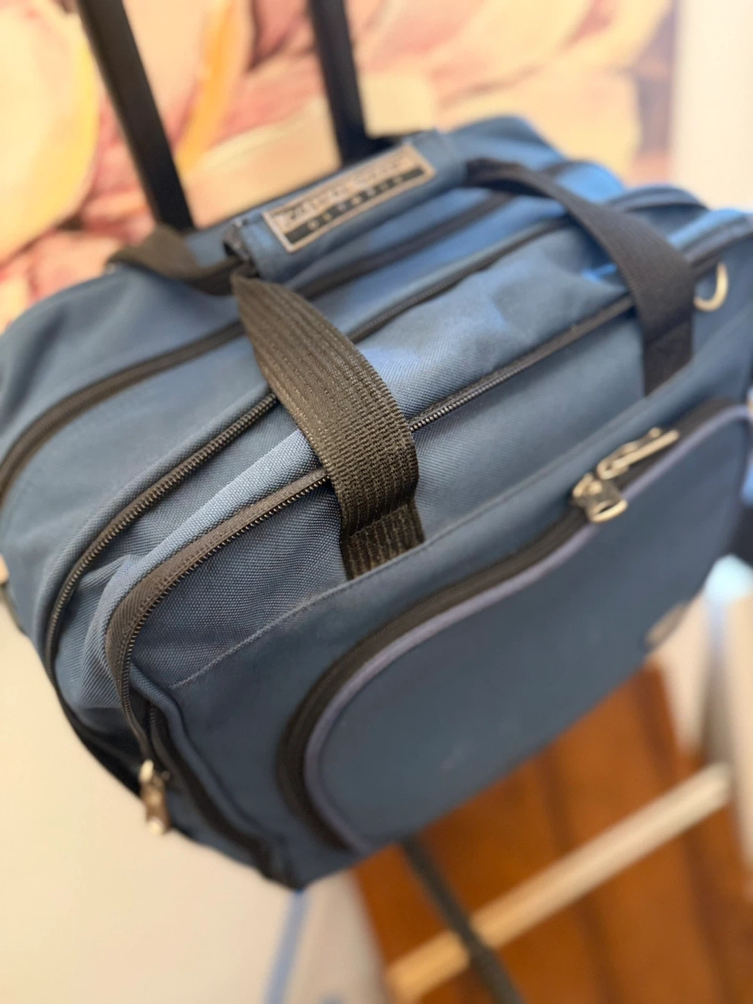 This blue rolling carry-on bag from Casual Gear Olympia is great for travel! It's made of durable fabric with sturdy zippers and comfortable handles. Features a telescoping handle for easy transport.