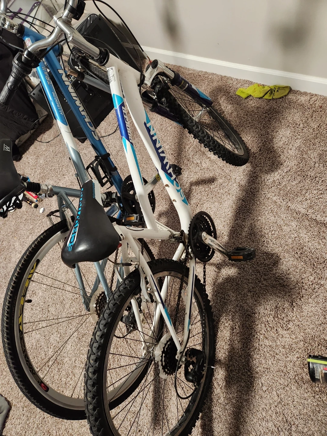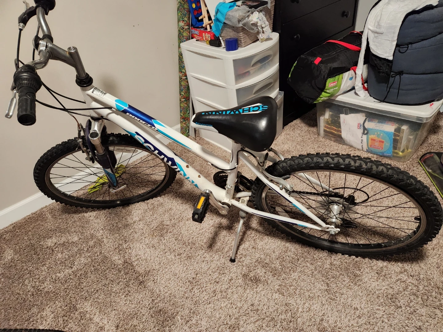 This is a white and blue Schwinn mountain bike. It has a black seat with Schwinn branding. Tires are knobby for off-road use. Ready for your next trail ride! Had it cleaned and greased up already.