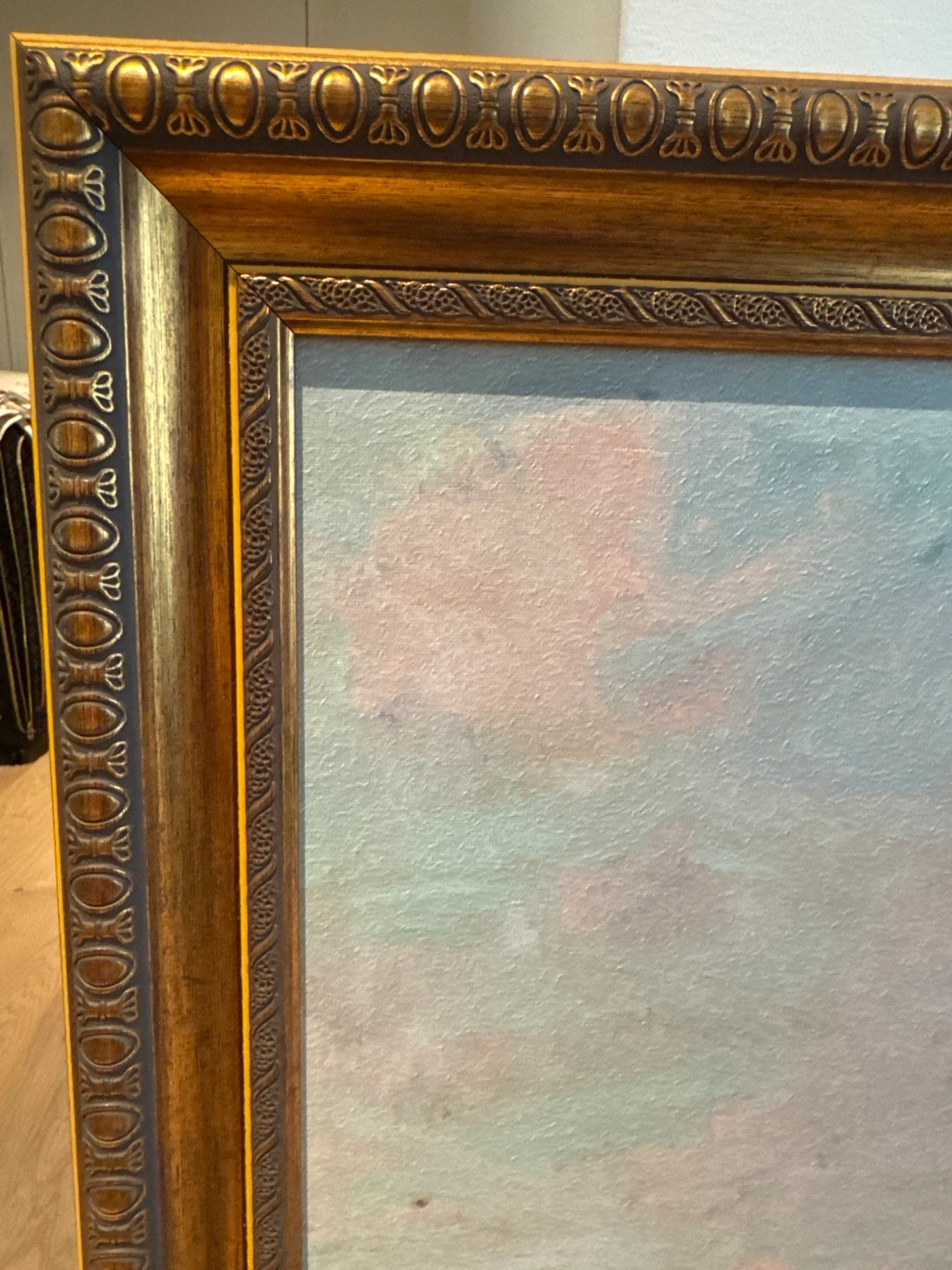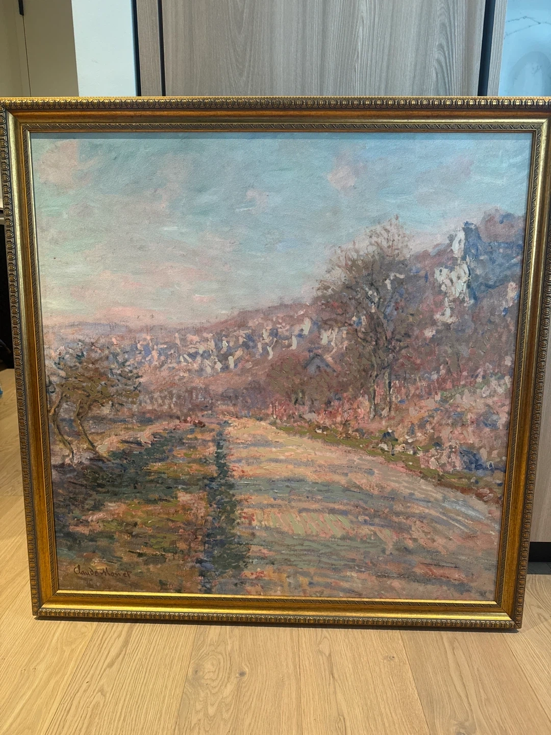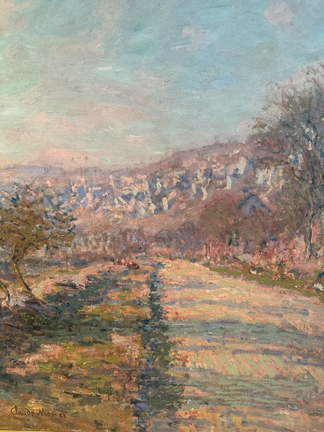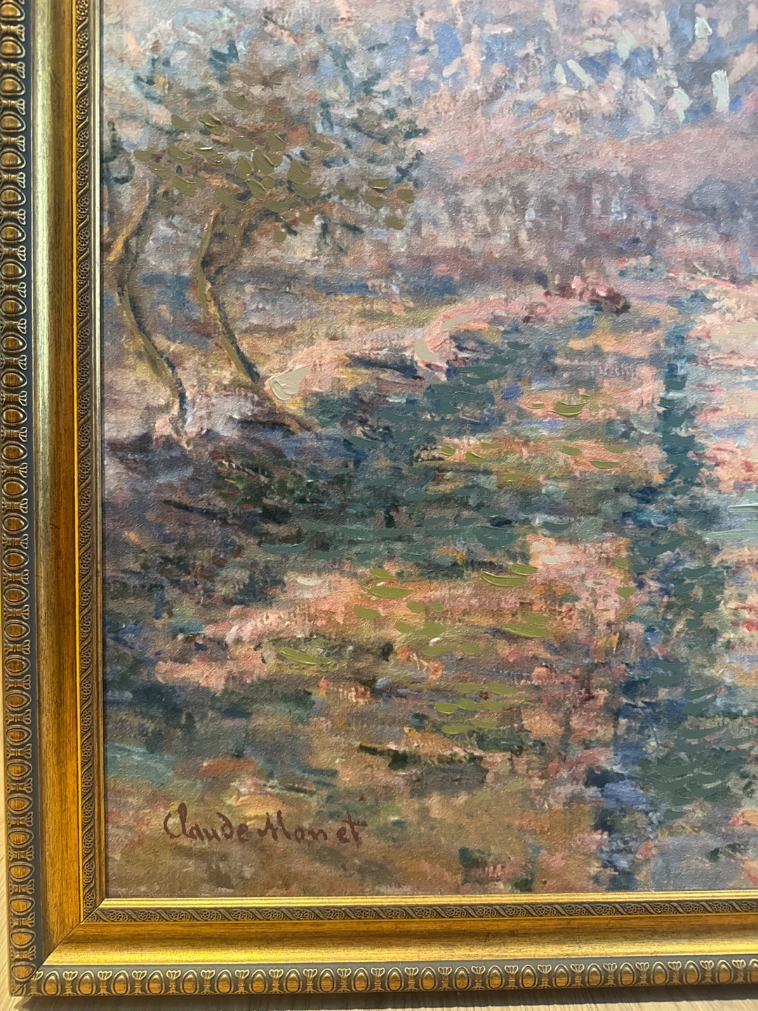 Beautiful landscape painting in the style of Claude Monet. Features a serene countryside scene with a village in the background. Framed and ready to hang!