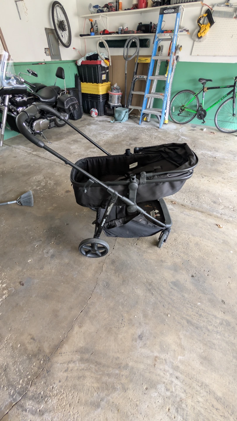 This is a black baby stroller. It's made of durable fabric and metal. It features a storage basket underneath for your essentials.